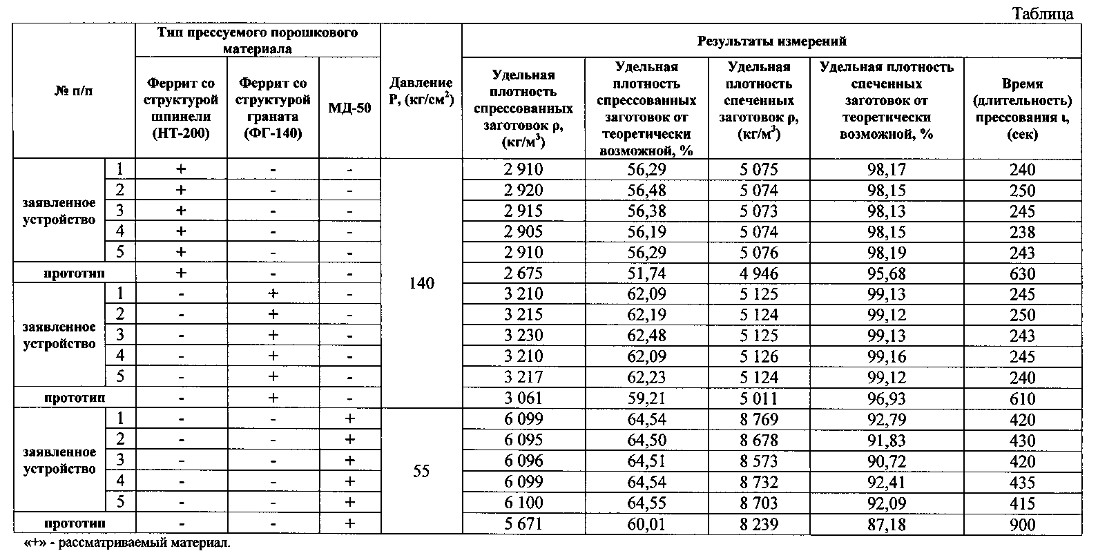Изобретение относится к порошковой металлургии, а именно к устройствам для прессования изделий из порошкового материала, прежде всего тугоплавких и керамических материалов, и предназначено прежде всего для прессования изделий электронной техники. Известно устройство для прессования изделий из порошкового материала, содержащее подвижную и неподвижную плиты, верхний и нижний пуансоны и прессующий блок, в котором установлена матрица с подвижными стенками, при этом прессующий блок выполнен состоящим из двух частей, из которых верхняя закреплена на подвижной плите, а нижняя - на неподвижной, причем одна из частей прессующего блока снабжена приводом перемещения нижнего пуансона в плоскости, ортогональной направлению перемещения подвижной плиты. В котором с целью повышения качества путем увеличения плотности спрессованной заготовки и повышения однородности ее распределения по объему заготовкипрессующий блок снабжен двумя каретками, установленными в направляющих с возможностью перемещения во взаимно ортогональных направлениях, причем одна из кареток установлена в направляющих второй каретки, каждая из частей блока снабжена четырьмя профилированными опорами, матрица выполнена в виде четырех формующих элементов с плоскими рабочими поверхностями, закрепленных на профилированных опорах и образующих своими рабочими поверхностями замкнутый контур, а каждый из формующих элементов выполнен со щелевой направляющей, перпендикулярной его рабочей поверхности, и хвостовиком, установленным в щелевой направляющей соседнего элемента, при этом рабочая поверхность формующего элемента совпадает с одной из поверхностей его хвостовика. Причем каждая из опор прессующего блока выполнена с двумя профилированными поверхностями, образующая каждого из сечений профилированной поверхности плоскостью, ортогональной ближайшему ребру торцевой поверхности пуансона, представляет собой окружность с радиусом, равным длине перпендикуляра, опущенного из любой точки поверхности опоры на соответствующее ребро торцевой поверхности пуансона [Патент РФ №2243853, МПК B22F 3/02, приоритет 21.04.2003, опубликовано 10.01.2005]. Недостатками данного устройства для прессования изделий из порошкового материала являются: во-первых, сложность устройства и соответственно высокая его стоимость, во-вторых, невысокое качество из-за очевидно низкой однородности распределения плотности по всей поверхности образца заготовки, в-третьих, высокая стоимость эксплуатации вследствие повышенной изнашиваемости сложных элементов устройства и соответственно требующих их частой замены с соответствующим достаточно сложным их подгоном. Известен способ прессования штабиков из порошка тугоплавких металлов и пресс-форма для их прессования. Последняя содержит вертикальный пуансон, боковину и нижнюю плиту. Которая с целью повышения качества путем приложения к порошку тугоплавких металлов дополнительного сжимающего усилия в горизонтальном направлении дополнительно содержит горизонтальный пуансон, контактирующий рабочей поверхностью с торцовой поверхностью вертикального пуансона, установленного в корпусе пресс-формы с возможностью горизонтального перемещения, при этом нижняя плита контактирует своей торцовой поверхностью с рабочей поверхностью боковины, которая 