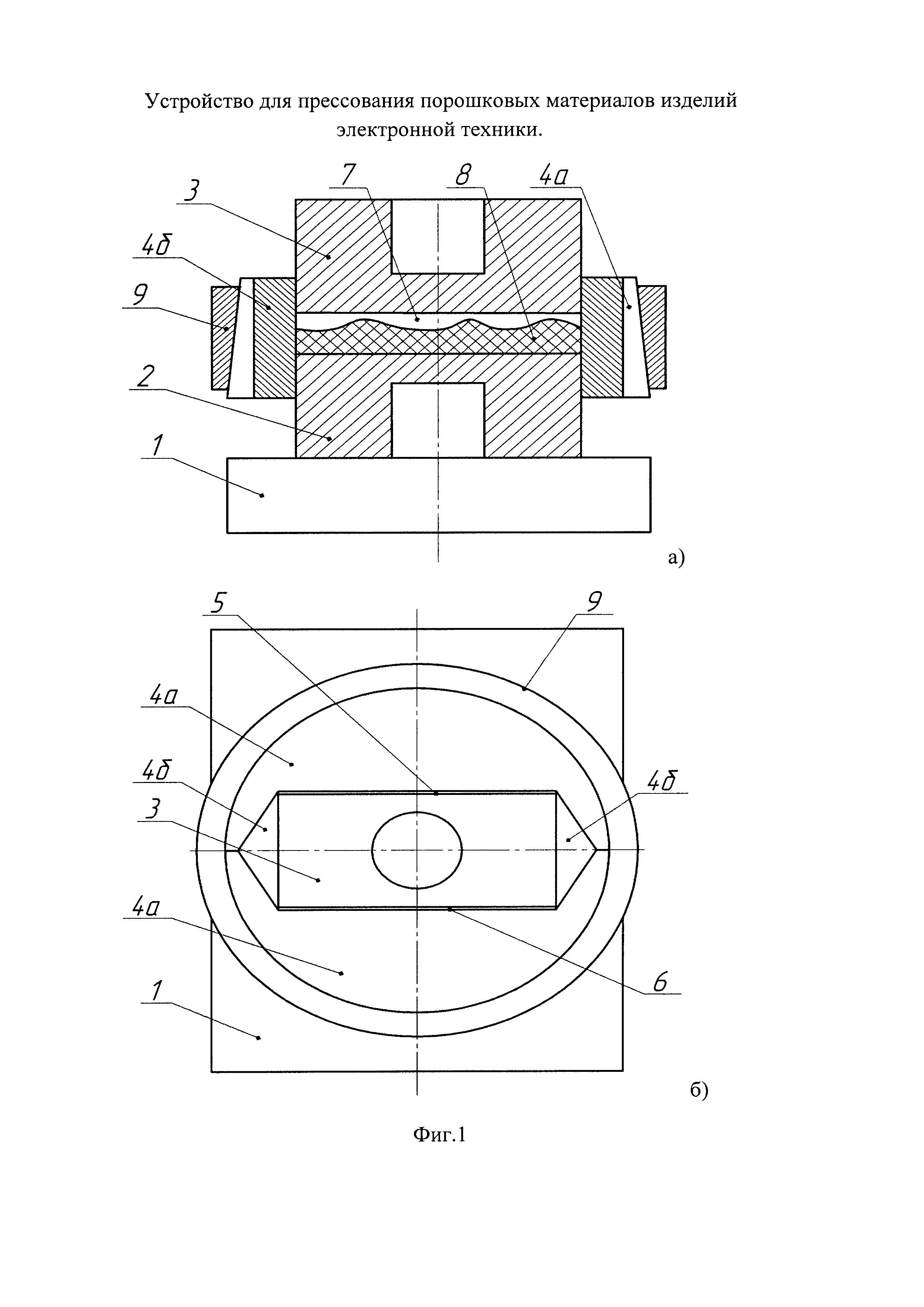 1. Устройство для прессования изделий электронной техники из порошкового материала, содержащее расположенное горизонтально основание пресса, два пуансона и матрицу, выполненную из частей с образованием замкнутой рабочей полости для прессуемого порошкового материала, отличающееся тем, что оно содержит нижний пуансон, размещенный основанием на горизонтальной поверхности основания пресса, и верхний пуансон, причем нижний и верхний пуансоны выполнены в виде прямоугольных параллелепипедов равной или различной высоты и с равными по длине и ширине основаниями, матрица состоит из четырех частей, две из которых выполнены в виде половин полого усеченного конуса конусностью не более 5° и размещены на расстоянии не менее 10×10-3 м от горизонтальной поверхности основания пресса, причем поперечное сечение в горизонтальной плоскости внутренней поверхности каждой из двух половин представляет равнобедренную трапецию с малым основанием, равным длине основания пуансона, а две другие части матрицы расположены внутри по торцам упомянутых двух частей матрицы в виде половин полого усеченного конуса, и выполнены в виде прямых треугольных призм, причем длина стороны основания призмы равна ширине основания пуансонов, а длина боковой стороны призмы равна боковой стороне упомянутой равнобедренной трапеции, при этом матрица с внешней стороны дополнительно снабжена зажимным кольцом, внутренняя поверхность которого повторяет ее внешнюю поверхность, а с внутренней стороны каждая из двух частей матрицы, выполненных в виде половин полого усеченного конуса, снабжена упругодеформирующейся вставкой в виде прямоугольного параллелепипеда, длина которого равна длине малого основания упомянутой равнобедренной трапеции, а высота равна высоте упомянутой равнобедренной трапеции. 2. Устройство по п. 1, отличающееся тем, что оно предназначено для прессования порошковых керамических материалов, ферритовых материалов или тугоплавких металлов. 3. Устройство по п. 1, отличающееся тем, что высота пуансонов и матрицы определена с учетом типа прессуемого порошкового материала. 4. Устройство п. 1, отличающееся тем, что упругодеформирующиеся вставки выполнены из полиуретана. 5. Устройство по п. 1, отличающееся тем, что верхний и нижний пуансоны и части матрицы в виде половин полого усеченного конуса имеют полости.