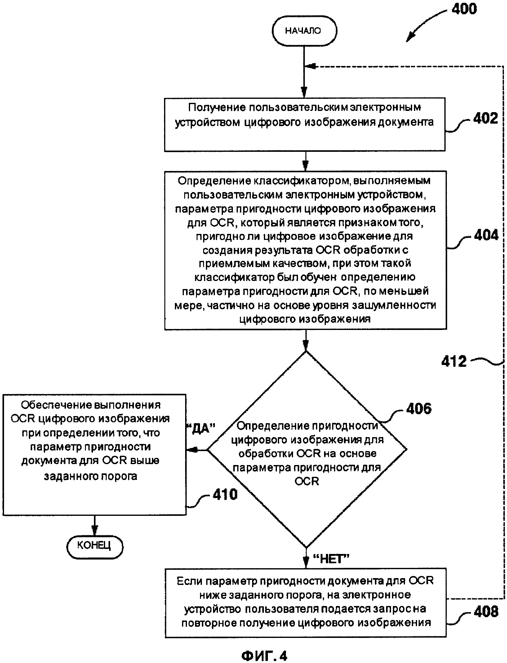 1. Способ анализа пригодности цифрового изображения для OCR, выполняемый пользовательским электронным устройством, содержащий: получение пользовательским электронным устройством цифрового изображения документа; определение с помощью классификатора на электронном устройстве пользователя параметра пригодности цифрового изображения для OCR, представляющего собой признак того, является ли цифровое изображение пригодным для создания результата OCR приемлемого качества, при этом указанный классификатор обучается на основании, по меньшей мере, прогнозируемого параметра зашумленности изображения для определения параметра пригодности документа для OCR и/или индикатора вероятности OCR и проходит валидацию после обучения указанного классификатора, при этом указанное определение параметра пригодности документа для OCR включает, по меньшей мере, определение контраста резких и/или фоновых пикселей слабоконтрастных текстовых блоков изображения; и если параметр пригодности документа для OCR и/или индикатор вероятности OCR ниже заданного порога, на электронном устройстве пользователя вызывается выполнение повторного получения цифрового изображения. 2. Способ по п. 1, отличающийся тем, что он дополнительно включает выполнение OCR цифрового изображения, если параметр пригодности документа для OCR выше заданного порога. 3. Способ по п. 2, отличающийся тем, что выполнение OCR включает выполнение пользовательским электронным устройством функции OCR локально для создания распознанного текстового цифрового документа, представляющего текст, содержащийся в указанном цифровом изображении. 4. Способ по п. 2, отличающийся тем, что выполнение OCR включает передачу данных пользовательским электронными устройством на сервер, выполненный с возможностью выполнения функции OCR на базе сервера для (i) создания распознанного текстового цифрового документа, представляющего текст исходного цифрового изображения, и (ii) передачи распознанного текстового документа на пользовательское электронное устройство. 5. Способ по п. 1, отличающийся тем, что классификатор реализован как алгоритм машинного обучения. 6. Способ по п. 5, дополнительно включающий обучение машинного алгоритма обучения. 7. Способ по п. 1, отличающийся тем, что определение параметра пригодности для OCR включает: создание контурного изображения из серой версии цифрового изображения; разделение серого цифрового изображения на неперекрывающиеся блоки; определение среднего контраста Ci в каждом блоке серого цифрового изображения; создание бинарной версии неперекрывающихся блоков серого цифрового изображения для определения контурных пикселей; определение текстовых блоков; определение контраста определение контраста определение средних значений определение уровня ошибок R, представляющего собой отношение сигнала, представленного контрастом контурных пикселей, к зашумленности, представленной контрастом фоновых пикселей, по формуле: где i представляет собой идентификатор связного блока. 8. Способ по п. 7, отличающийся тем, что уровень ошибок R используется в качестве параметра пригодности документа для OCR. 9. Способ по п. 7, отличающийся тем, что создание контурного изображения включает применение к серому цифровому изображению фильтра. 10. Способ по п. 9, отличающийся тем, что фильтр представлен а