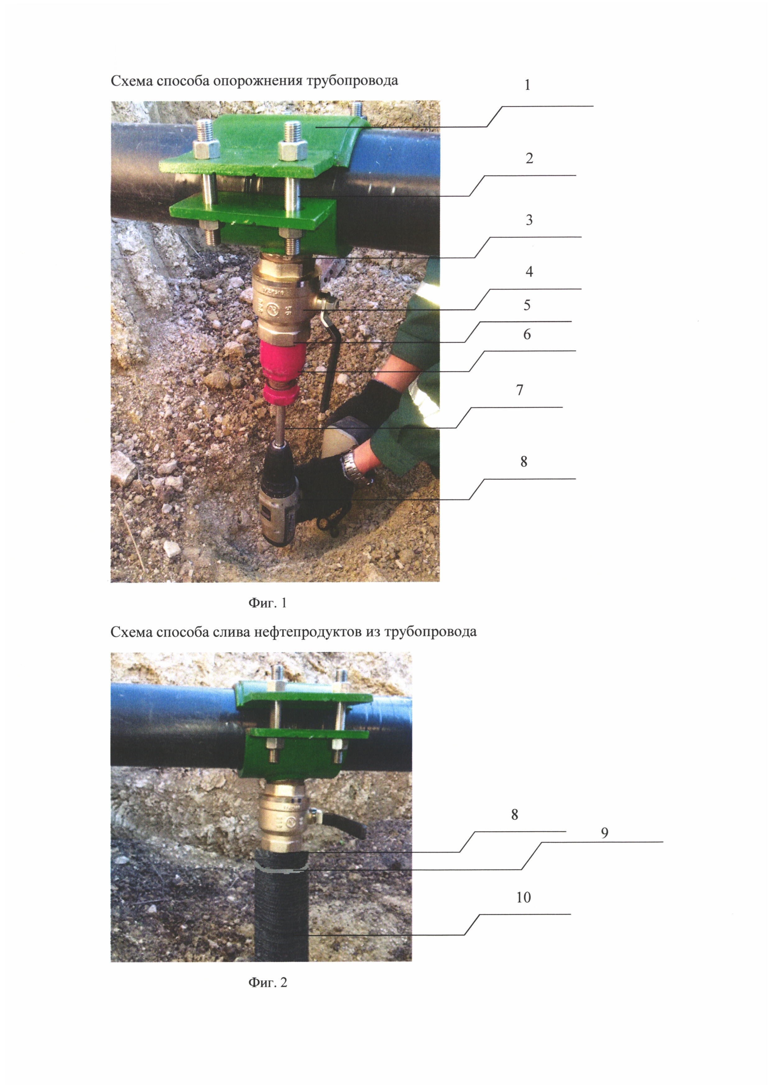 Изобретение относится к области трубопроводного транспорта и может быть использовано при технической эксплуатации действующих магистральных нефтепроводов. Известен способ аварийно-восстановительного ремонта магистральных нефтепроводов (А.Г. Гумеров, Х.А. Азметов, Р.С. Гумеров, М.Г. Векштейн. - Аварийно-восстановительный ремонт магистральных нефтепроводов // Под ред. А.Г. Гумерова. 1998. - 271 с.), состоящий в том, что в аварийном порядке производят перекрытие поврежденного участка трубопровода, врезку и прокладку обводной линии для возобновления перекачки. Основные же восстановительные работы по замене участка трубы выполняются в обычном ритме. Недостатком предлагаемого метода является то, что при подготовке к вскрытию участка поврежденного нефтепровода предусмотрена разработка земляной емкости для сбора вытекающего нефтепродукта, что повышает степень загрязнения окружающей среды. Известен способ опорожнения аварийного участка трубпопровода (патент РФ №1822921 А1 опубл. 23.06.1993 г.), достигаемый тем, что в одной из челюстей внутри на сменной защитной плите установлен кольцевой заряд кумулятивного действия, соединенный с источником электрической энергии, а снаружи установлен отвод, соединенный через две рожковидные трубы нижними торцевыми частями полости, образуемой челюстями и опорожняемой трубой. Недостатком данного изобретения является высокие материальные и трудозатраты, металлоемкость. Задачей, решаемой настоящим изобретением, является уменьшение временных и энергетических затрат на проведения процесса ремонтно-восстановительных работ нефтепромысловых трубопроводом, а также уменьшение воздействия на окружающую среду. Поставленная задача решается тем, что устройство в виде хомута, сделанного из толстостенной трубы необходимого диаметра, устанавливается в низшую точку трубопровода и резиновой прокладкой и фиксируется при помощи стяжных шпилек, к имеющемуся боковому отверстию на хомуте приваривается патрубок, а на другом его конце нарезается метрическая резьба и навинчивается полуоборотный шаровый кран, к которому с другой стороны вворачивается второй патрубок, внутри которого установлено коническое сверло с удлиненным цилиндрически валом, герметизацию которого обеспечивает грундбукса, находящаяся на конце патрубка, после выполнения сверления в трубопроводе патрубок с грундбуксой и коническим сверлом отворачиваются и заворачивается другой патрубок, к которому с помощью стяжного хомута присоединяется гибкий резиновый шланг вакуумной машины и происходит откачка нефти с трубопровода, что и позволяет исключить контакт нефтепродуктов с земляными резервуарами в целях повышения охраны окружающей среды. Заявленный способ бесшламового опорожнения трубопроводов при проведении ремонтно-восстановительных работ включает определение участка трубопровода для опорожнения от нефтепродуктов, установку хомута, выполненного из толстостенной трубы с целью исключения искривлений и прогибов при фиксации к трубопроводу, закрепляемого посредством стяжных шпилек, при чем между хомутом и трубопроводом устанавливается резиновая прокладка для усиления его посадки и исключения скольжения и нарушения целостности металлических корпусов, через боковое отверстие хомута сварным способом присоединяется патрубок