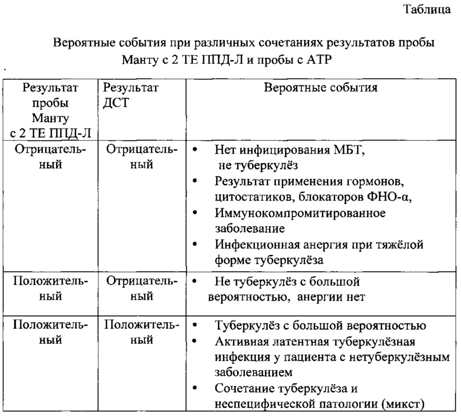 Способ дифференциальной диагностики туберкулеза и неспецифической патологии органов дыхания у детей и подростков, согласно которому проводят туберкулиновую пробу Манту с 2 ТЕ ППД-Л на одной руке пациента, через 72 часа определяют реакцию на туберкулиновую пробу Манту с 2 ТЕ ППД и фиксируют или отрицательную реакцию при отсутствии инфильтрата и гиперемии, или сомнительную реакцию при инфильтрате диаметром 2-4 мм или только гиперемии любого размера, или положительную реакцию при наличии инфильтрата диаметром 5 мм и более, или резко положительную реакцию при инфильтрате диаметром 17 мм и более у детей и подростков и 21 мм и более у взрослых, а также при появлении везикулы, лимфангита или регионарного лимфаденита независимо от размера инфильтрата, отличающийся тем, что одновременно с туберкулиновой пробой Манту с 2 ТЕ ППД-Л на другой руке пациента проводят кожную пробу с аллергеном туберкулезным рекомбинантным Диаскинтест, и через 72 часа одновременно с определением реакции на туберкулиновую пробу Манту с 2 ТЕ ППД-Л определяют реакцию на кожную пробу с аллергеном туберкулезным рекомбинантным Диаскинтест, и фиксируют или отрицательную реакцию при отсутствии следа или точечного следа или синяка до 2 мм, или сомнительную реакцию при гиперемии любого размера, или положительную реакцию при наличии папулы любого размера, а затем проводят совокупную оценку результатов реакции на пробу Манту с 2 ТЕ ППД-Л и результатов реакции на кожную пробу с аллергеном туберкулезным рекомбинантным Диаскинтест, при которой у пациентов при отрицательных результатах по обоим тестам диагностируют или отсутствие инфицирования микобактериями туберкулеза, или как результат применения гормонов, цитостатиков, блокаторов ФНО-α, или иммунокомпрометированное заболевание, или инфекционную анергию, обусловленную тяжелой формой туберкулеза, при положительном результате реакции на пробу Манту с 2 ТЕ ППД-Л и отрицательном результате реакции на кожную пробу с аллергеном туберкулезным рекомбинантным Диаскинтест диагностируют нетуберкулезное заболевание органов дыхания и отсутствие анергии, а при наличии положительных результатов реакции обоих тестов диагностируют активный туберкулез.