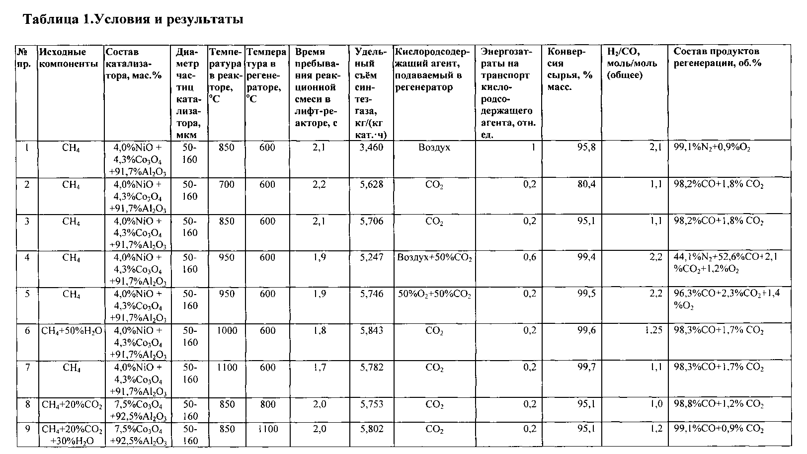 1. Способ получения синтез-газа, включающий окислительную конверсию метансодержащего сырья при температуре более 650°C в реакторе с использованием в качестве окислителя микросферического или дробленого катализатора на основе оксидов металлов, способных к многократным окислительно-восстановительным переходам, и регенерацию восстановленного катализатора путем его окисления кислородсодержащим агентом в регенераторе, из которого регенерированный катализатор поступает в реактор, отличающийся тем, что окислительную конверсию проводят в сквознопоточном лифт-реакторе, через который катализатор непрерывно проходит снизу вверх в потоке метансодержащего сырья при времени пребывания сырья в зоне реакции 0,1-10 с, затем выходящий из реактора восстановленный катализатор отделяют от продукта - синтез-газа и направляют в регенератор, где в качестве кислородсодержащего агента используют диоксид углерода, причем окислительную конверсию метансодержащего сырья и регенерацию восстановленного катализатора проводят параллельно и непрерывно. 2. Способ по п. 1, отличающийся тем, что окислительную конверсию проводят при температуре 850-1100°C. 3. Способ по п. 2, отличающийся тем, что окислительную конверсию проводят при температуре 850°С. 4. Способ по одному из пп. 1-3, отличающийся тем, что регенерацию катализатора проводят в псевдоожиженном, или форсированном псевдоожиженном, или полусквозном потоке. 5. Способ по п. 4, отличающийся тем, что в качестве кислородсодержащего агента дополнительно используют кислород или воздух путем добавления его к диоксиду углерода. 6. Способ по п. 4, отличающийся тем, что полученный газ регенерации смешивают с газом, выходящим из реактора, с получением синтез-газа. 7. Способ по одному из пп. 1-3, отличающийся тем, что в лифт-реактор дополнительно подают водяной пар, или диоксид углерода, или их смесь.