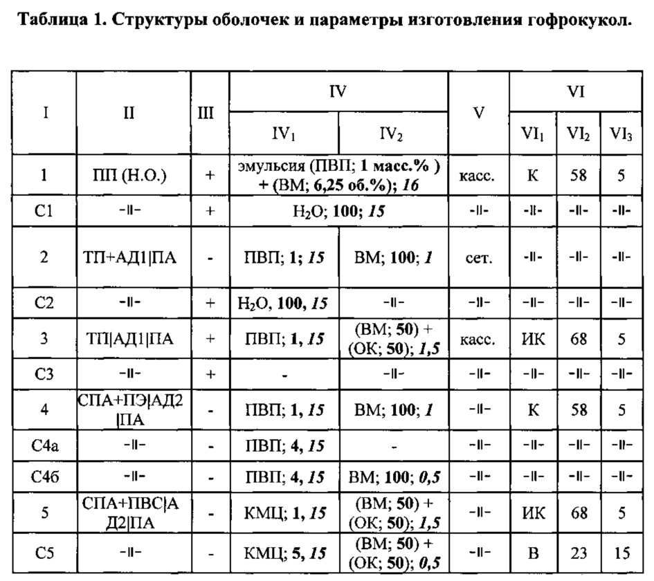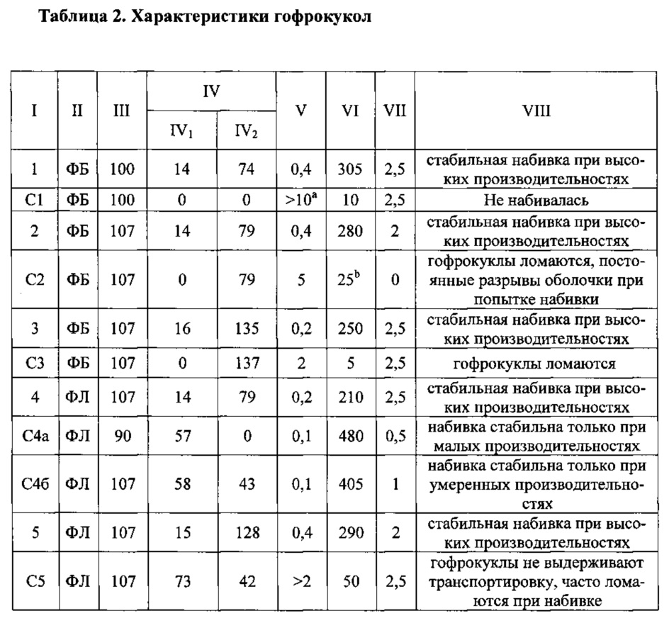 , Чешская Республика), оснащенной гофрирующим шнеком и одной распылительной системой, перед собственно гофрированием оболочку с внешней стороны опрыскивают эмульсией, полученной перемешиванием 1%-ного водного раствора ПВП и ВМ, взятых в объемном соотношении 15:1. При скорости подачи эмульсии 16 мл/мин оболочку перемещают в гофраторе со скоростью 100 м/мин и перерабатывают в гофрокуклы, содержащие по 25 м рукавной оболочки. Полученные сырые и рыхлые гофрокуклы помещают в фиксирующую оснастку, выполненную в виде вышеописанных кассет оснащенных стержнями с резьбой, двумя шайбами и гайкой. После закручивания гайки длина каждой гофрокуклы уменьшалась примерно в 1,5 раза и становилась равной примерно 250 мм. После этого гофрокуклы в кассете перемещают в конвекционную печь с температурой 60°С и скоростью циркуляции воздуха 8 м/сек и сушат в течение 5 минут. Температура поверхности кукол на выходе составляет 58°С. Затем гофрокуклы охлаждают в течение 45 мин при комнатной температуре, освобождают от оснастки и, после отбора образцов для испытаний, запаковывают для отправки на колбасный завод для промышленных испытаний, включая набивку колбасных изделий и автоматическое удаление оболочки при помощи пилера. Параметры процесса изготовления гофрированной оболочки и ее характеристики приведены в таблицах 1 и 2.