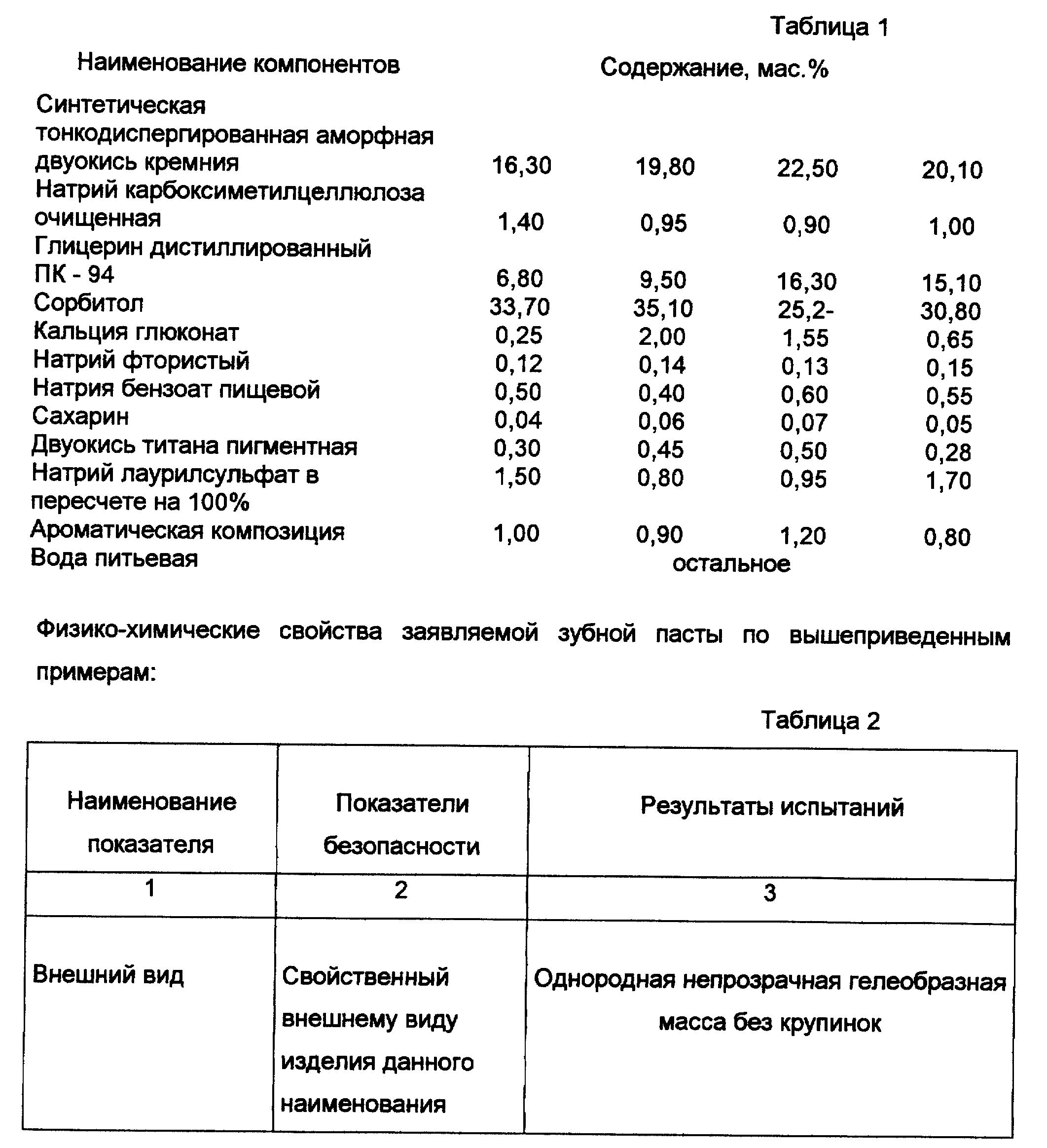 - двуокись титана пигментную, очищающий - натрий лаурилсульфат, ароматическую композицию и воду в следующих соотношениях, мас.%: Для укрепления твердой ткани зубов в состав зубной пасты введен глюконат кальция, являющийся источником ионов кальция, так