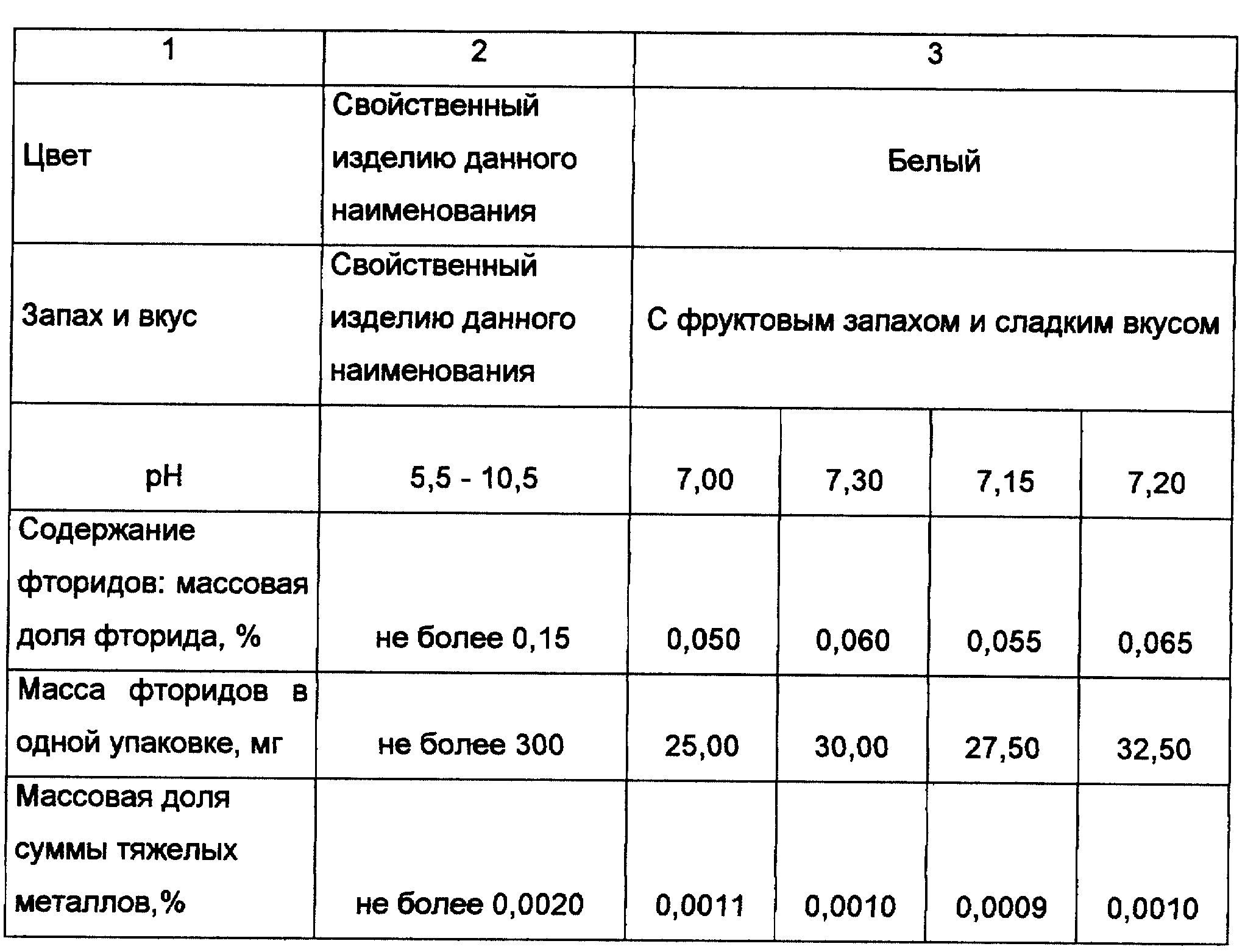 сахарин. Затем массу в течение 150 минут гомогенизируют, диспергируют, вакуумируют при остаточном давлении 50-60 мм рт.ст. и добавляют натрий лаурилсульфат и ароматическую композицию.