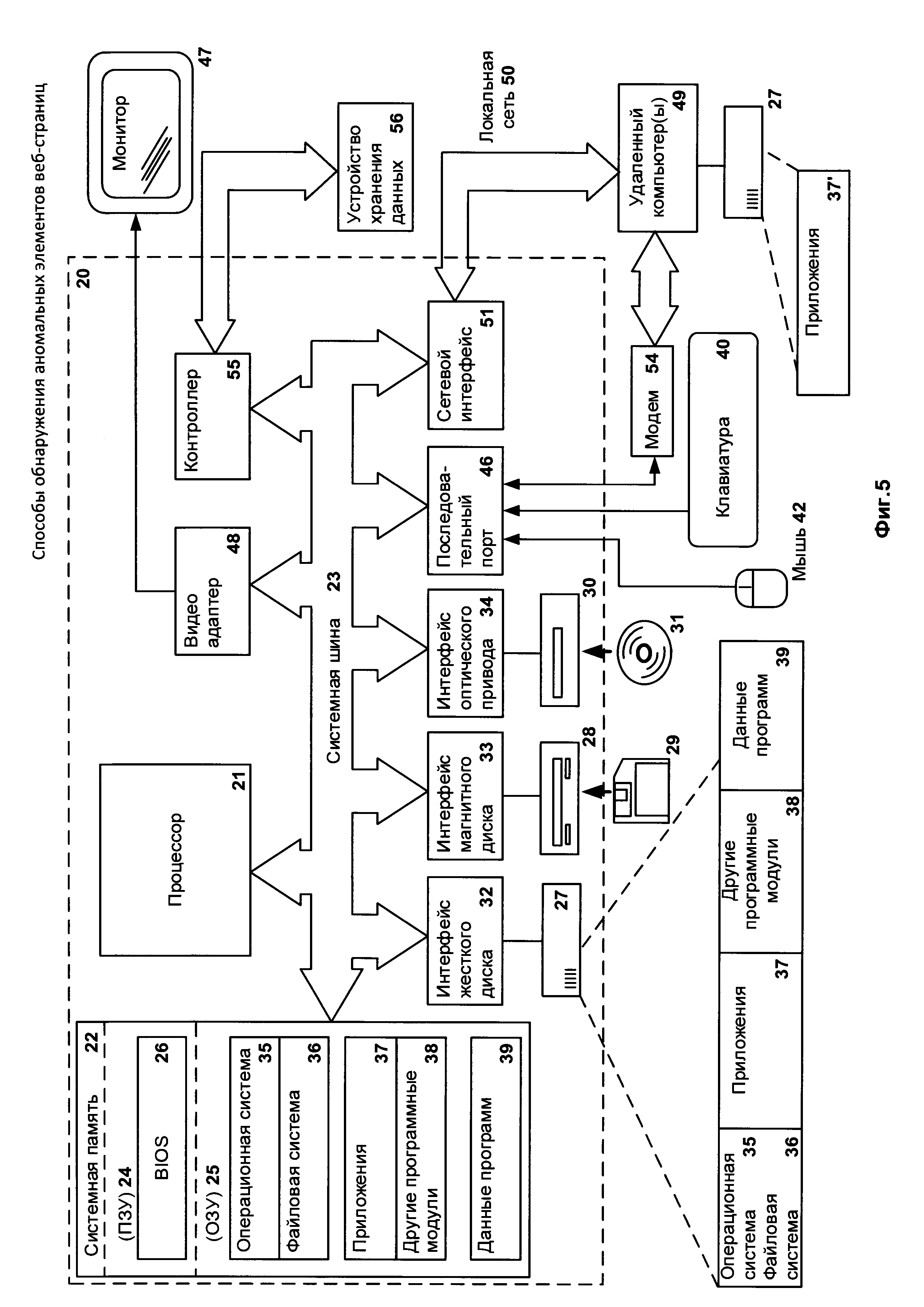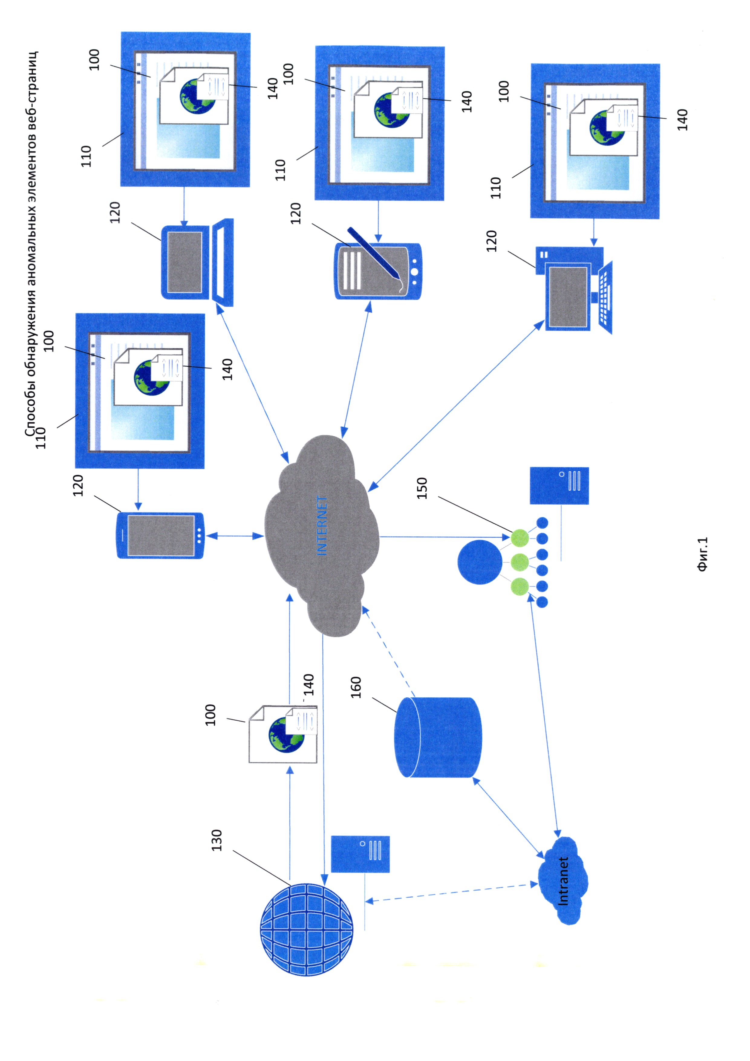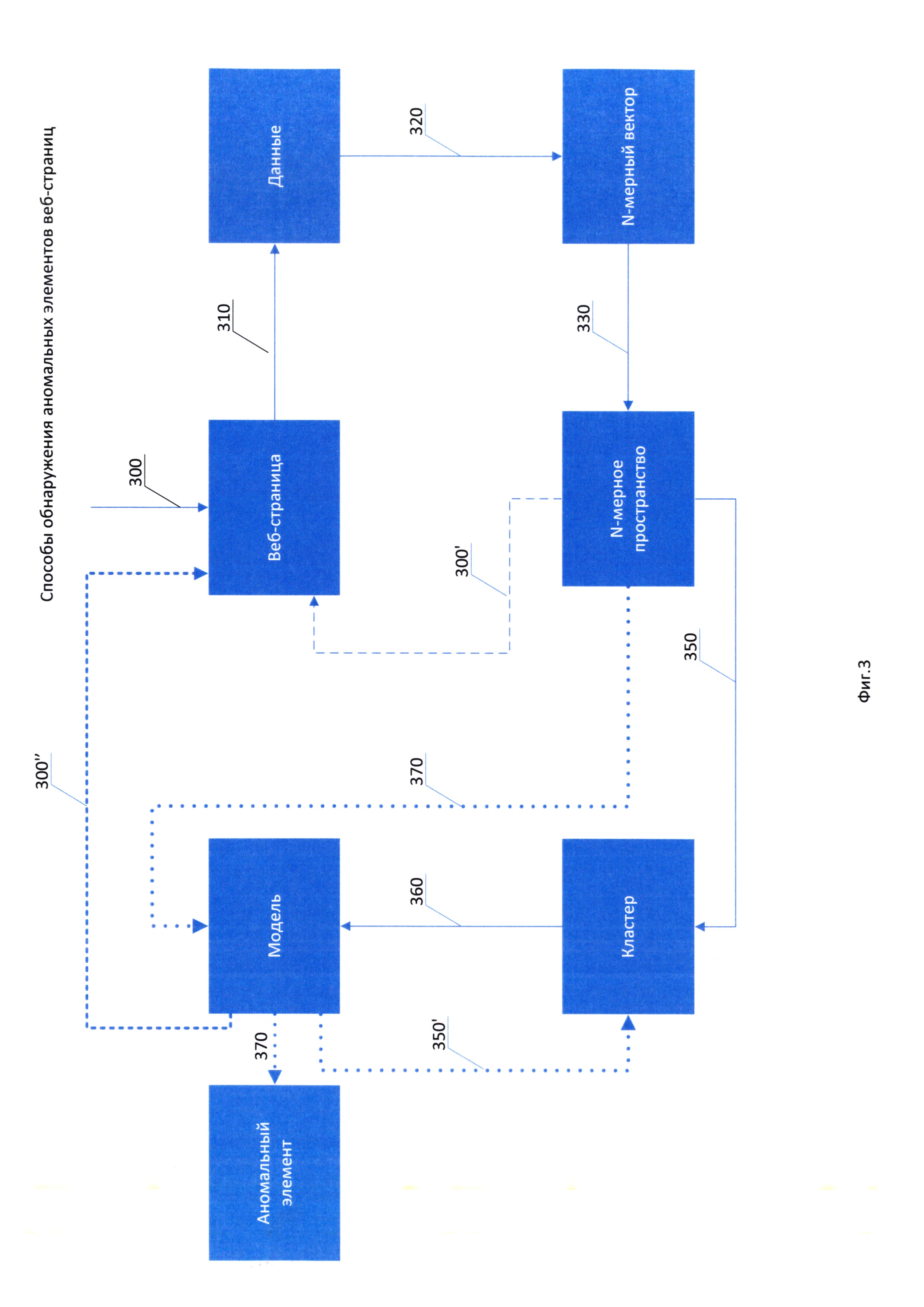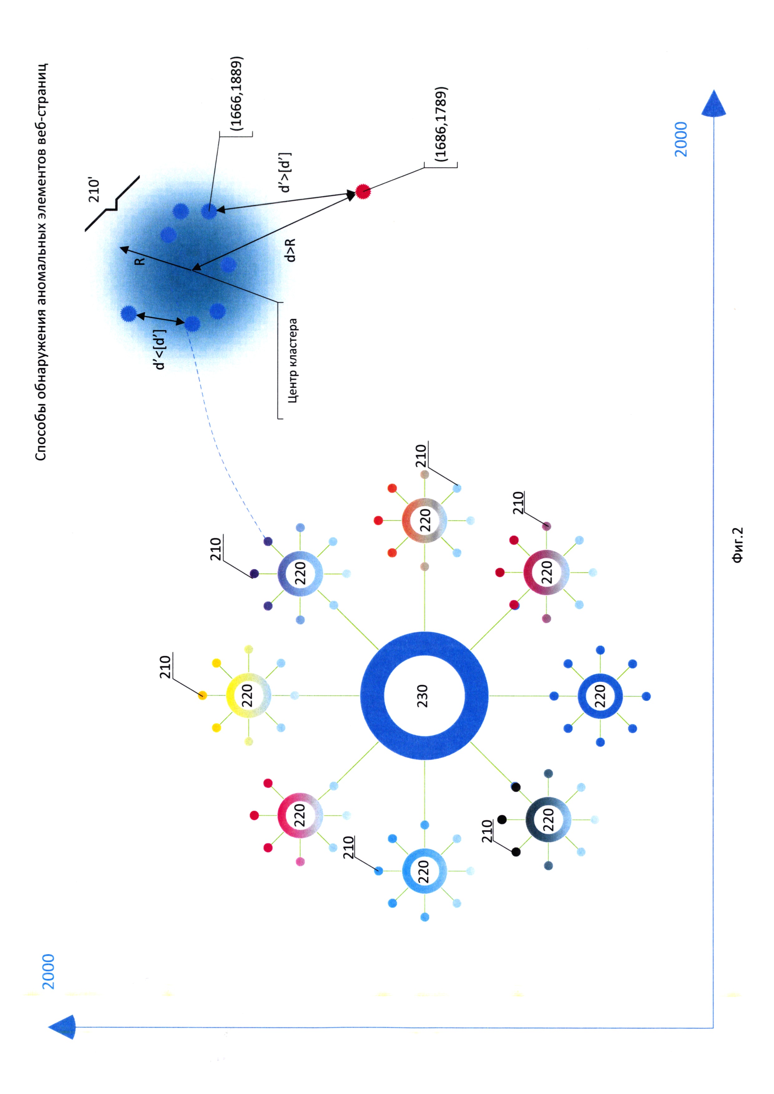1. Способ обнаружения аномального элемента веб-страницы на основании статистической модели веб-страницы, в котором: а) строят статистическую модель веб-страницы, где: - получают по меньшей мере одним веб-клиентом, реализованным на компьютерном устройстве пользователя, веб-страницу от веб-сервера, при этом веб-страница содержит скрипт, который при выполнении собирает сведения о содержимом по меньшей мере одного элемента веб-страницы на стороне веб-клиента и оправляет собранные сведения с компьютерного устройства пользователя серверу управления; - выполняют вышеуказанный скрипт с помощью веб-клиента, который собирает сведения о содержимом по меньшей мере одного элемента веб-страницы на стороне веб-клиента и отправляет собранные сведения с компьютерного устройства пользователя серверу управления; - преобразуют с помощью сервера управления полученные сведения в по меньшей мере один N-мерный вектор, где N-мерный вектор характеризует содержимое по меньшей мере одного элемента веб-страницы; - создают с помощью сервера управления статистическую модель веб-страницы, которая представляет собой по крайней мере один кластер в N-мерном пространстве, при этом кластер содержит по крайней мере один N-мерный вектор; б) обнаруживают аномальный элемент веб-страницы на основании построенной статистической модели веб-страницы, где: - получают по меньшей мере одним веб-клиентом, реализованным на компьютерном устройстве пользователя, веб-страницу от веб-сервера, при этом веб-страница содержит скрипт, который при выполнении собирает сведения о содержимом по меньшей мере одного элемента веб-страницы на стороне веб-клиента и оправляет собранные сведения с компьютерного устройства пользователя серверу управления; - выполняют вышеуказанный скрипт с помощью веб-клиента, который собирает сведения о содержимом по меньшей мере одного элемента веб-страницы на стороне веб-клиента и отправляет собранные сведения с компьютерного устройства пользователя серверу управления; - преобразуют с помощью сервера управления полученные сведения в по меньшей мере один N-мерный вектор, где N-мерный вектор характеризует содержимое по меньшей мере одного элемента веб-страницы; - сравнивают с помощью сервера управления полученный N-мерный вектор с кластерами статистической модели веб-страницы, где определяют расстояние между полученным N-мерным вектором элемента и центрами всех кластеров статистической модели; - обнаруживают с помощью сервера управления в результате сравнения аномальный элемент веб-страницы, где аномальным признается элемент, когда выполняется по крайней мере одно из следующих условий: 2. Способ по п. 1, в котором получаемая веб-страница при построении статистической модели веб-страницы заведомо не содержит аномальных элементов. 3. Способ по п. 1, в котором элементами веб-страницы, о содержимом которых собирают сведения, являются элементы, по меньшей мере, следующих видов: а) объекты: - апплеты; - скрипты; - машинный код; б) формы. 4. Способ по п. 3, в котором собираются сведения о содержимом по меньшей мере двух элементов веб-страницы. 5. Способ по п. 4, в котором элементы относятся к разным видам элементов. 6. Способ по п. 4, в котором элементы относятся к одному виду элементов. 7. Способ по п. 1, в котором для создания кластера используют иерархические мет