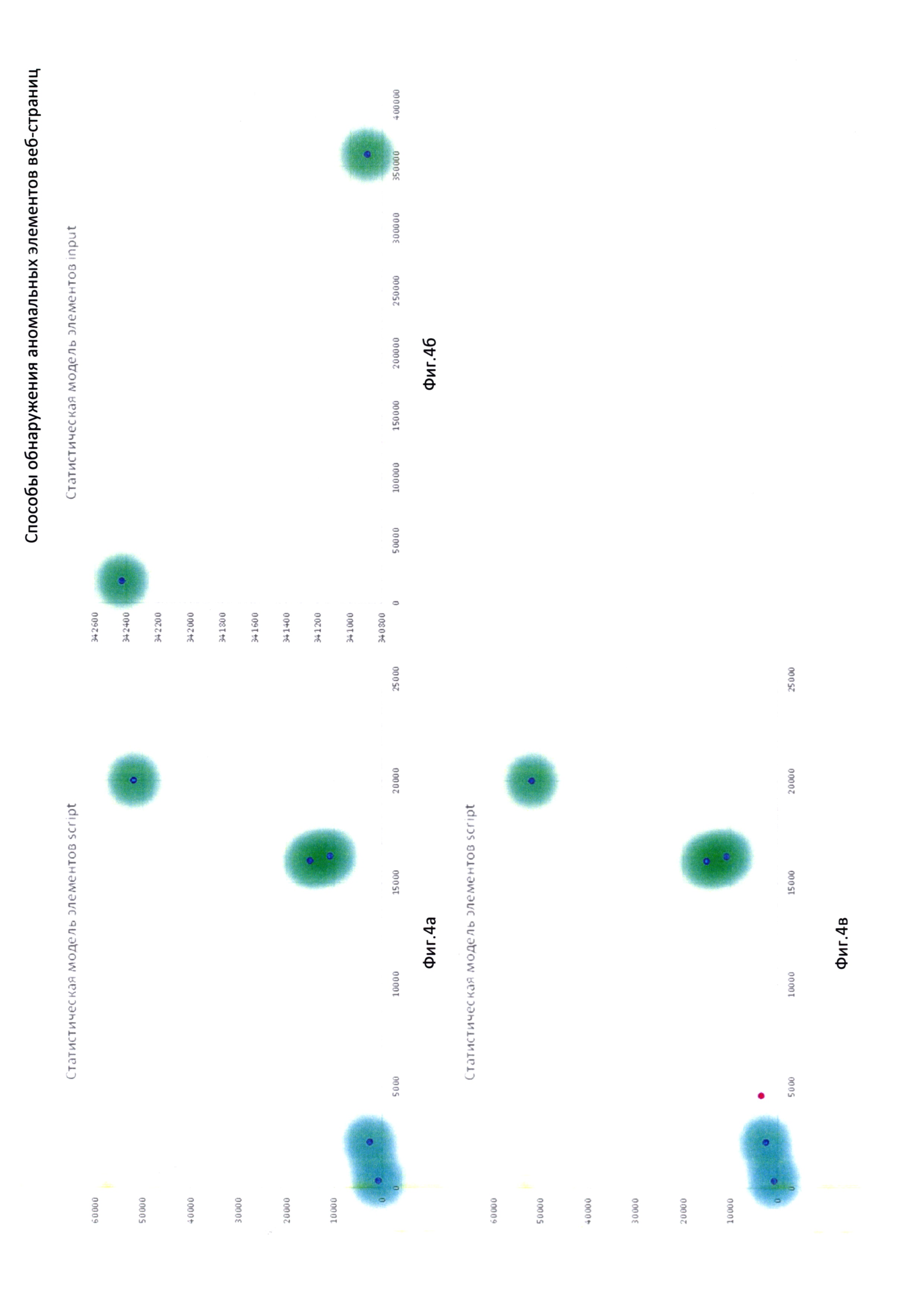 каждый вектор сохраняется в двумерном пространстве модели 230, в данном случае аномалии отсутствуют, все векторы попадают в сложившиеся ранее кластеры (т.е. совпадают с данными, поступившими от скрипта 140 с тех версий веб-страниц ранее). Для наглядности на Фиг. 4а приведена визуализация модели, где точками изображены анализируемые элементы <script>, закрашенными областями - созданные ранее кластеры 210 модели 220 как части модели 230: