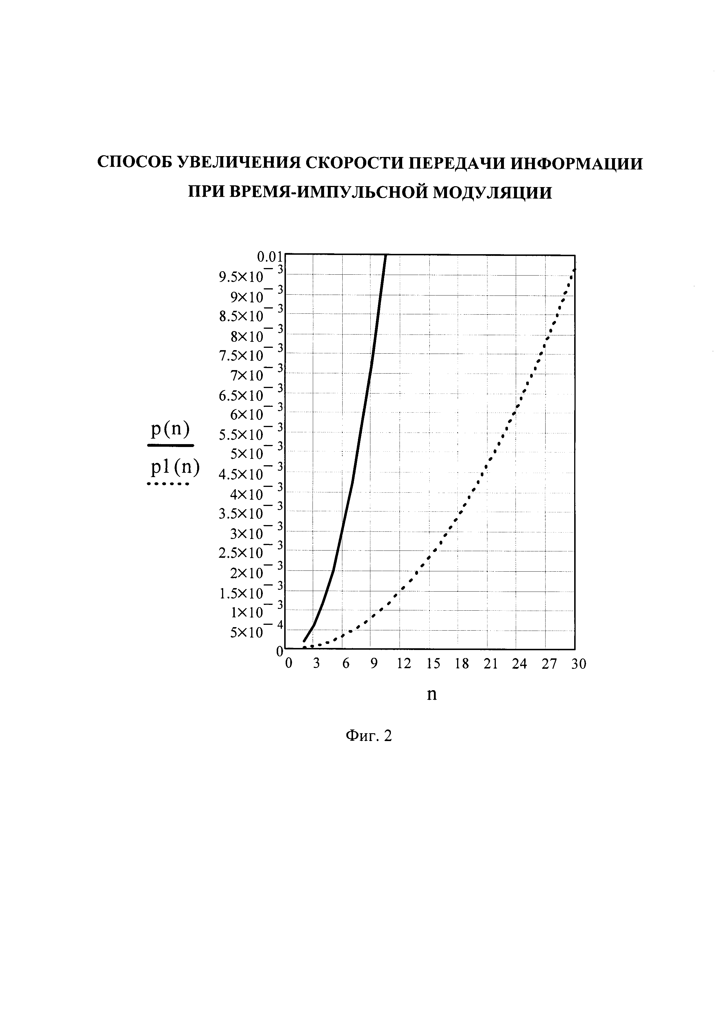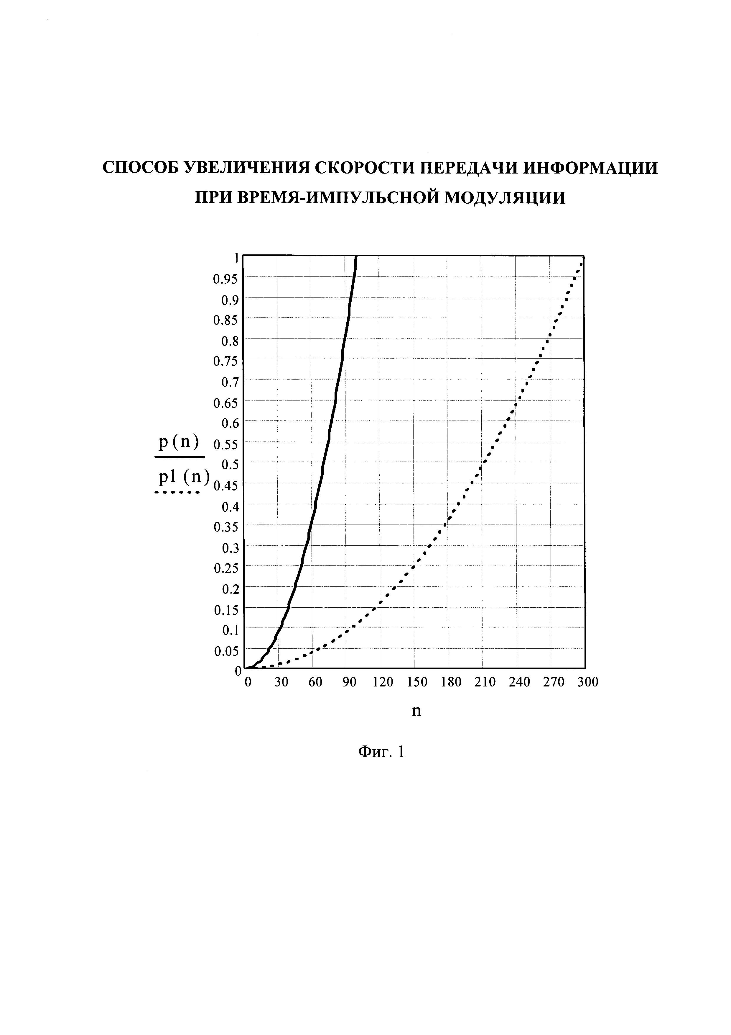 Изобретение относится к области радиотехники и связи и может быть использовано в системах связи с расширенным спектром сигналов. Известно, что при псевдослучайной время-импульсной модуляции (ПВИМ) информация определяется временным положением (задержкой) сигнала на фиксированном временном интервале в соответствии со специальным кодом, формируемым на основе псевдослучайной последовательности рабочих частот в фиксированной на время передачи информации широкой полосе частот. Данный метод описан в литературе: Бархота В.А., Горшков В.В, Журавлев В.И. Системы связи с расширением спектра сигналов. Итоги науки и техники. Связь. М.: ВИНИТИ, 1990, т. 5. Борисов В.И., Зинчук В.М., Лимарев А.Е. и др. Помехозащищенность систем радиосвязи с расширением спектра сигналов модуляцией несущей псевдослучайной последовательностью. М.: Радио и связь, 2003. Борисов В.И., Зинчук В.М., Лимарев А.Е. Помехозащищенность систем радиосвязи с расширением спектра сигналов методом псевдослучайной перестройки рабочей частоты. М.: Радио-Софт, 2008. Недостатком данного способа является относительно низкая скорость передачи информации. Цель изобретения - повышение скорости передаваемой информации при псевдослучайной время-импульсной модуляции. Поставленная цель достигается путем одновременной работы одного широкополосного радиопередающего устройства двумя и более каналами псевдослучайной время-импульсной модуляции, при этом на приеме на одном временном интервале в одном канале прием ведется на одной частоте, а на втором канале - на другой. При время-импульсной модуляции на приеме известно значение псевдослучайной частоты передаваемого сигнала, но неизвестен номер временной позиции. Время задержки от начала отсчета временного интервала Т0 до времени позиции, во время которой приходит сигнал, определяет передаваемую информацию. Способ реализуется следующим образом. При время-импульсной модуляции задается некоторый временной интервал Т0, синхронизированный на приеме и передаче. Этот интервал разбивается на N равных временных позиций, таких что T0=N⋅Δt, где Δt - продолжительность одной временной позиции. Если вероятность совпадения по времени импульсов излучения, задаваемых каждым каналом - достаточно мала, то появляется возможность одновременной работы двумя и более каналами при использовании одного усилителя мощности. При этом следует учитывать, что в каждом из двух каналов псевдослучайное распределение частот различно и по этой причине на приеме на одном временном интервале в одном канале прием ведется на одной частоте, а на втором канале - на другой. Рассмотрим работу двух каналов с время-импульсной модуляцией в одном временном интервале. Поскольку помехозащищенность требует максимального приближения сигнала в частотной и временной области к сигналам природного происхождения, примем законы распределения псевдослучайных величин частоты и времени излучения импульса равновероятными. В этом случае вероятность появления сигнала на одной любой из позиций p{t} определяется соотношением Появление двух сигналов на одной временной позиции может квалифицироваться как произведение событий №1 и №2 [Абезгауз Г.Г., Тронь А.П., Капенкин Ю.Н., Коровина И.А. Справочник по вероятностным расчетам. М.: Воен. издат М.О., 1970], а вероятность такого события определяется произ