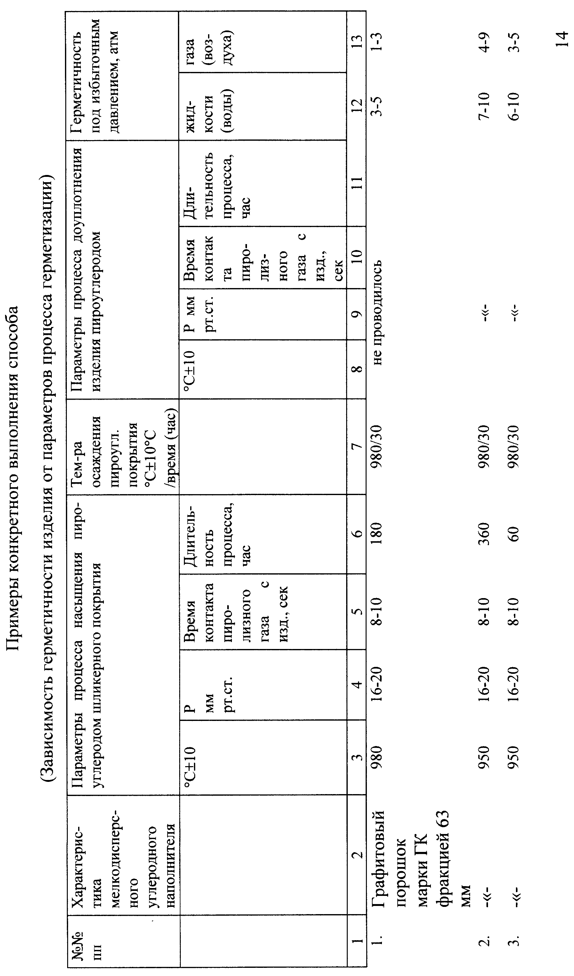 осаждения пироуглеродного покрытия. В зависимости от конкретных параметров процесса герметизации (см. таблицу) получают изделие той или