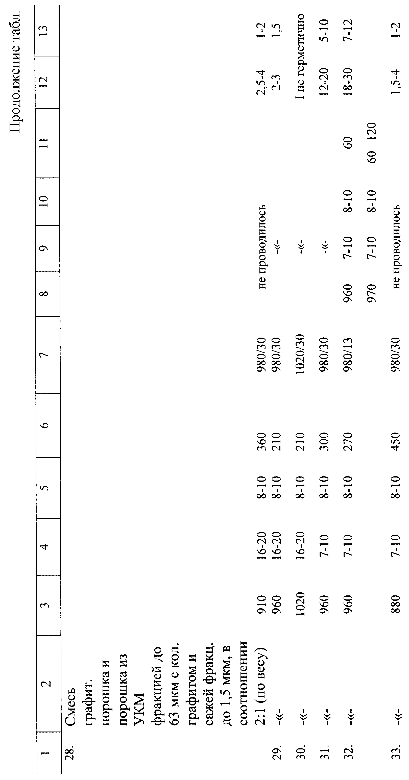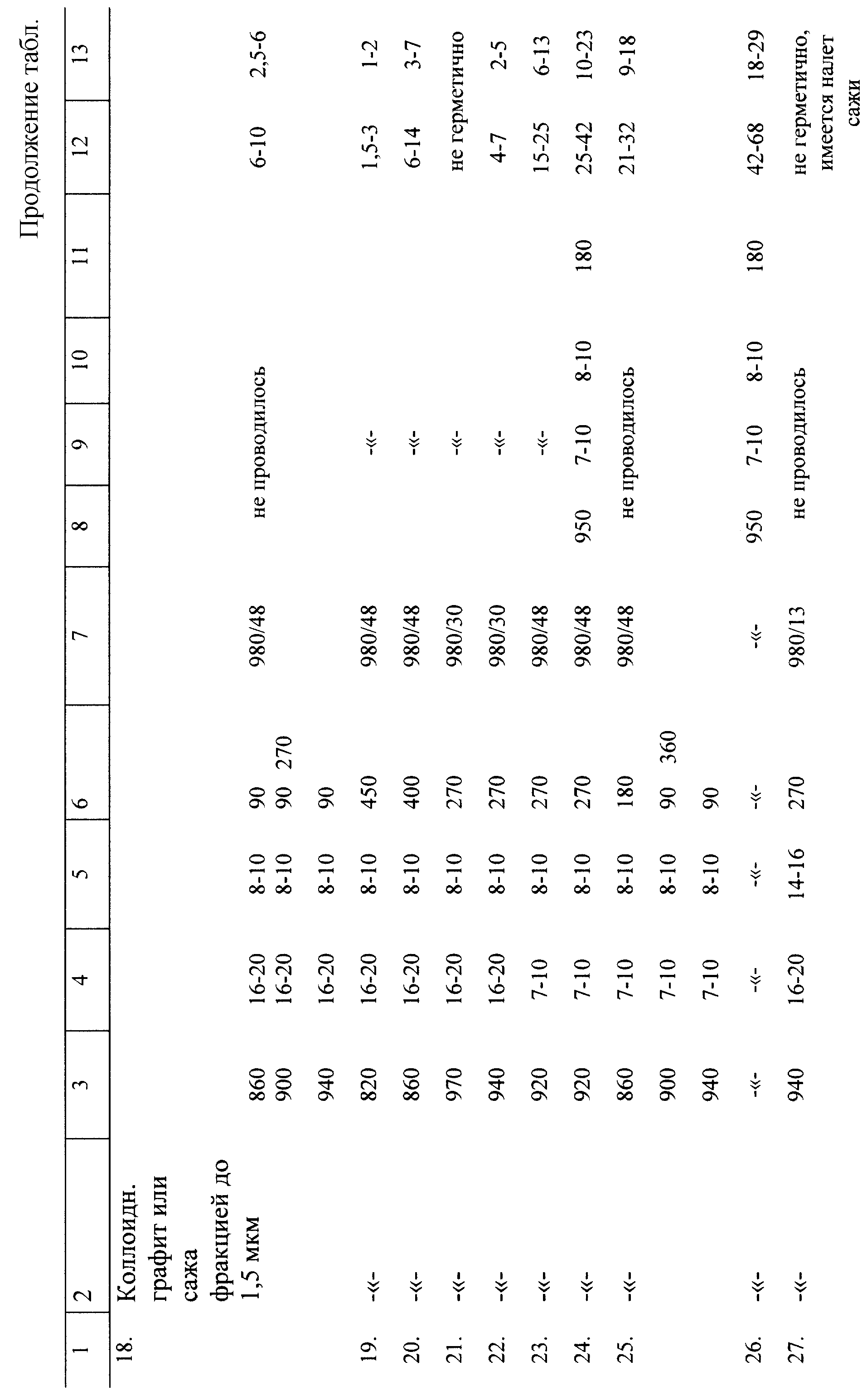 фракционного состава дисперсного углеродного наполнителя, позволяет достичь большей степени герметичности изделий (сравнить между собой примеры 1 и 3, 18 и
