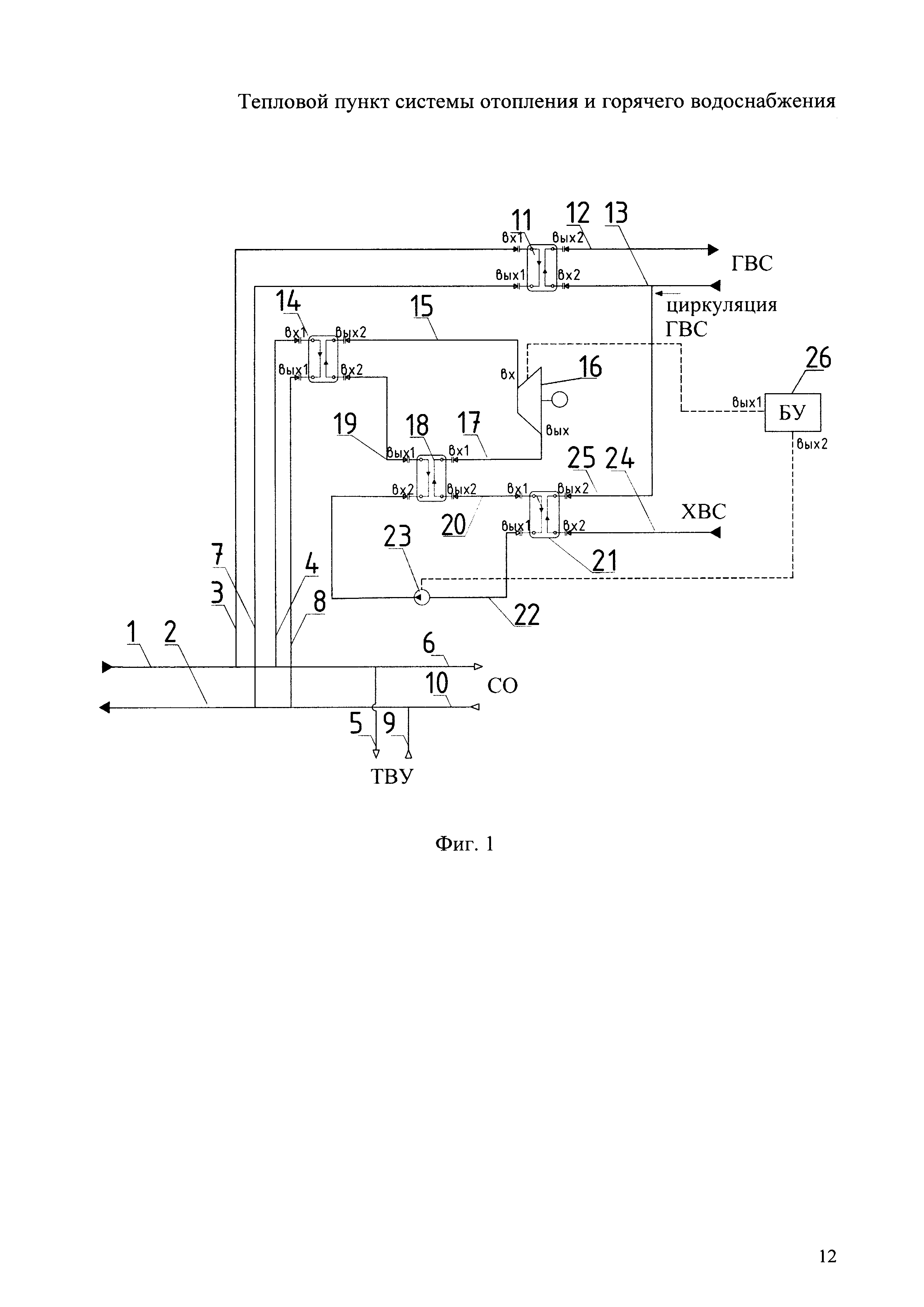 Тепловой пункт системы отопления и горячего водоснабжения, содержащий подающий и обратный трубопроводы тепловой сети, параллельно подключенные к подающему трубопроводу тепловой сети подающий трубопровод системы горячего водоснабжения (ГВС), подающий трубопровод теплоснабжения вентиляционных установок (ТВУ) и подающий трубопровод системы отопления (СО), а также параллельно подключенные к обратному трубопроводу тепловой сети обратный трубопровод системы ГВС, обратный трубопровод ТВУ и обратный трубопровод СО, теплообменник второй ступени подогрева ГВС, трубопровод нагретого теплоносителя системы ГВС, трубопровод циркуляционной линии системы ГВС, трубопровод холодного водоснабжения (ХВС) и блок управления автоматизированной системы управления теплового пункта, при этом первый вход теплообменника второй ступени подогрева ГВС подключен к подающему трубопроводу системы ГВС, первый выход соединен с обратным трубопроводом системы ГВС, второй выход подключен к трубопроводу нагретого теплоносителя системы ГВС, а второй вход соединен с трубопроводом циркуляционной линии системы ГВС, отличающийся тем, что он снабжен электрогенерирующим модулем (ЭЛГМ), подающим и обратным трубопроводами ЭЛГМ, при этом подающий трубопровод ЭЛГМ подключен параллельно к подающему трубопроводу тепловой сети, обратный трубопровод ЭЛГМ подключен параллельно к обратному трубопроводу тепловой сети, электрогенерирующий модуль представляет собой цикл Ренкина, выполненный в виде теплообменника перегревателя контура цикла Ренкина, первый вход которого подсоединен к подающему трубопроводу ЭЛГМ, а первый выход подключен к обратному трубопроводу ЭЛГМ, второй выход соединен трубопроводом рабочего вещества в состоянии перегретого пара цикла Ренкина со входом турбогенератора цикла Ренкина, выход которого соединен трубопроводом отработанного рабочего вещества цикла Ренкина с первым входом теплообменника рекуператора цикла Ренкина, первый выход которого соединен трубопроводом подогретого конденсата рабочего вещества цикла Ренкина со вторым входом теплообменника перегревателя контура цикла Ренкина, второй выход теплообменника рекуператора цикла Ренкина соединен трубопроводом промежуточно охлажденного рабочего вещества цикла Ренкина с первым входом теплообменника конденсатора цикла Ренкина, первый выход которого соединен трубопроводом конденсата рабочего вещества цикла Ренкина со вторым входом теплообменника рекуператора цикла Ренкина, при этом на трубопроводе конденсата рабочего вещества цикла Ренкина установлен циркуляционный насос, второй выход теплообменника конденсатора цикла Ренкина соединен трубопроводом подогретого теплоносителя системы ГВС с трубопроводом циркуляционной линии системы ГВС, ко второму входу теплообменника конденсатора цикла Ренкина подключен трубопровод холодного водоснабжения (ХВС), при этом первый выход блока управления автоматизированной системы управления теплового пункта подключен к управляющему входу турбогенератора цикла Ренкина, а второй его выход подключен к управляющему входу циркуляционного насоса.