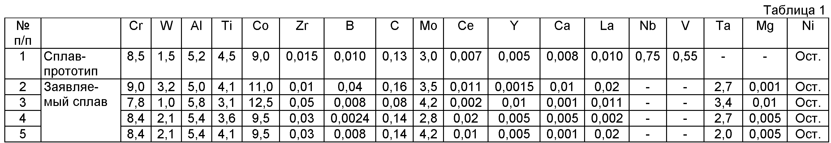Хром 6,5-10,5 Вольфрам 1,0-1,8 Ниобий 0,5-1,0 Алюминий 4,8-5,7 Титан 4,2-4,7 Кобальт 6,0-10,0 Цирконий 0,01-0,02 Бор 0,005-0,015 Углерод 0,06-0,2 Молибден 2,7-4,0 Церий 0,002-0,015 Один элемент из группы, включающей иттрий и 0,0015-0,01 скандий Ванадий 0,1-1,0 Кальций 0,001-0,015 Лантан 0,002-0,02 Никель остальное Хром 7,8-9,0 Вольфрам 1,0-3,2 Алюминий 5,0-5,8 Титан 3,1-4,1 Кобальт 9,5-12,5 Цирконий 0,01-0,05 Бор 0,008-0,04 Углерод 0,08-0,16 Молибден 2,8-4,2 Церий 0,002-0,02 Иттрий 0,0015-0,01 Кальций 0,001-0,01 Лантан 0,002-0,02 Тантал 2,0-3,4 Магний 0,001-0,01 Никель остальное.