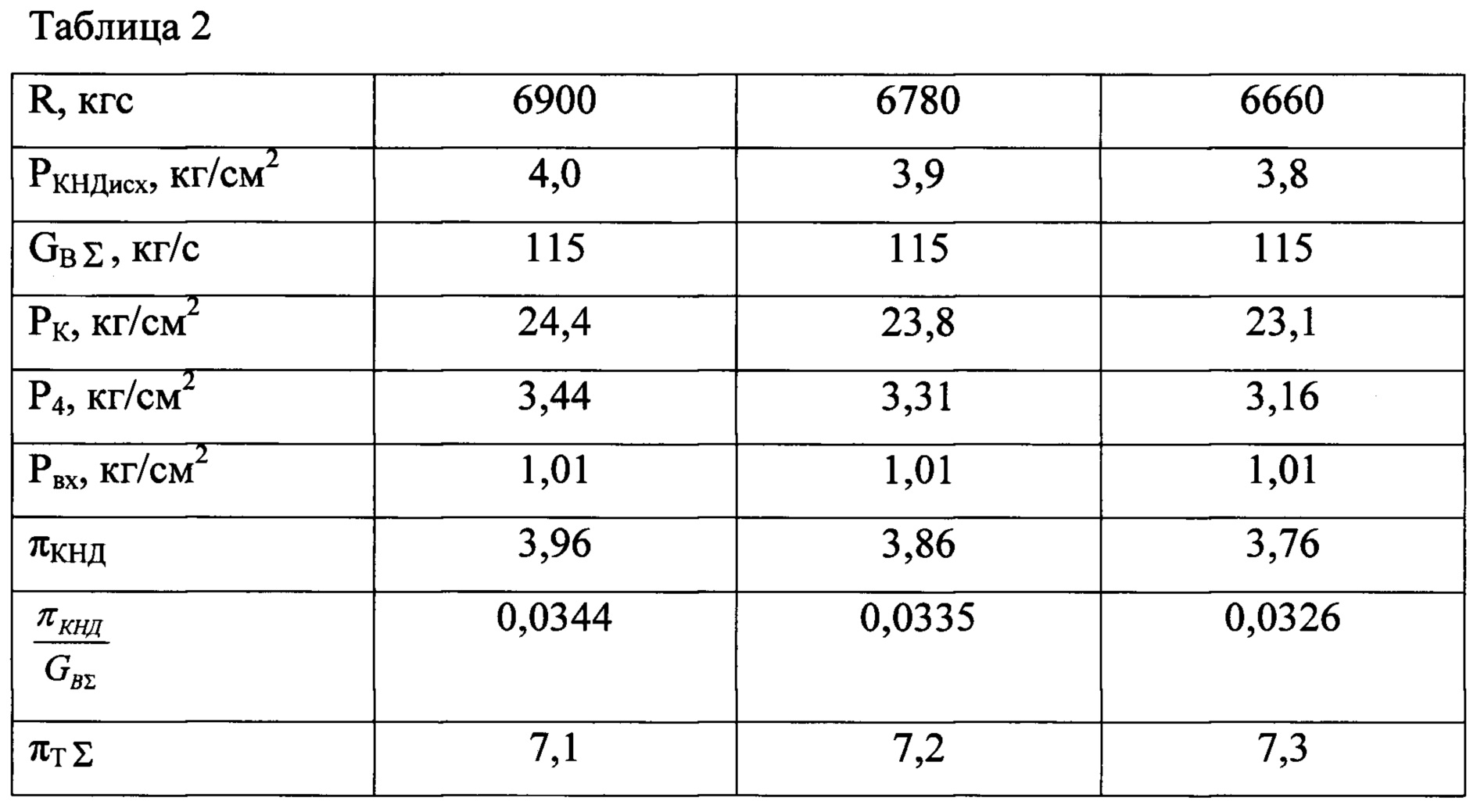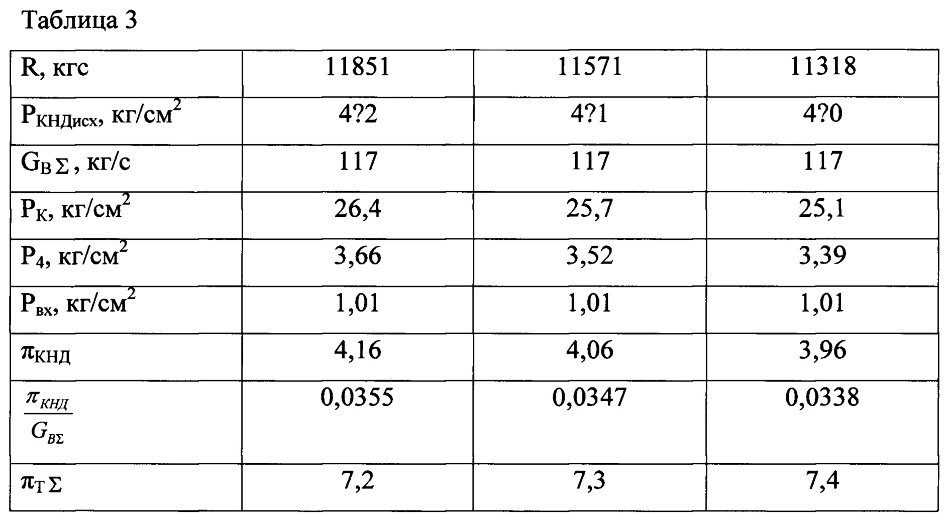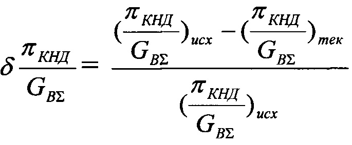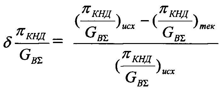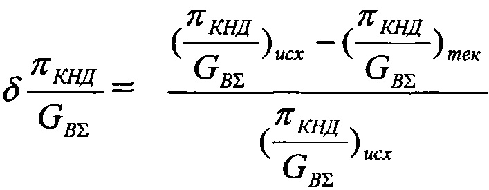 , затем последовательно изменяют величину степени расширения на турбинах πTΣ в сторону увеличения, по крайней мере дискретно не менее чем при трех значениях πТΣ измеряют текущие значения вышеуказанных параметров и вычисляют вышеуказанные отношения, вычисляют величины отклонений текущих от исходных