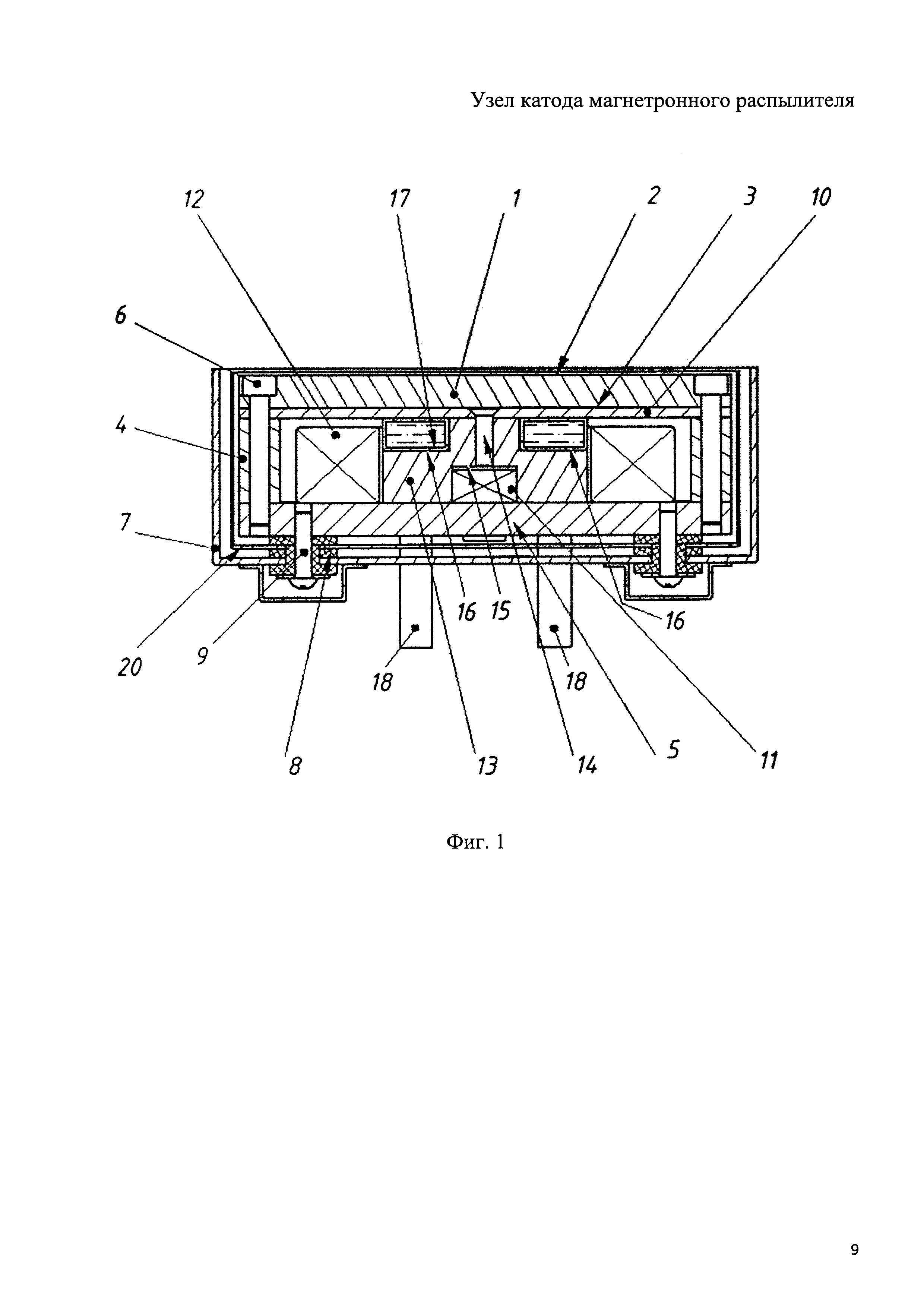 1. Узел катода магнетронного распылителя, содержащий мишень с внешней поверхностью и внутренней поверхностью, закрепленную в стенках корпуса, установленных на основании, соединительными винтами, первый электростатический экран, установленный с внешней стороны стенок корпуса и основания, выполненный идентичным их форме, закрепленный на основании крепежными болтами и электрически изолированный от него изоляторами, внешние магниты, расположенные на периферии основания, теплопередающий элемент и трубопровод охлаждения, отличающийся тем, что он снабжен центральным магнитом, установленным на основании по его продольной оси симметрии, пластиной, вторым электростатическим экраном и прижимными винтами, при этом пластина установлена со стороны внутренней поверхности мишени, выполнена по форме, идентичной форме мишени толщиной от 1 до 4 мм и плотно прижата к ней и стенкам корпуса соединительными винтами, причем между пластиной и верхней плоскостью внешних магнитов образован теплоизоляционный зазор шириной от 0,5 до 2 мм, при этом общая толщина пластины с мишенью не превышает 12 мм, второй электростатический экран установлен внутри первого электростатического экрана, выполнен идентичным его форме, электрически изолирован от основания изоляторами и закреплен на нем крепежными болтами с образованием между стенками корпуса, вторым электростатическим экраном и первым электростатическим экраном зазоров от 2 до 4 мм, при этом теплопередающий элемент расположен на основании, выполнен в виде вкладыша продолговатой формы и прижат своей верхней плоскостью к пластине прижимными винтами и боковыми торцами к внешним магнитам, при этом теплопередающий элемент содержит внутреннюю проточку, в которой расположен центральный магнит и выполненную идентичной форме центрального магнита, внешние проточки, в которых установлен трубопровод охлаждения с патрубками подачи и отвода охлаждающей жидкости, при этом внешние проточки выполнены идентичными форме трубопровода охлаждения таким образом, что он плотно прижат к пластине, и отверстия, в которые вставлены патрубки подачи и отвода охлаждающей жидкости, выполненные идентичными форме поперечного сечения патрубков подачи и отвода охлаждающей жидкости, причем трубопровод охлаждения выполнен в виде прямоугольной рамки со скошенными углами из труб прямоугольного поперечного сечения, которое выбрано из условия обеспечения эффективного охлаждения с турбулентным режимом течения охлаждающей жидкости, характеризующимся числом Рейнольдса не менее 8000. 2. Узел катода по п. 1, отличающийся тем, что пластина и теплопередающий элемент выполнены из немагнитных материалов с высокой теплопроводностью. 3. Узел катода по п. 1, отличающийся тем, что второй электростатический экран выполнен из немагнитного материала с низким значением коэффициента черноты.