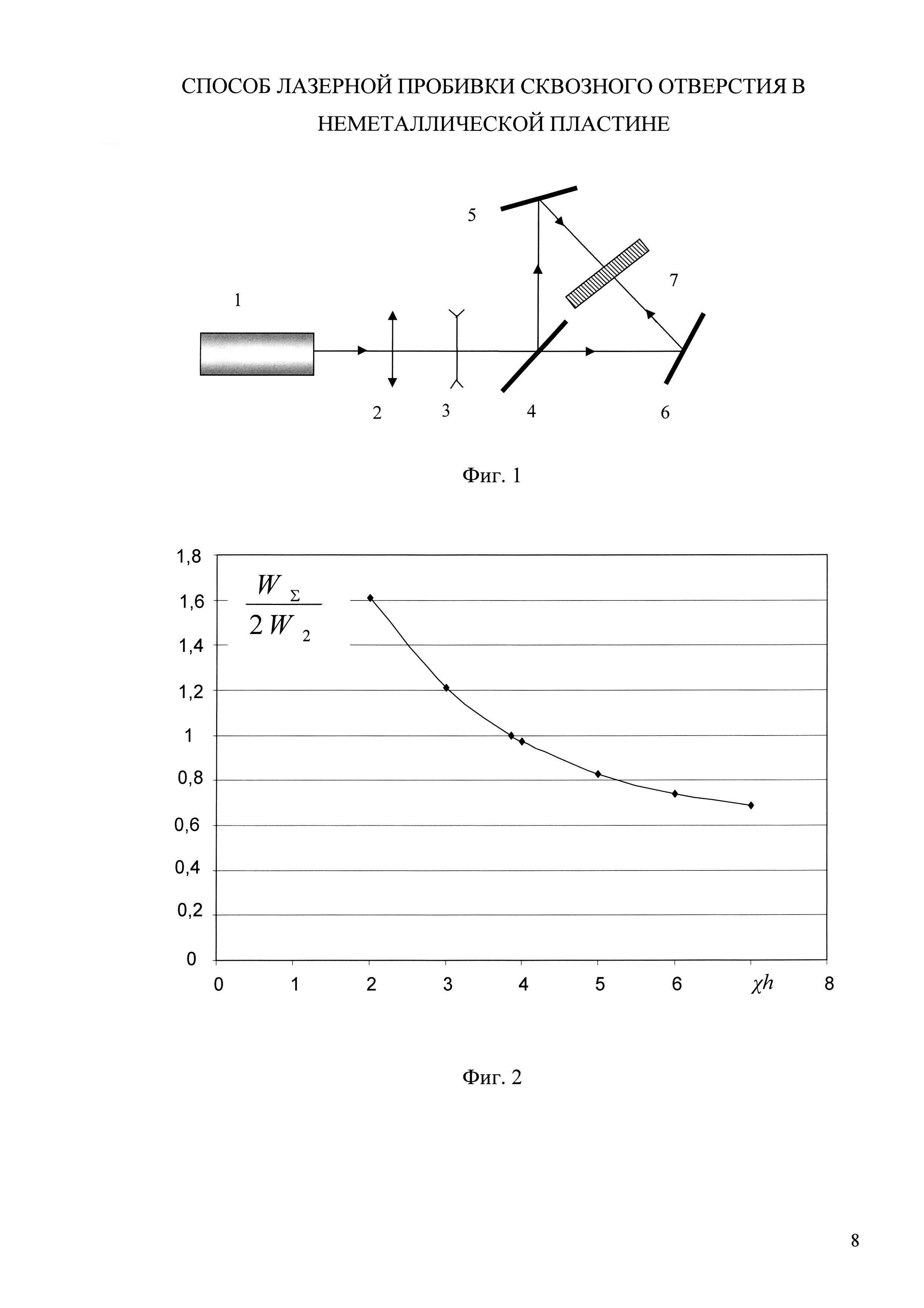 Способ лазерной пробивки сквозного отверстия в неметаллической пластине, включающий разделение лазерного пучка на два, воздействие на обе стороны пластины пучками с равной плотностью энергии, которую рассчитывают по соотношению, связывающему удельную энергию сублимации материала Q, коэффициент отражения материала пластины R и показатель поглощения материала χ на длине волны воздействующего лазерного излучения, отличающийся тем, что сначала лазерным пучком воздействуют на одну поверхность пластины с плотностью энергии, определяемой по следующему соотношению а воздействие на обе стороны пластины осуществляют с плотностью энергии, отличной от величины плотности энергии предыдущего воздействия, которую определяют по следующему соотношению где е - основание натурального логарифма; h - толщина пластины, aχh>3,87.