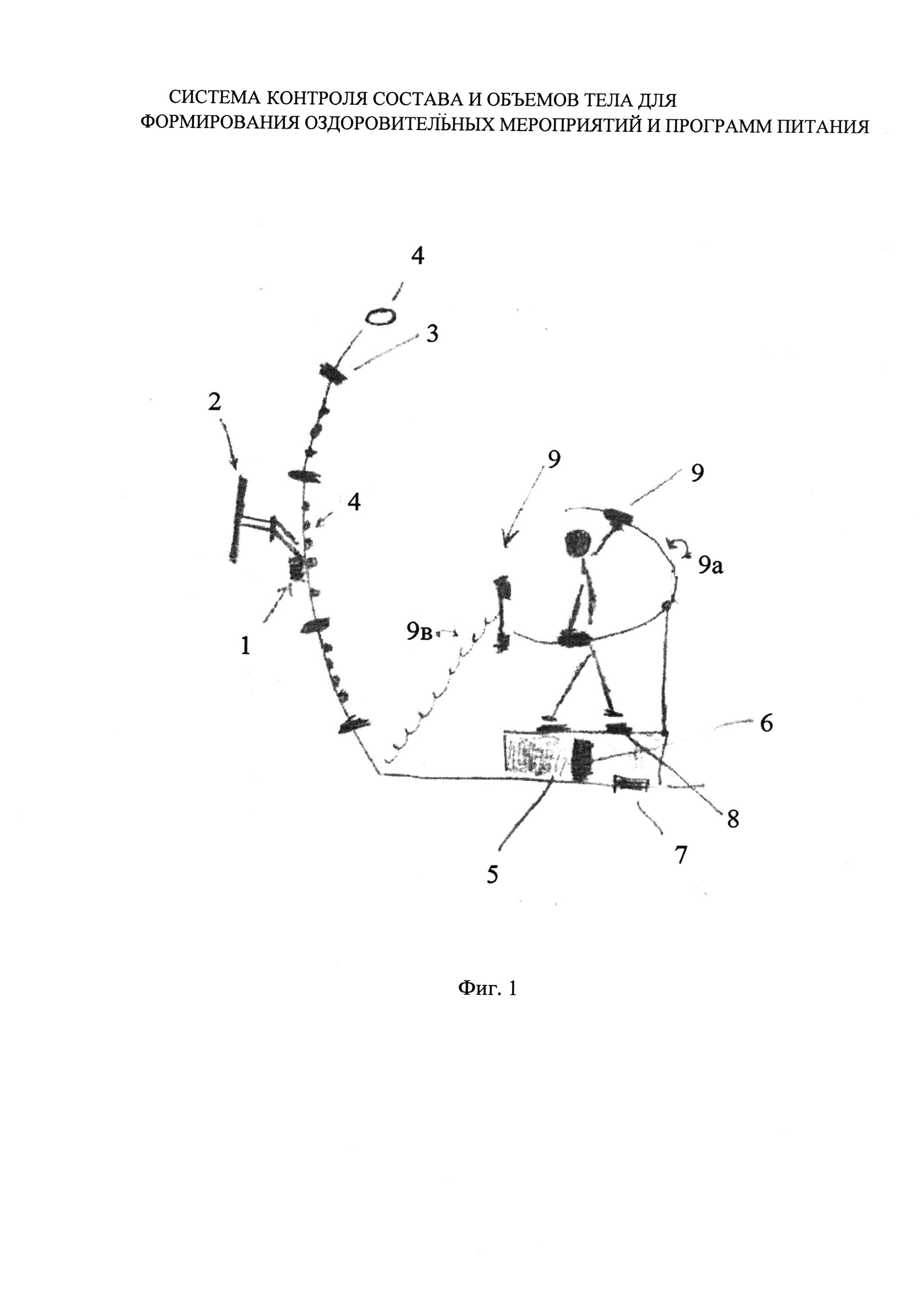 Система контроля состава и объемов тела для формирования оздоровительных мероприятий и программ питания, включающая электронный модуль, связанный беспроводной связью с мобильным блоком, оснащенным электродами, отличающаяся тем, что в электронном модуле заложен программный продукт, мобильный блок выполнен в виде платформы с возможностью вращения, посредством привода, оснащенной 3D сканером и блоком биоимпеданса, электродами для ног, установленными на платформе, электродами для рук, выполненными для размещения спереди или сзади пациента, кроме того, системный блок имеет возможность контакта с осветителями и камерами.
