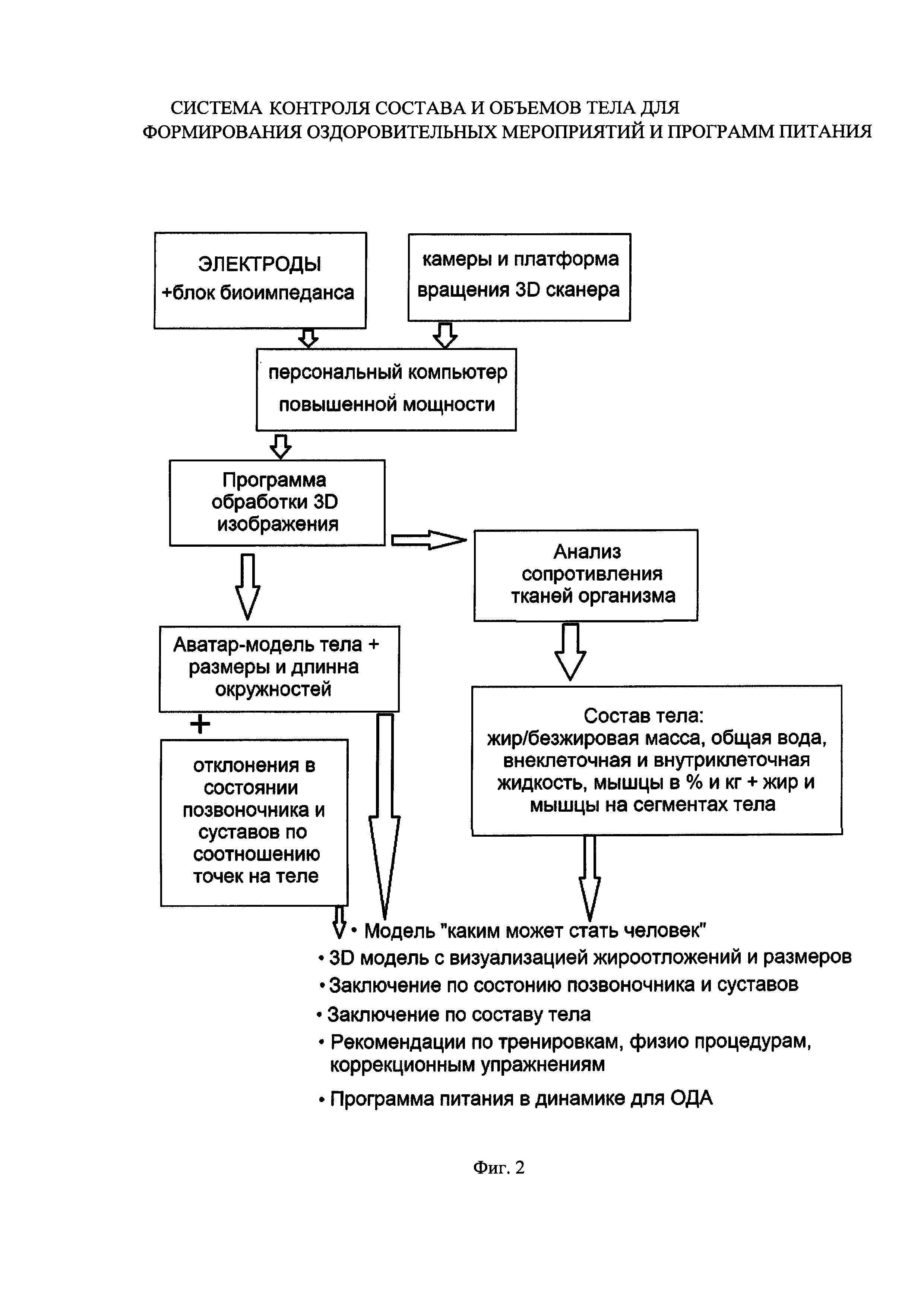 Изобретение относится к медицинской технике, а именно к системе контроля состава и объемов тела для формирования оздоровительных мероприятий и программ питания. Система включает в себя электронный модуль. В электронном модуле заложен программный продукт. Электронный модуль связан беспроводной связью с мобильным блоком. Мобильный блок оснащен электродами. Мобильный блок выполнен в виде платформы с возможностью вращения, посредством привода, оснащен 3D сканером и блоком биоимпеданса. Электроды для ног установлены на платформе. Электроды для рук выполнены для размещения спереди или сзади пациента. Системный блок имеет возможность контакта с осветителями и камерами. Достигается получение максимально точных данных, включая данные 3D сканера, состояния тела человека и его опорно-двигательной системы с интерпретацией выявленных отклонений, для выработки рекомендаций коррекции питания, физической активности и оценки их эффективности в динамике. 2 ил.