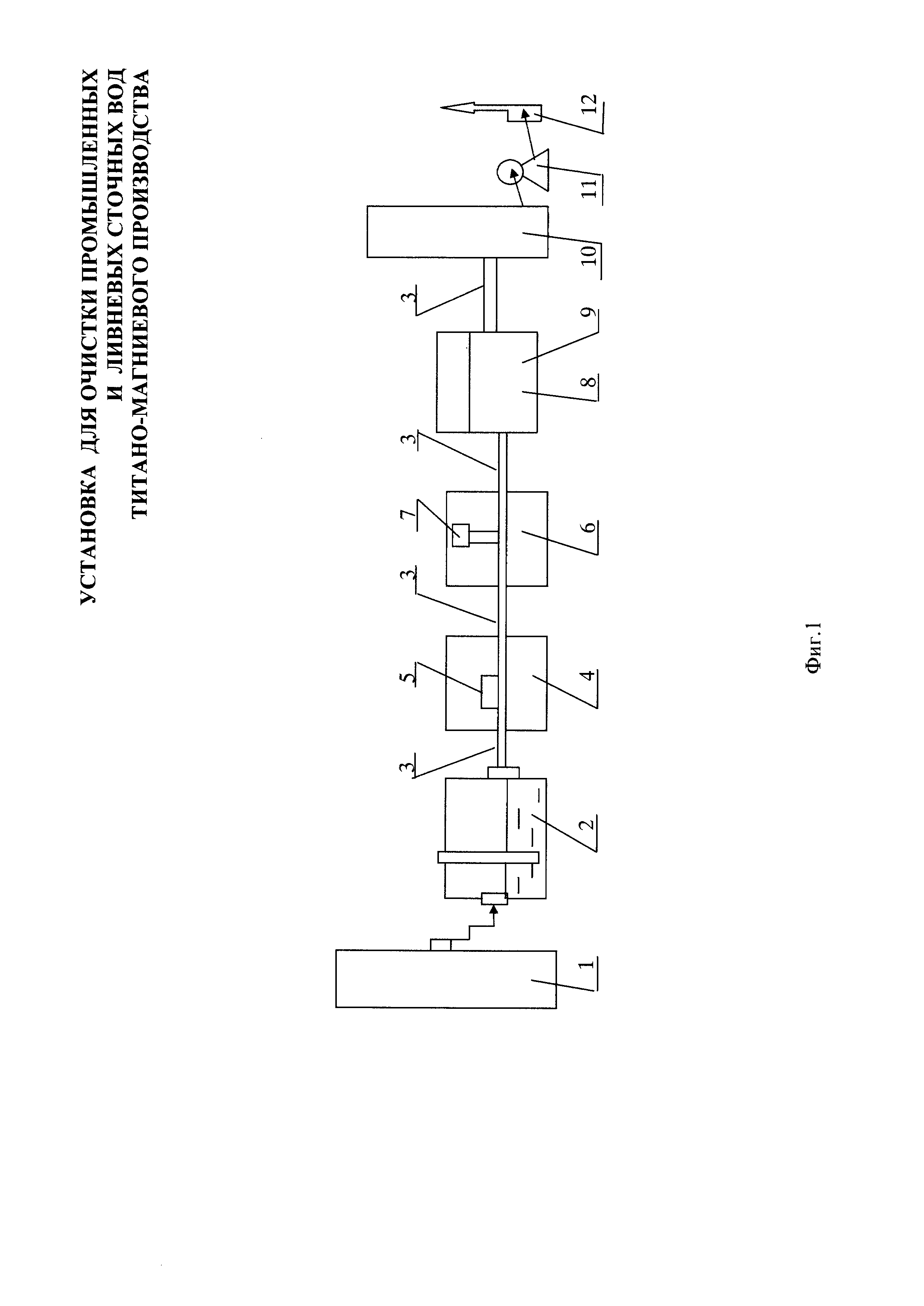 Изобретение относится к области очистки промышленных и ливневых сточных вод, содержащих ионы цветных и редких металлов, взвешенные частицы, нефтепродукты, масла и жиры, и может быть использовано в цветной металлургии, в частности при очистке промышленных и ливневых сточных вод титаномагниевого производства. Известны аппараты и установки для очистки промышленных и ливневых сточных вод химической промышленности (см. кн. Очистка сточных вод в химической промышленности. - Проскуряков В.А., Шмидт Л.И. - Л.: Химия, 1977, стр. 377-391), включающие отстойники и нефтеловушки для механической очистки сточных вод от грубодисперсных частиц и нефтепродуктов, флотационные установки, фильтры, аппараты с применением различных типов коагулянтов и флокулянтов, адсорберов с применением активных углей в качестве адсорбентов, биологическую очистку в аэротенках. Недостатком работы таких установок и аппаратов для очистки промышленных и ливневых сточных вод является их низкая степень очистки, так, очистка сточных вод от нефтепродуктов достигает остаточного содержания 50-150 мг/л, а степень улавливания механических примесей составляет 50%. Кроме того, предложенные аппараты для очистки промышленных и ливневых сточных вод различных химических производств не предусматривают конкретной установки для очистки промышленных и ливневых сточных вод титаномагниевого производства, в частности очистку сточных вод от ионов цветных и редких металлов. Известна установка для очистки сточных вод от нефтепродуктов (патент РФ №2235692, опубл. 10.09.2004). Установка содержит канализационные трубопроводы, смотровые колодцы, нефтеловушку, снабженную гидрозатворами с вертикальной трубой, плавно переходящей в эжекторный конус. Кроме того, смотровые колодцы содержат иммобилизованные штаммы микроорганизмов. Загрязненные сточные воды поступают в нефтеловушку, затем в грязеотстойник механических примесей, затем по трубопроводу поступают в колодец-биореактор, в который вводят иммобилизованные штаммы микроорганизмов для переработки примесей хозфекального характера. Очищенная сточная вода поступает в городскую канализацию. Недостатком известной установки для очистки промышленных и ливневых сточных вод является ее низкая степень очистки, так как производят очистку только от механических примесей в нефтеловушке и биологическую очистку штаммами микроорганизмов. Кроме того, заявленная установка не предназначена для очистки промышленных и ливневых сточных вод от ионов цветных и редких металлов, присутствующих в сточных водах на предприятиях цветной металлургии. Известна установка для очистки ливневых стоков от нефтепродуктов и взвешенных частиц (ПМ РФ №115776, опубл. 10.05.2012), состоящая из емкости, разделенной перегородками с переливными отверстиями на несколько камер: приемную камеру, отстойник, успокоительную камеру и фильтрационную камеру с сорбционным наполнителем. Емкость также содержит смотровые колодцы с люками, входной коллектор и выходной патрубок. Для снижения скорости движения ливневых стоков входной коллектор приемной камеры выполнен с коническим насадком. В приемной камере на входном коллекторе установлена съемная сетчатая корзина с глухим основанием в виде бункера трапециевидного сечения, причем передняя стенка корзины контактирует с коническим наса