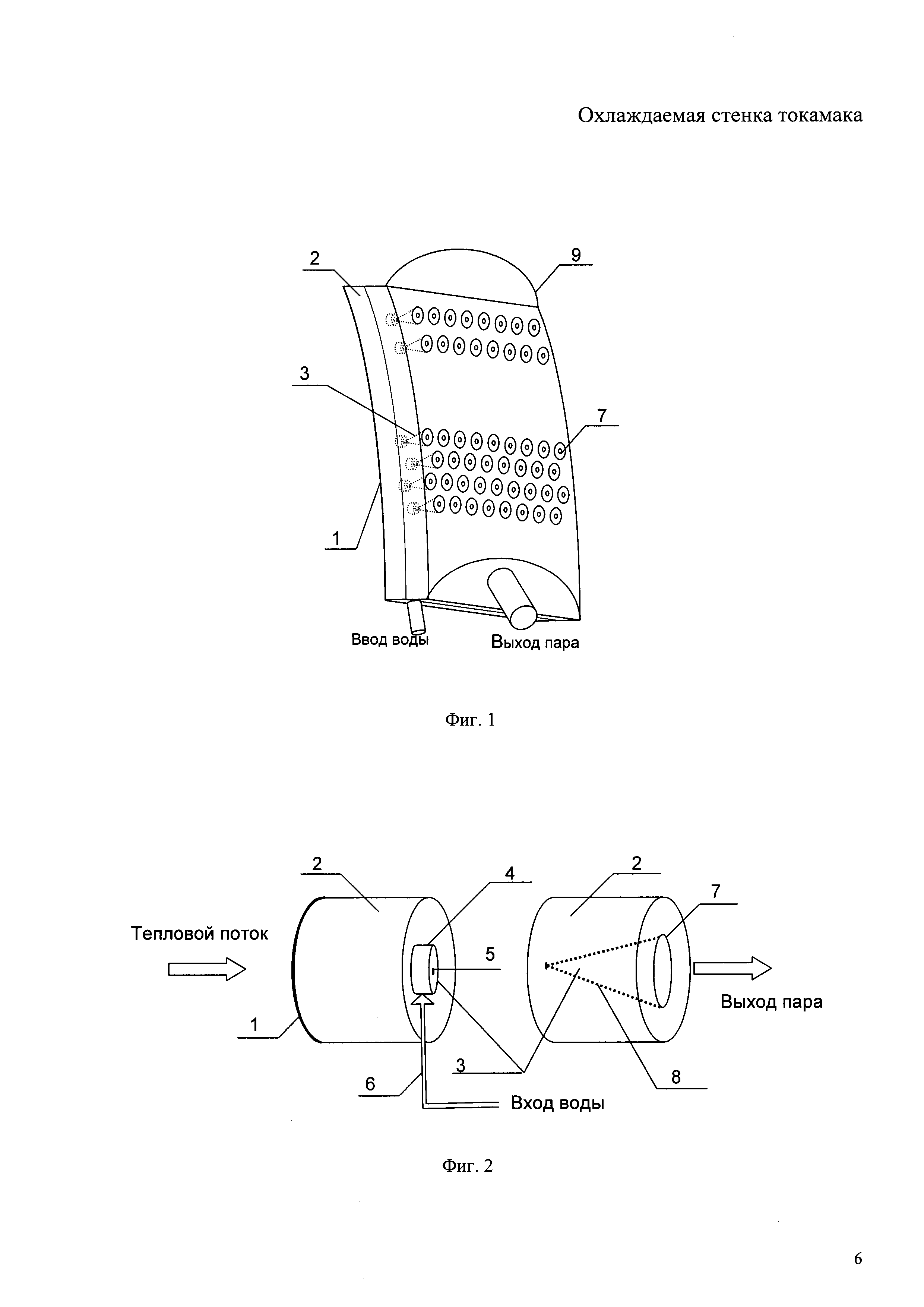 Изобретение относится к металлургии, ракетному двигателестроению, системам аварийного охлаждения атомных реакторов и, в частности, диверторам, лимитерам и бланкетам термоядерных реакторов типа токамак и может быть использовано для охлаждения стенок камер с высокой интенсивностью теплового потока из центра камер на периферию. Известна термосиловая охлаждаемая конструкция стенки элемента высокотемпературного воздушно-газового тракта (патент РФ №2403491, публ. 10.11.2010, МПК F16L 59/07), содержащая каналы для прохождения охлаждающей жидкости, имеющие тепловой контакт со стенкой камеры сгорания. Недостатком настоящего технического решения является ограниченный отвод энергии от горячей стенки, связанный с недопустимостью закипания охлаждающей жидкости в каналах и образованием эффекта «запаривания». Известен порт-лимитер термоядерного реактора (Патент РФ №2267174, публ. 27.12.2005, МПК G21B 1/00), содержащий каналы для прохождения охлаждающей жидкости, имеющие тепловой контакт с поверхностью, воспринимающей тепловой поток от плазмы. Недостатком данного технического решения также является ограниченный отвод энергии от горячей стенки. Наиболее близкой по технической сущности к заявляемому изобретению является охлаждаемая стенка токамака, описанная в патенте РФ №2467416 «Система пассивной безопасности ядерной энергетической установки», публ. 20.11.2012, МПК G21C 15/18, и содержащая поверхность приема теплового потока и прилегаемую к ней теплопроводящую зону, группу форсунок, каждая из которых содержит камеру с осевым отверстием, каналы подвода охлаждающей жидкости. При этом на поверхности приема теплового потока расположены несколько слоев металлических шариков. Недостатком настоящего технического решения является низкая степень охлаждения при высокой интенсивности теплового потока, обусловленная тем, что вода, попавшая на поверхность шариков, испаряется и по каналам между шариками вырывается наружу, образуя паровую подушку, препятствующую попаданию распыляемой из форсунок воды на охлаждаемую поверхность. Технической задачей предлагаемого изобретения является повышение эффективности съема тепла с нагреваемой стенки. Технический результат заключается в повышении эффективности охлаждения стенок камер с высокой интенсивностью теплового пока из центра камер на периферию. Это достигается тем, что известная охлаждаемая стенка токамака, содержащая поверхность приема теплового потока и прилегающую к ней теплопроводящую зону, группу форсунок, каждая из которых содержит камеру с осевым отверстием, соединенную с каналом подвода охлаждающей жидкости, снабжена кожухом для сбора пара, при этом группа форсунок расположена внутри теплопроводящей зоны, причем в каждой форсунке выполнено сопло, расположенное соосно осевому отверстию, а на внутренней поверхности сопла выполнено оребрение, при этом кожух для сбора пара установлен со стороны сопел. Изобретение поясняется чертежами, где на фиг. 1 изображена охлаждаемая стенка токамака, на фиг. 2 показан разрез форсунки. Охлаждаемая стенка токамака содержит поверхность приема теплового потока 1 и прилегающую к ней теплопроводящую зону 2, внутри которой расположена группа форсунок 3, причем каждая форсунка 3 содержит камеру 4 с осевым отверстием 5, соединенную с каналом подвода охлаждающей жидкост