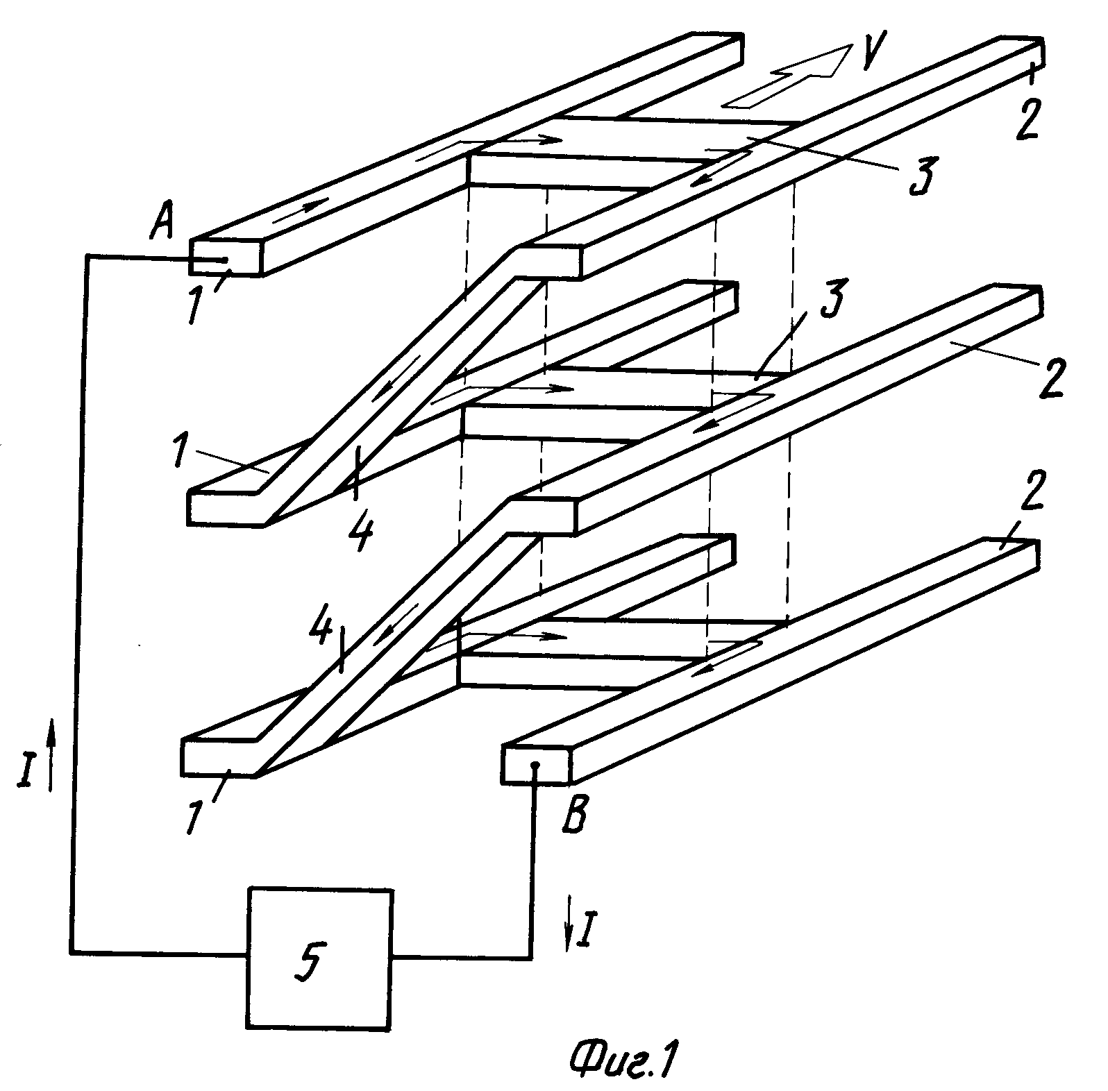 и 2, электропроводные перемычки 3 ускоряемого якоря установлены с возможностью скольжения по рельсам 1 и 2 соответствующей пары. Две сериесные перемычки 4, соединяющие начальные концы пар рельсов 1 и