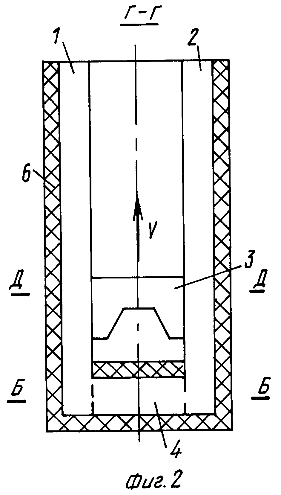 электрического тока. Конструкция рельсотронного ускорителя, показанная на фиг. 2 в продольном сечении Г-Г изоляционного корпуса 6, содержит канал ускорителя, образованный рельсами 1 и