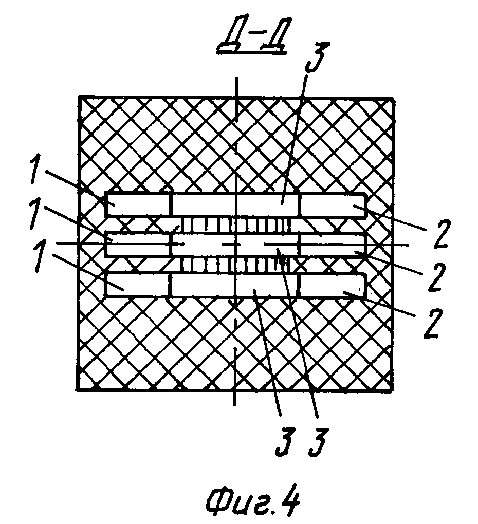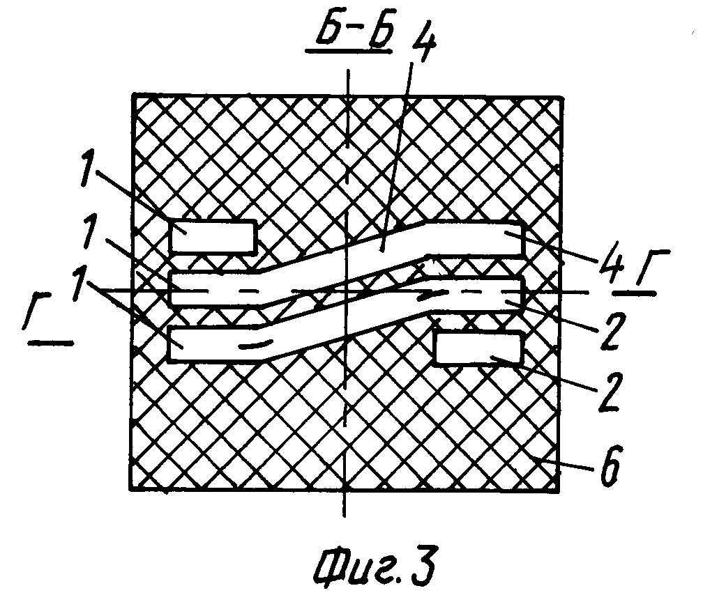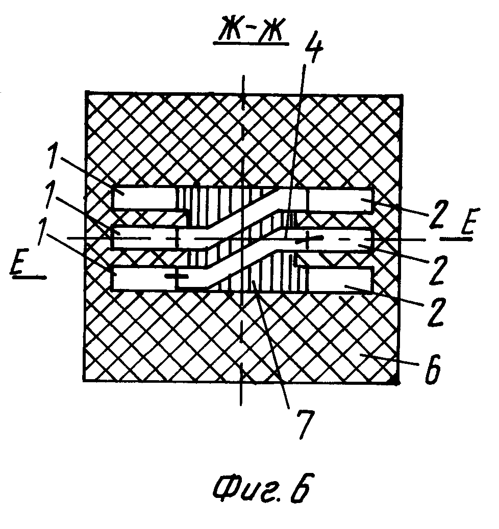 перемычки 3. Литерами Б и Д отмечены места поперечных сечений канала, показанные соответственно на фиг. 3 и 4. На поперечном сечении изоляционного корпуса канала в области сериесных