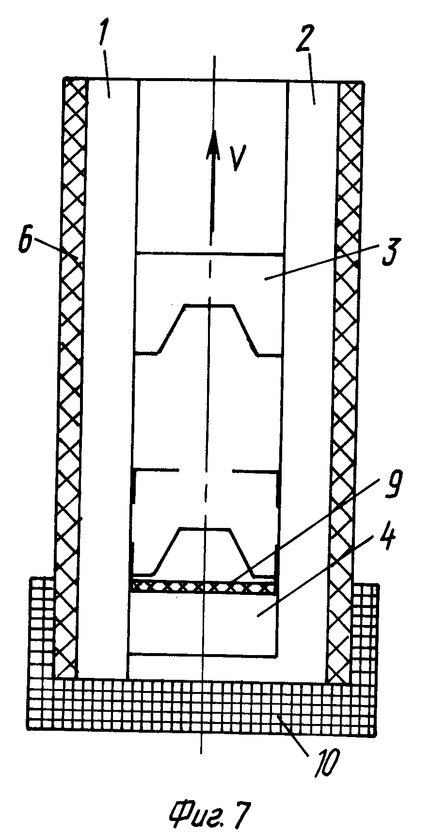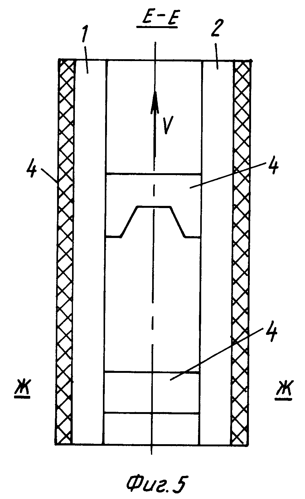 фиг. 4) обозначены рельсы 1 и 2, перемычки 3 ускоряемого якоря, изоляционный корпус 6, изолятор ускоряемого якоря 7. На продольном сечении изоляционного корпуса канала ускорителя (Е-Е,