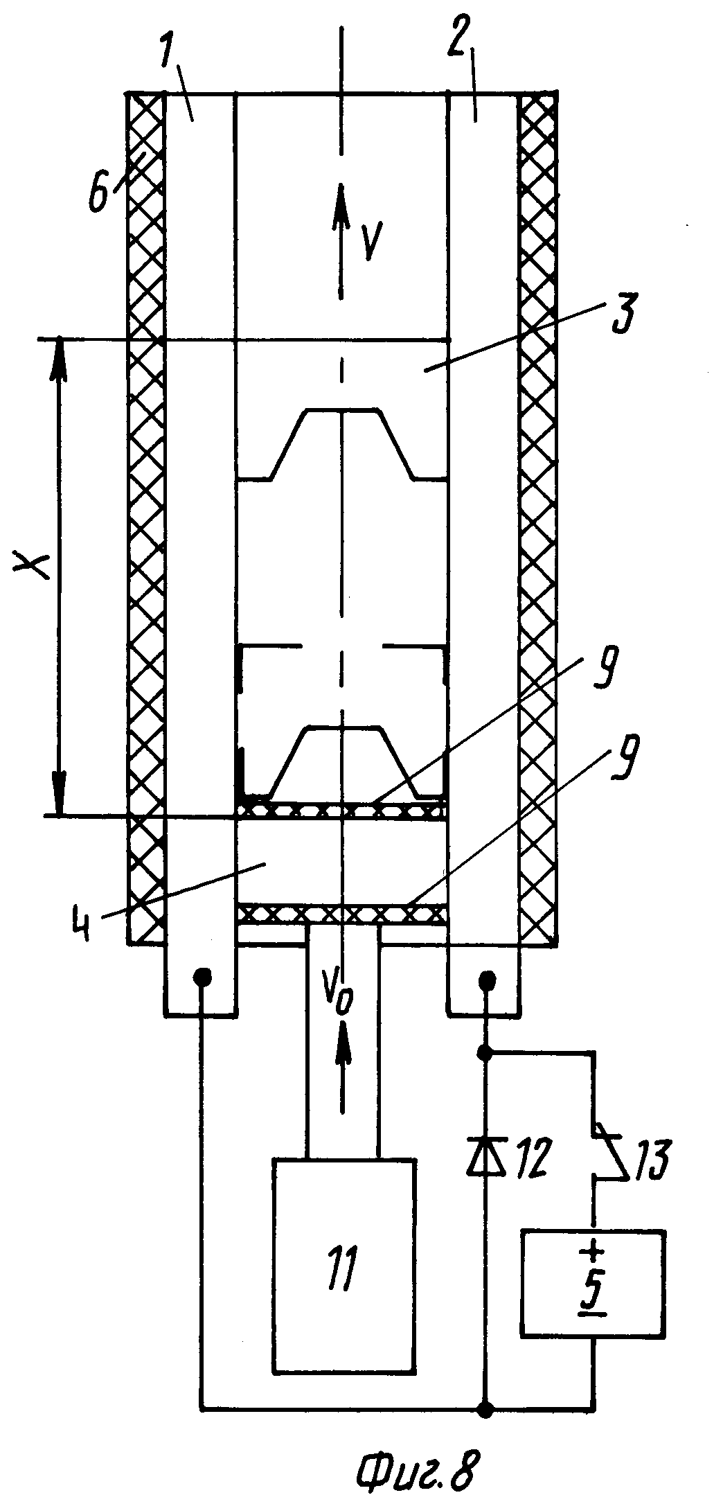 расстояние X между ускоряемым якорем и сериесными перемычками (дополнительным якорем). Источник электрической энергии 5, обратный диод 12 и коммутатор 13 показаны для описания одного из режимов работы