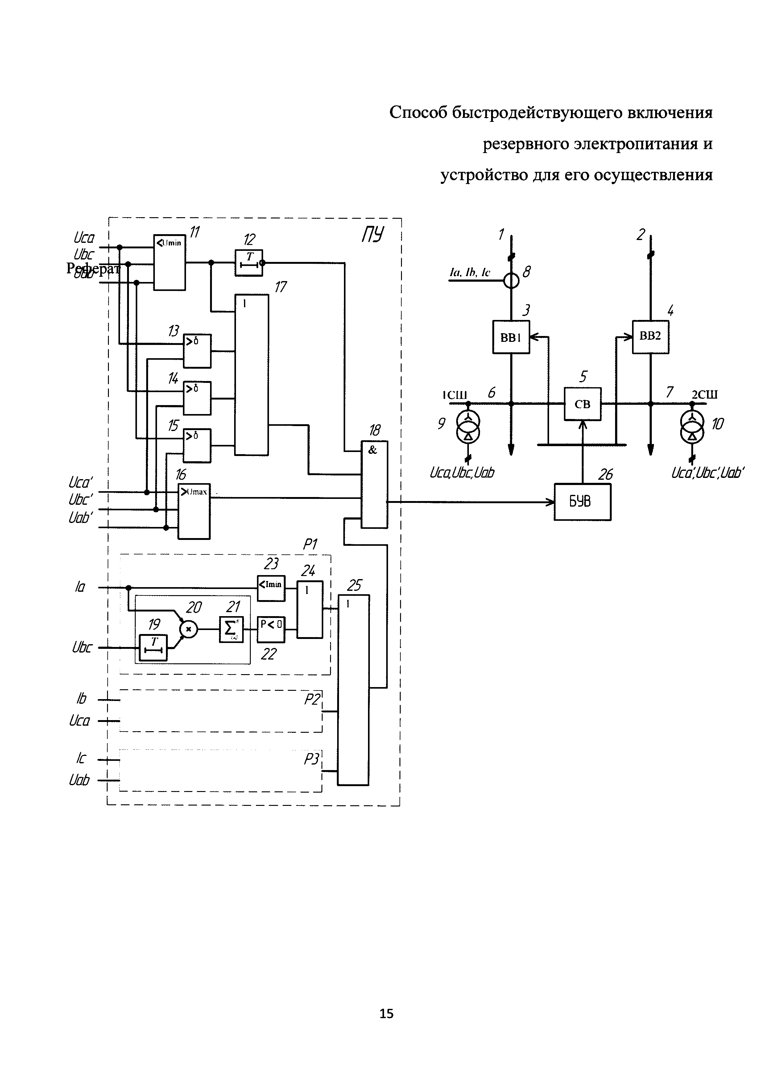 Способ быстродействующего включения резервного электропитания и устройство для его осуществления относится к электротехнике и, в частности, к устройствам противоаварийной автоматики подстанций напряжением 6-35 кВ. Способ и устройство позволяют увеличить достоверность выявления аварийных режимов в цепях электроснабжения подстанции, исключить ложные срабатывания и уменьшить временя переключения потребителей на резервный источник. Способ заключается в измерении напряжения и тока прямой последовательности шин основного и резервного источников питания, угла между векторами напряжения прямой последовательности шин основного и резервного источников питания, определении направления мощности на вводе основного и резервного источников, переключении секции шин с основного на резервный источник питания при изменении знака мощности хотя бы в одной фазе или уменьшении тока ввода любой фазы ниже заданного значения и одновременном уменьшении напряжения прямой последовательности шин основного источника питания ниже заданного уровня или при увеличении угла между векторами напряжения прямой последовательности вводов больше заданного, в то время как линейные напряжения на резервном вводе превышают заданное значение; согласно изобретению при снижении на основном вводе одного или нескольких линейных напряжений ниже заданного значения и отсутствии условий для срабатывания пускового устройства в течение заданного интервала времени Т пусковое устройство блокируют до момента восстановления напряжений на этом вводе, а для определения направления мощности значения тока фазы умножают на задержанные на время Т значения линейного напряжения между двумя другими фазами этого же ввода, полученные значения интегрируют, определяют знак результата, при этом время задержки Т выбирают с учетом периода промышленной частоты и заданного угла максимальной чувствительности. Устройство содержит основной [1] и резервный [2] источники питания, вводные выключатели рабочих вводов [3] и [4], секционный выключатель [5], секции шин подстанции [6] и [7], трехфазный трансформатор тока [8] на вводе основного источников питания, трансформаторы напряжения [9], [10] на шинах основного и резервного источников питания, быстродействующее пусковое устройство (ПУ), блок управления выключателями [26]. Быстродействующее пусковое устройство содержит: релейный блок минимального напряжения [11], элемент выдержки времени [12], релейные блоки определения угла между векторами прямой последовательности основного и резервного источников питания [13]-[15], релейный блок максимального напряжения [16], логический элемент «4ИЛИ» [17], логический элемент «4И» [18], блоки определения направления фазной мощности Р1-Р3, каждый из которых состоит из линии задержки [19], умножителя [20], сумматора-накопителя [21], блока определения знака [22], блока определения минимального тока [23], логического элемента «2ИЛИ» [24], выходы которых объединены логическим элементом «3ИЛИ» [25]. Логический элемент «4И» объединяет своими входами инверсный выход элемента выдержки времени [12], выход логического элемента «4ИЛИ» [17], выход релейного блока максимального напряжения [16], выход логического элемента «3ИЛИ» [25]. 2 н.п. ф-лы, 1 ил.