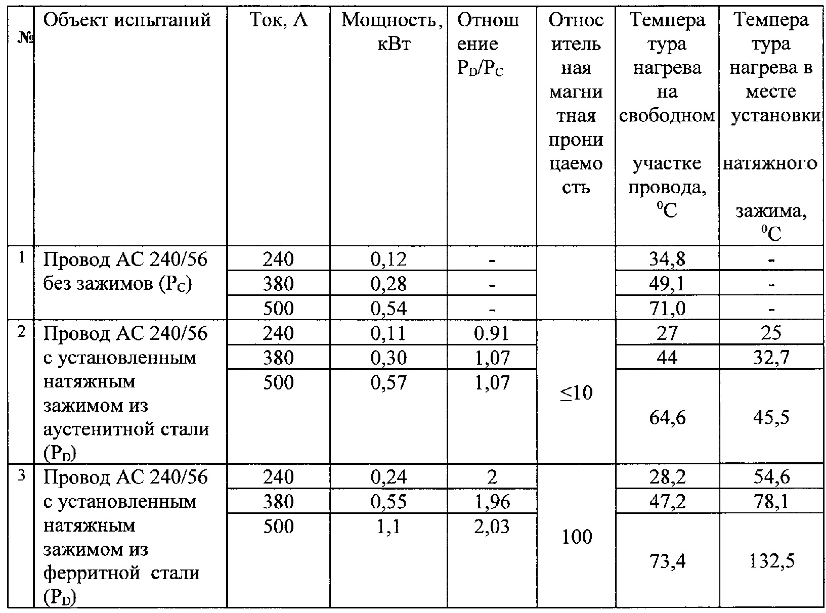 Изобретение относится к области электроэнергетики, а именно к линейным спиральным зажимам, предназначенным для крепления, соединения и ремонта неизолированных или изолированных проводов воздушных линий электропередачи. Практика широкого применения линейной спиральной арматуры на воздушных линиях электропередачи выявила ее существенный недостаток в части резкого возрастания потерь мощности на перемагничивание при ее закреплении на неизолированных и изолированных проводах линий, что также ведет к перегреву и снижению их механической прочности, а также в конечном счете к уменьшению пропускной способности воздушных линий электропередачи. Авторы ставили перед собой задачу решения проблемы существенного снижения потерь мощности на перемагничивание в неизолированных и изолированных проводах воздушных линий электропередачи со спиральными натяжными, соединительными и ремонтными зажимами. Данный положительный технический результат был достигнут за счет совокупности существенных признаков линейного спирального зажима, представленной в нижеследующей формуле изобретения: «линейный спиральный зажим для крепления, соединения и ремонта неизолированных или изолированных проводов воздушных линий электропередачи, содержащий конструктивные элементы в виде проволочных спиралей, охватывающих неизолированный или изолированный провод с наружной поверхности одним или несколькими слоями, при этом по меньшей мере одним слоем вышеупомянутые проволочные спирали выполнены из немагнитной стали аустенитного класса, имеющей относительную магнитную проницаемость не более 10, временное сопротивление разрыву не менее 900 МПа». Заявляемый линейный спиральный зажим (натяжной, соединительный, ремонтный или протектор) для крепления, соединения и ремонта неизолированных или изолированных проводов воздушных линий электропередачи выполняется из конструктивных элементов в виде проволочных спиралей, которые навиваются на неизолированные или изолированные провода с их наружной поверхности, например, в несколько слоев. Проволочные спирали изготавливаются из немагнитной стали аустенитного класса с определенными характеристиками, а именно: немагнитная сталь имеет относительную магнитную проницаемость не более 10, а ее временное сопротивление разрыву составляет не менее 900 МПа. Выполнение конструктивных элементов (проволочных спиралей) линейных спиральных зажимов из немагнитной стали аустенитного класса с вышеуказанными характеристиками позволяет значительно уменьшить потери мощности на перемагничивание в неизолированных и изолированных проводах воздушных линий электропередачи, что практически исключает перегрев проводов в процессе эксплуатации и в конечном итоге способствует увеличению пропускной способности воздушных линий электропередачи. Заявитель провел испытания на определение механической прочности заделки провода в зажиме и на перемагничивание, результаты которых представлены в следующих примерах реализации настоящего изобретения. Пример 1 Магнитная проницаемость Относительная магнитная проницаемость аустенитных сталей μ/μ0≤10 μ=(1,26÷8,8)10-6 Гн/м - аустенитные стали μ0=4π 10-7 Относительная магнитная проницаемость ферритных сталей μ/μ0≥100. Пример снижения потерь мощности и снижения температуры нагрева 