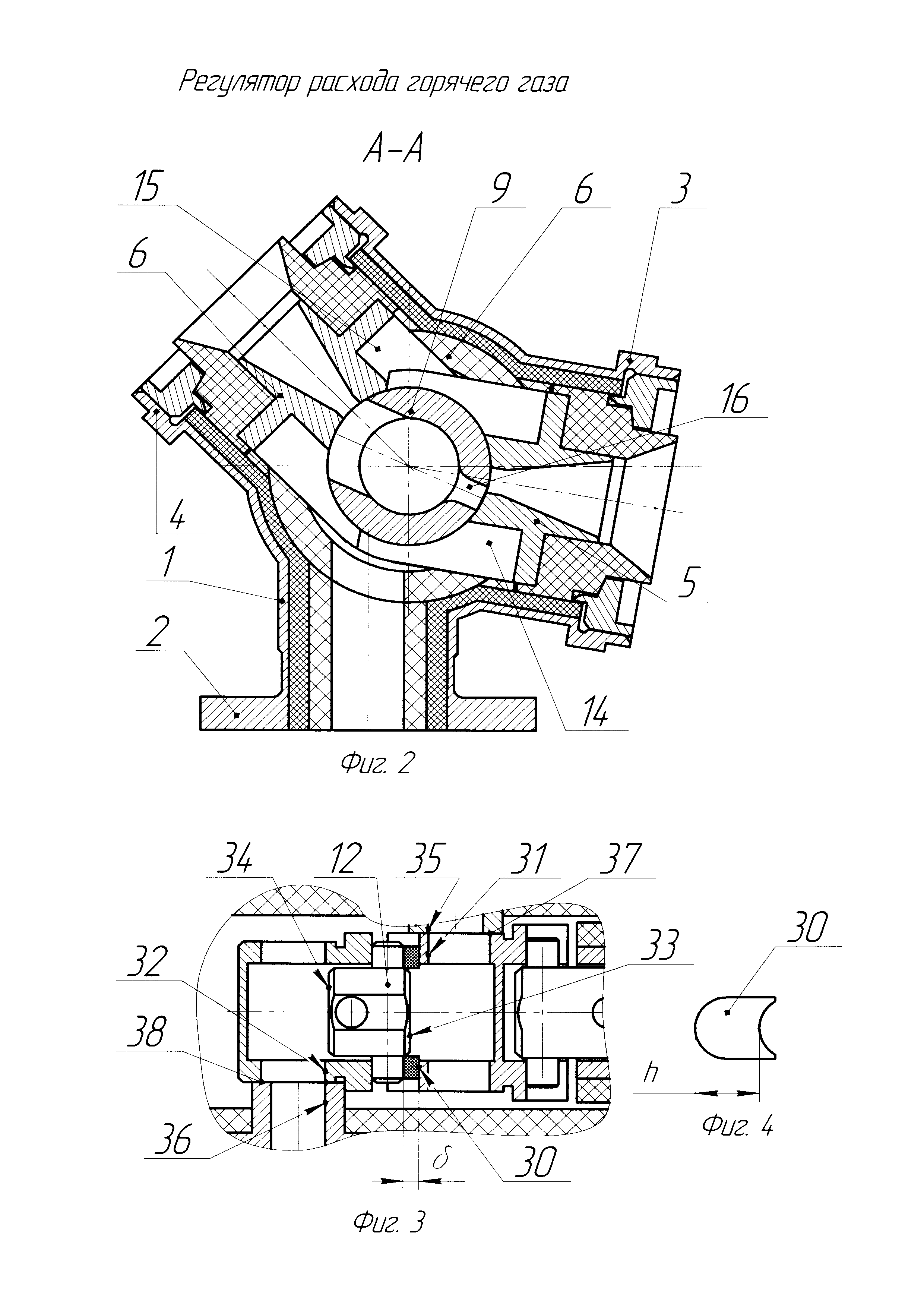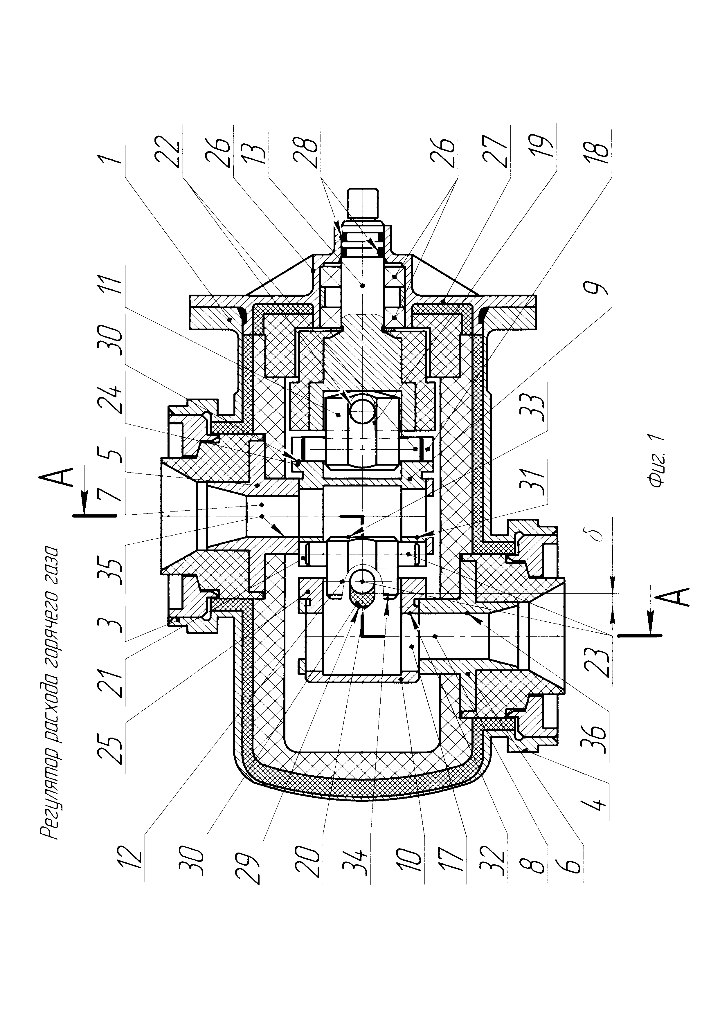 1. Регулятор расхода горячего газа, содержащий теплоизолированный корпус с входным и двумя выходными патрубками, в которые установлены основное и дополнительное седла с расходными отверстиями, на седлах с обеих сторон от их расходных отверстий выполнены ребра, в которых выполнены цилиндрические отверстия, контактирующие с основной и дополнительной заслонками по взаимообращенным цилиндрическим поверхностям, заслонки через основную и дополнительную карданные муфты соединены с валом, соосным с цилиндрическими поверхностями заслонок и седел, на обеих заслонках со стороны, обращенной к валу, выполнены опорные приливы, при этом диаметр опорного прилива на основной заслонке превышает диаметр цилиндрического отверстия ребер основного седла, а диаметр опорного прилива на дополнительной заслонке меньше диаметра цилиндрического отверстия ребер основного седла и больше диаметра цилиндрического отверстия ребер дополнительного седла, обе карданные муфты снабжены штифтами, расположенными во взаимно перпендикулярных плоскостях и установленными по посадке в пазах, выполненных в валу и заслонках, при этом пазы имеют глухие торцы, а заслонки установлены с осевым люфтом и в них выполнены расходные отверстия, ширина которых в осевой плоскости превышает ширину расходных отверстий седел, отличающийся тем, что между глухими торцами пазов дополнительной заслонки и штифтом дополнительной карданной муфты расположен упругий элемент из сгораемого материала, толщина которого в осевом направлении больше суммарного осевого люфта заслонок, причем кромки расходных отверстий каждой из заслонок, ближайшие друг к другу, и торцы дополнительной карданной муфты не перекрывают кромки расходных отверстий также ближайших друг к другу седел, а обе заслонки с торцов, обращенных друг к другу, выполнены с глухими отверстиями, соосными с осью вала и минимальная глубина которых превышает минимальное расстояние от кромок расходных отверстий заслонок, наиболее удаленных от дополнительной карданной муфты. 2. Регулятор расхода горячего газа по п. 1, отличающийся тем, что упругий элемент из сгораемого материала, толщина которого больше суммарного осевого люфта заслонок, установлен между глухими торцами пазов основной заслонки и штифтом дополнительной карданной муфты. 3. Регулятор расхода горячего газа по пп. 1, 2, отличающийся тем, что упругий элемент выполнен эквидистантно профилю зазора между штифтом и глухим торцом паза. 4. Регулятор расхода горячего газа по пп. 1, 2, отличающийся тем, что упругий элемент выполнен из резины. 5. Регулятор расхода горячего газа по пп. 1, 2, 3, отличающийся тем, что упругий элемент из сгораемого материала установлен на клеевом составе, при этом клеевой состав расположен между упругим элементом и штифтами дополнительной карданной муфты.