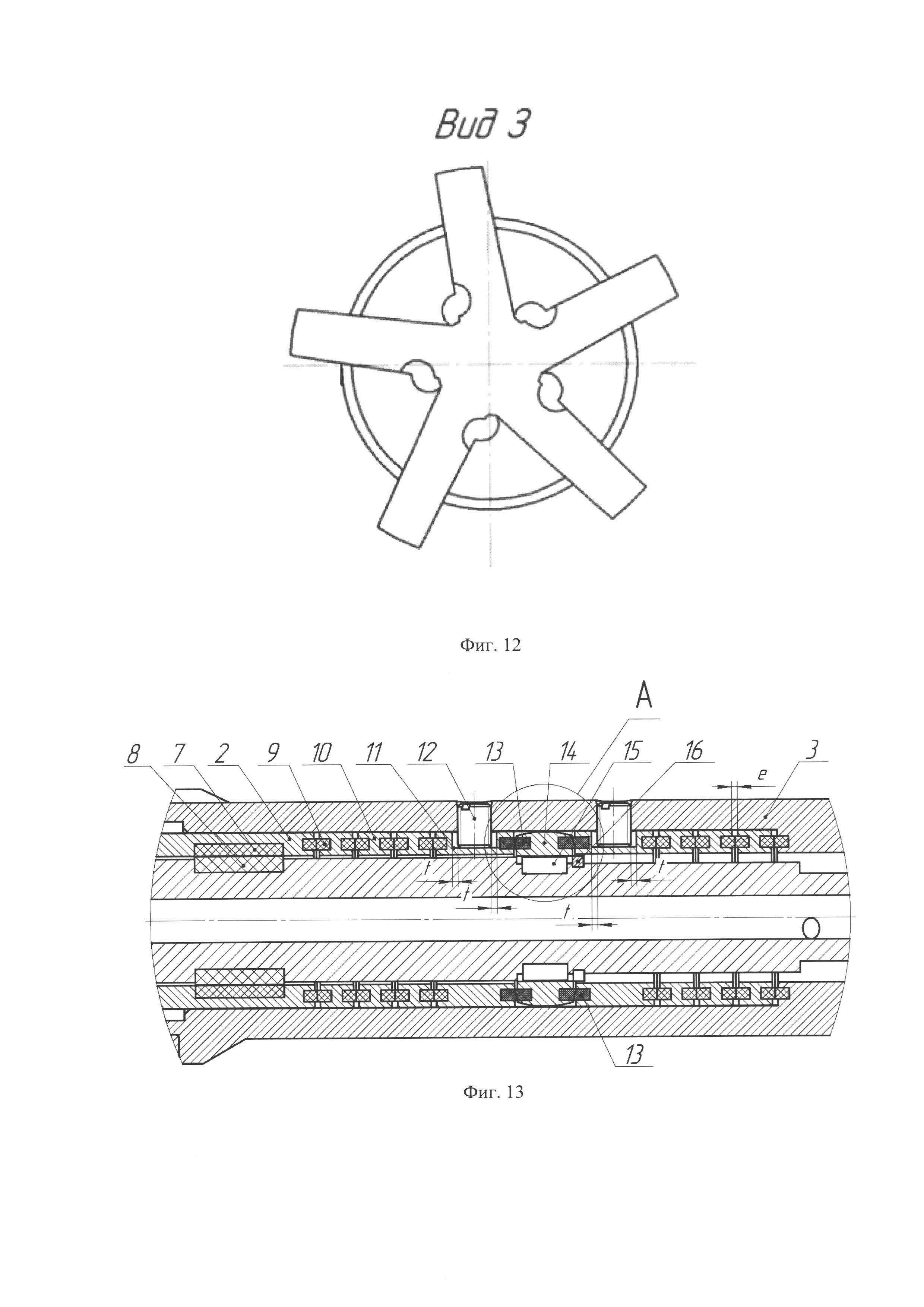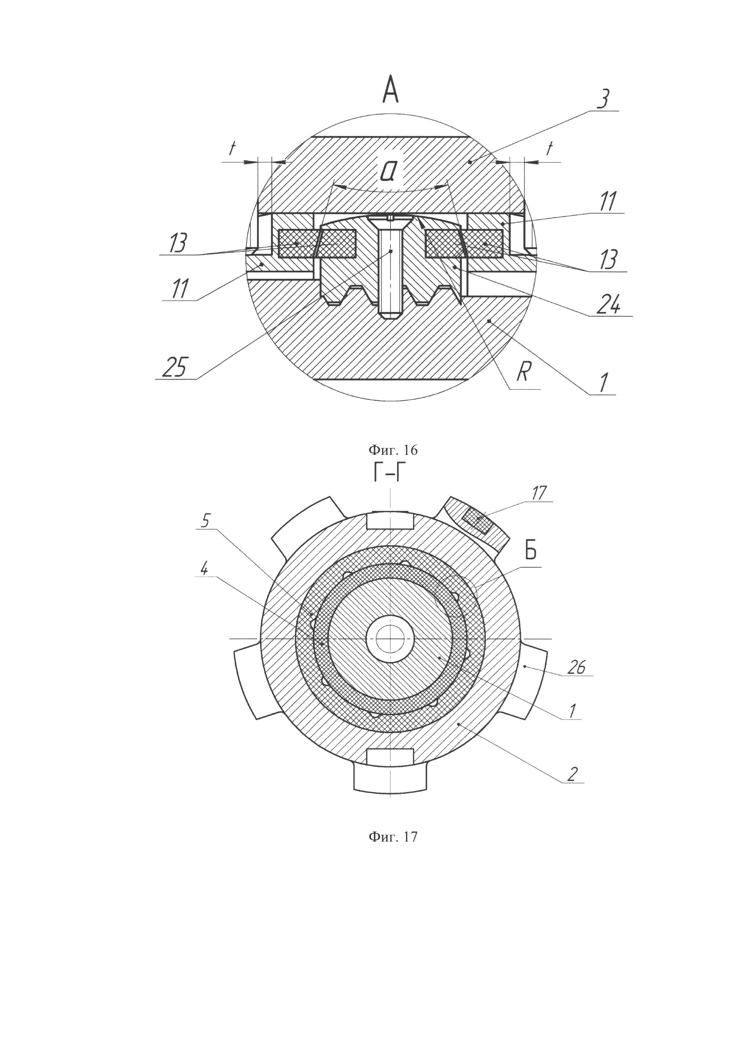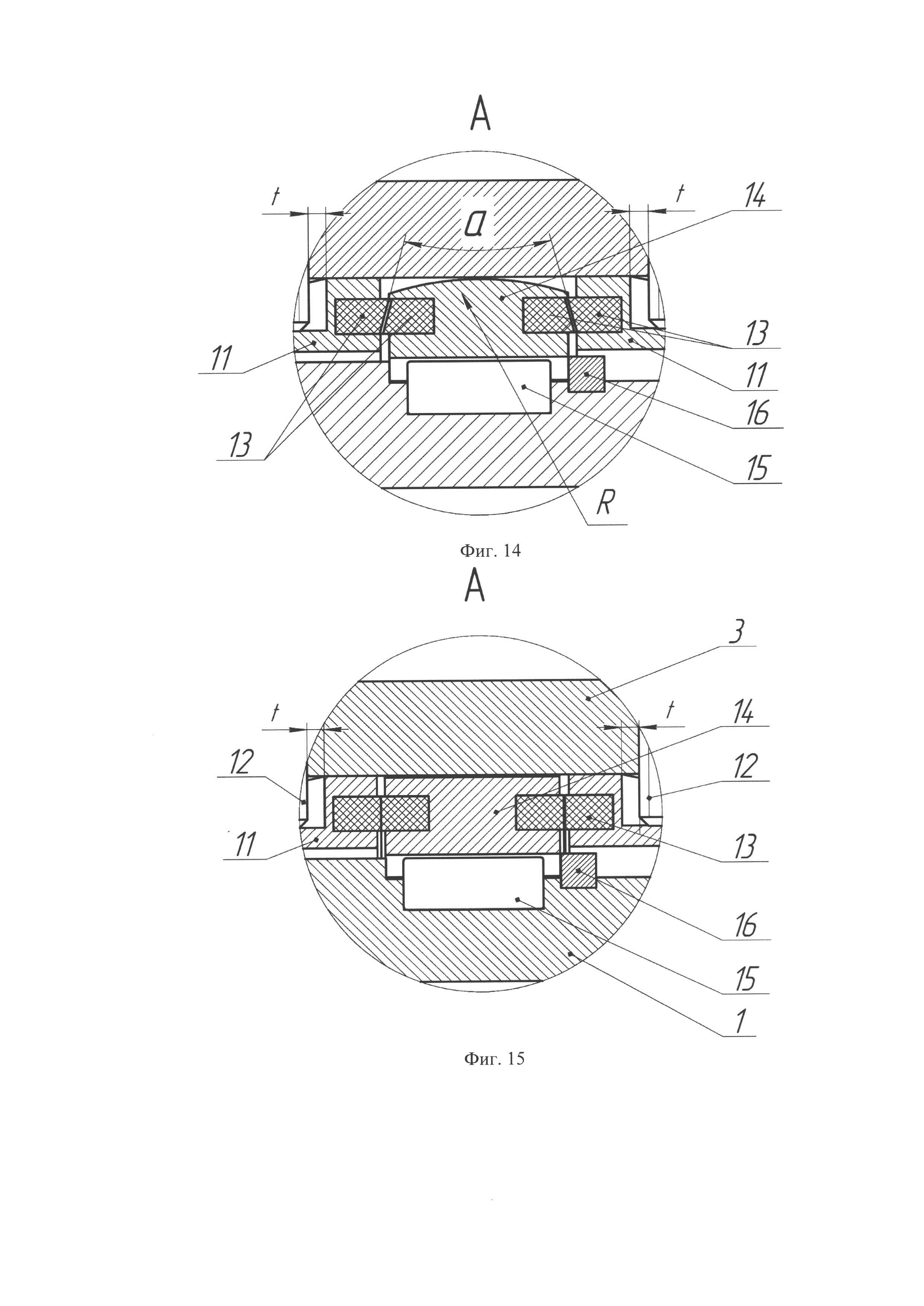 оптимальными коэффициентами передачи Kn и динамичности. Далее устанавливают нижний подпятник (1) 1, пяту (14) с использованием шпоночного (15) или шлицевого соединения (не показано) и фиксируют сборку пружинным кольцом (16). Установка осевой опоры заканчивается размещением на опорной поверхности пяты верхнего подпятника (11). Окончательно, набирается верхний комплект виброгасителей с необходимыми механическими параметрами и качественными и количественными характеристиками, с учетом возможной синхронной работы с «нижним» комплектом и всем модулем в целом. Сборку виброгасителей ведут селективно.