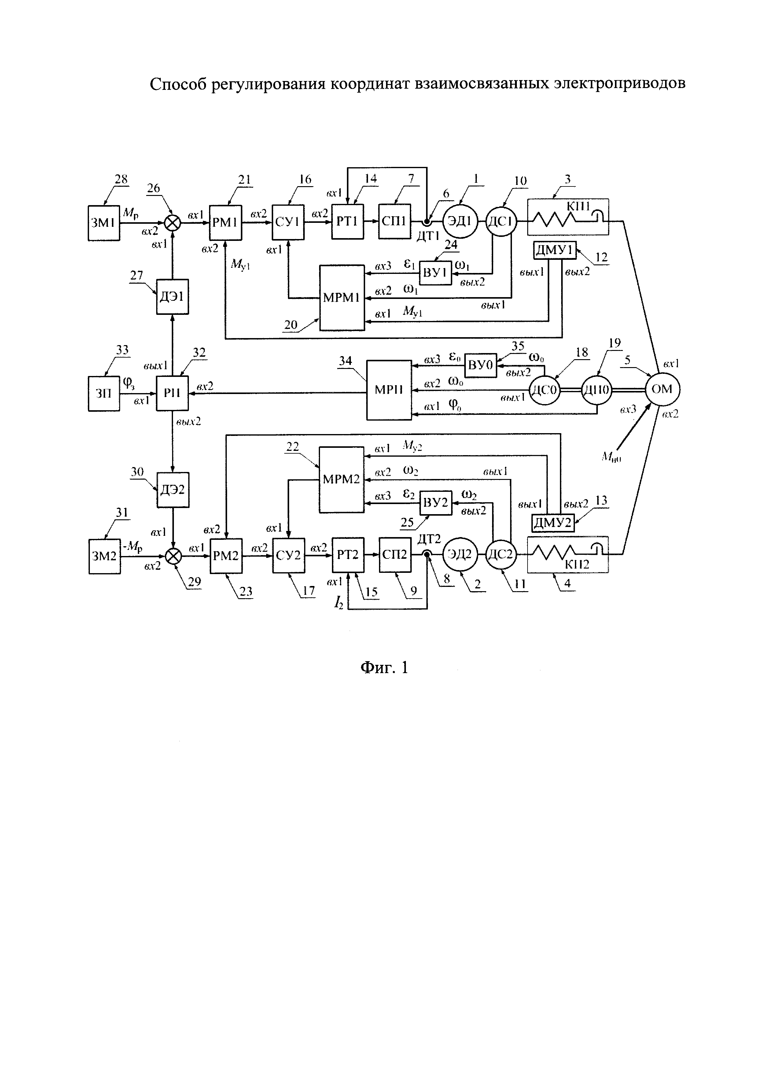 Способ регулирования координат взаимосвязанных электроприводов с упругими звеньями и зазорами в кинематических передачах по принципу электромеханического распора, включающий формирование токов, моментов распора и движущих моментов электроприводов и регулирование целевой координаты общей массы контуром, общим для всех электроприводов, причем темп регулирования движущих моментов и моментов распора устанавливают единым и выше темпа регулирования целевой координаты, отличающийся тем, что формирование токов каждого электропривода осуществляют контурами регулирования токов, индивидуальными для каждого электропривода, при этом динамику регулирования токов корректируют последовательными регуляторами, затем формирование моментов распора и движущих моментов электроприводов осуществляют внешними и внутренними контурами регулирования моментов упругости кинематических передач, индивидуальными для каждого электропривода, при этом динамику регулирования моментов распора и движущих моментов каждого электропривода корректируют параллельными регуляторами внутренних контуров в зависимости от координат электрических двигателей и кинематических передач, затем динамику формирования моментов распора и движущих моментов каждого электропривода корректируют последовательными регуляторами внешних контуров, далее динамику и точность регулирования целевой координаты корректируют последовательным регулятором и параллельным регулятором контура регулирования целевой координаты в зависимости от координат общей массы.
