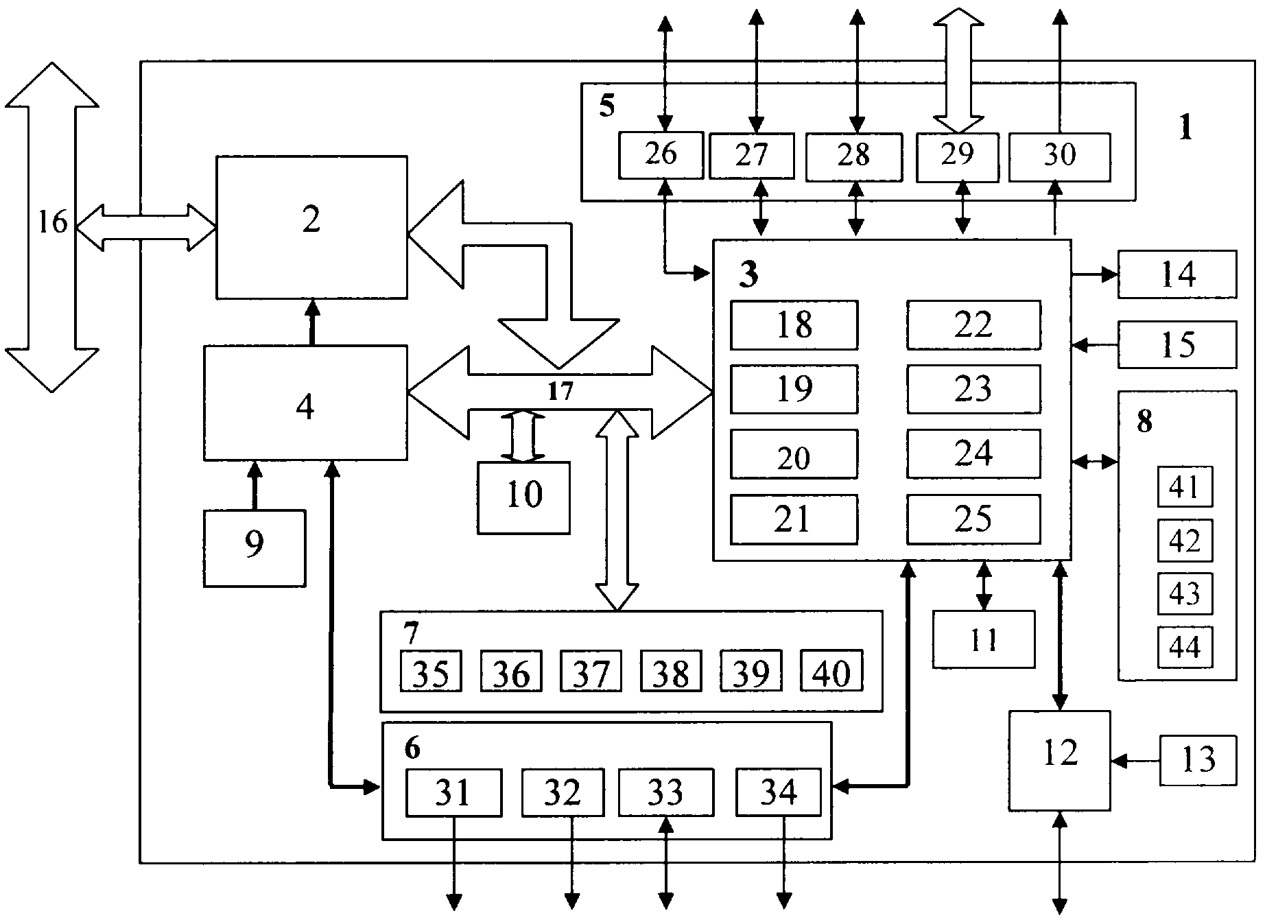 входящим в модуль 6 блокирования внешних устройств. При этом в журнале регистрации событий (в блоке 42 энергонезависимой памяти 8) регистрируется зафиксированная СРД попытка НСД к компьютеру. С помощью блока 25 в микропроцессоре 3 осуществляется поддержка взаимодействия с серверами при работе в режиме удаленного управления, а также при функционировании в системе, построенной по