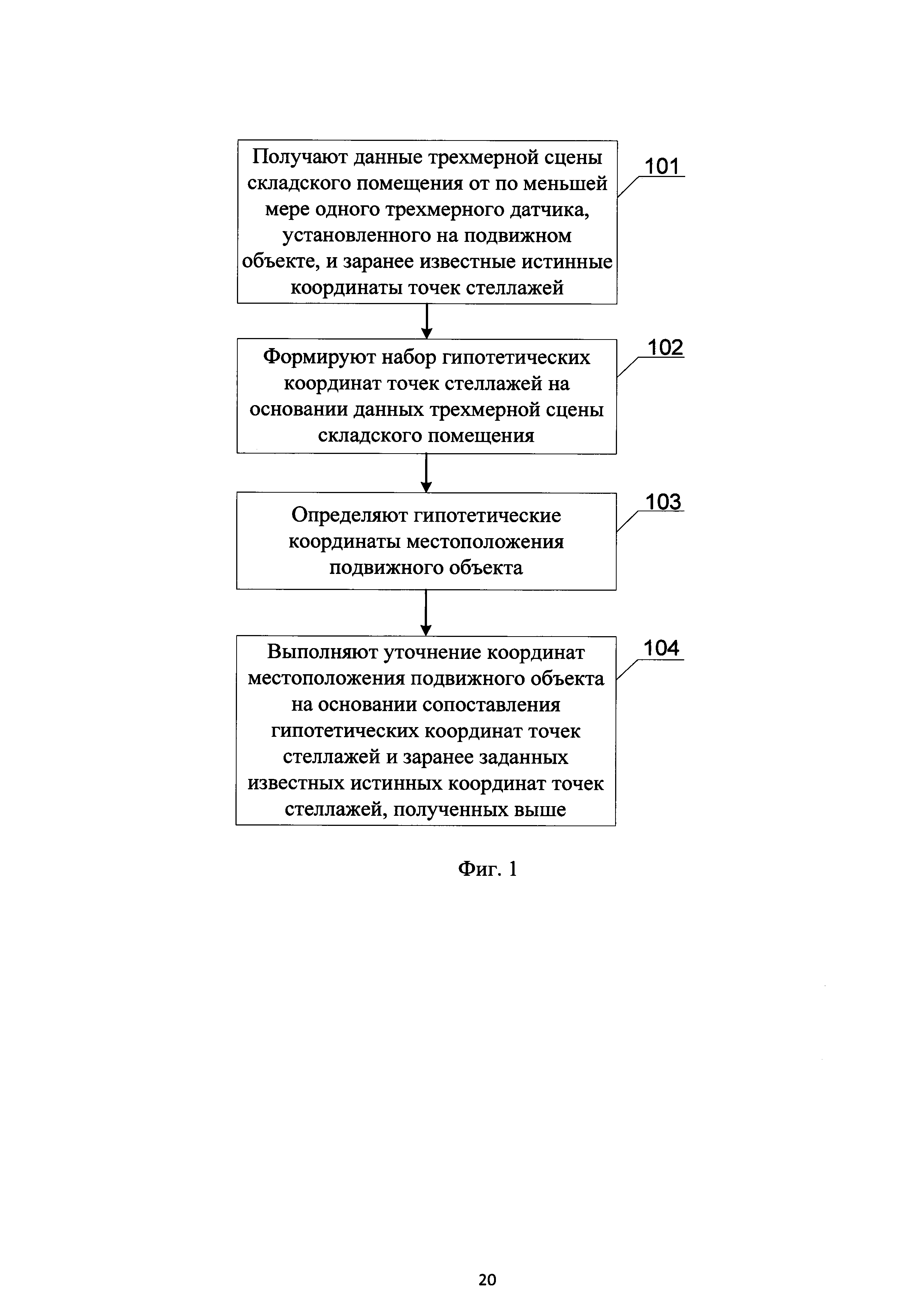 ОБЛАСТЬ ТЕХНИКИ [0001] Данное техническое решение относится, в общем, к вычислительным системам и способам, а в частности к системам и способам навигации подвижных объектов с использованием трехмерных датчиков. УРОВЕНЬ ТЕХНИКИ [0002] Из уровня техники известен патент US 20130096735 A1 «Warehouse vehicle navigation system and method», патентообладатель: Vocollect, Inc., дата публикации: 18.04.2013. [0003] Навигационная система, описанная в патенте, базируется на видеокамере, а складское транспортное средство при этом предусматривает обязательное присутствие человека на борту. Также, хотя в названии заявлено понятие складского робота в широком смысле, по факту описание касается транспортировочной тележки для процедуры "пикинга" (сбора мелкооптового либо розничного заказа с первого яруса стеллажей). При этом способ и система навигации предусматривают необходимость маркировки каждой стойки уникальным цифровым кодом физически (т.е. по сути, уникальным маркером), а через видеокамеру осуществляется распознавание этого кода и идентификация местоположения робота. Таким образом, осуществляется навигация в продольном движении вдоль стеллажей. Расстояние до стеллажа, согласно способу, определяется по детекции афинного преобразования прямоугольной карточки маркера. [0004] Из-за отсутствия коррекции изображения в данном техническом решении увеличивается погрешность данных. Также к недостаткам следует отнести то, что техническое решение предполагает близкое к идеальному фронтальное расположение маркера перед камерой, которое трудно достижимо в реальных условиях складского помещения. СУЩНОСТЬ ИЗОБРЕТЕНИЯ [0005] Данное техническое решение направлено на устранение недостатков, свойственных решениям, известным из уровня техники. [0006] Технической задачей, решаемой в данном техническом решении, является создание способа навигации подвижного объекта внутри складского помещения, фиксирующего априорно известную структуру стеллажа. [0007] Техническим результатом является повышение точности навигации подвижного объекта внутри складского помещения. Достижение указанного технического результата доказано в рамках испытаний данного технического решения на данных, снятых на реально функционирующем складе дистрибуции, в частности предлагаемое техническое решение позволило улучшить точность навигации на 7 см (ошибка уменьшена с 10 см до 3 см). Это проиллюстрировано на Фиг. 6. [0008] Дополнительно повышается надежность функционирования системы. [0009] Указанный технический результат достигается благодаря способу навигации подвижного объекта с использованием трехмерных датчиков, в котором получают данные трехмерной сцены складского помещения от по меньшей мере одного трехмерного датчика, установленного на подвижном объекте, и заранее известные истинные координаты точек стеллажей; формируют набор гипотетических координат точек стеллажей на основании данных трехмерной сцены складского помещения; определяют гипотетические координаты местоположения подвижного объекта; выполняют уточнение координат местоположения подвижного объекта на основании сопоставления гипотетических координат точек стеллажей и заранее известных истинных координат точек стеллажей, полученных выше. [00010] В некоторых вариантах осуществления настоящего технического решения трехмерным датчиком является