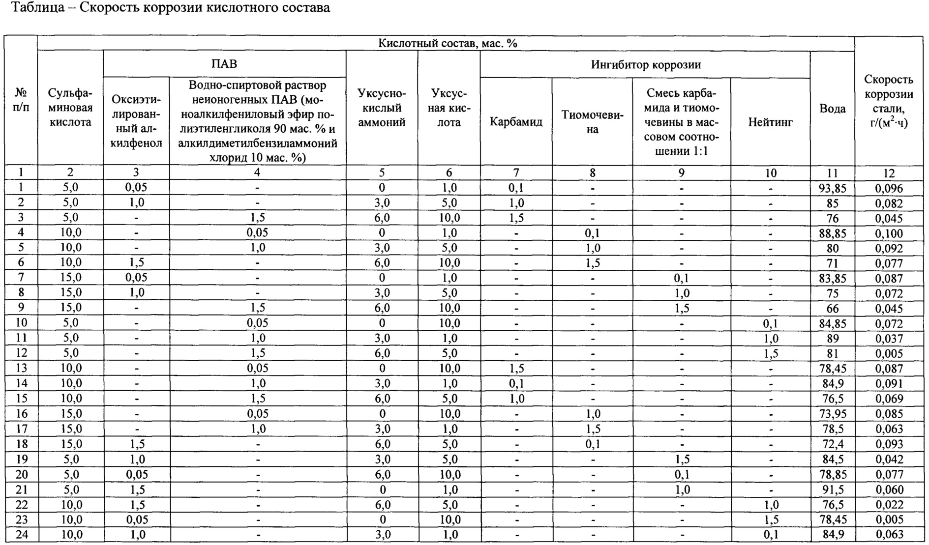 Кислотный состав для обработки призабойной зоны пласта, включающий сульфаминовую кислоту, поверхностно-активное вещество - ПАВ, уксуснокислый аммоний и воду, отличающийся тем, что указанный состав дополнительно содержит уксусную кислоту и ингибитор коррозии при следующем соотношении компонентов, мас.%: в качестве ПАВ используют оксиэтилированный алкилфенол или водно-спиртовой раствор неионогенных ПАВ (моноалкилфениловый эфир полиэтиленгликоля 90 мас.% и алкилдиметилбензиламмоний хлорид 10 мас.%), в качестве ингибитора коррозии - карбамид, или тиомочевину, или смесь карбамида и тиомочевины в массовом соотношении 1:1, или нейтинг.сульфаминовая кислота 5,0-15,0 ПАВ 0,05-1,5 уксуснокислый аммоний 0-6,0 уксусная кислота 1,0-10,0 ингибитор коррозии 0,1-1,5 вода с минерализацией не более 1 г/дм3 остальное,