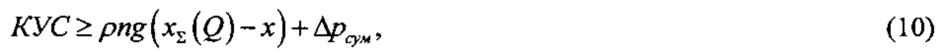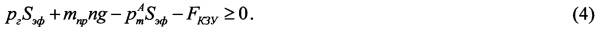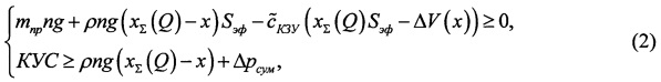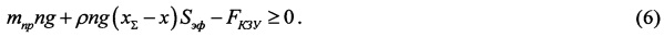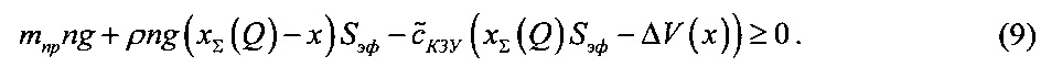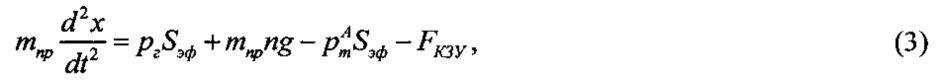 - приведенная масса подвижной части конструкции КЗУ, n - модуль вектора суммарной перегрузки, g - ускорение свободного падения, ρ - плотность топлива, х - величина перемещения конструкции КЗУ в процессе уменьшения объема относительно исходного состояния, x∈[0;xmax], xmax - перемещение конструкции КЗУ при максимальном уменьшении объема, объемный расход топлива из бака, xΣ - перемещение поверхности раздела «газ-топливо» в баке относительно исходного положения конструкции КЗУ, Sэф - эффективная площадь КЗУ в направлении вектора суммарной перегрузки,