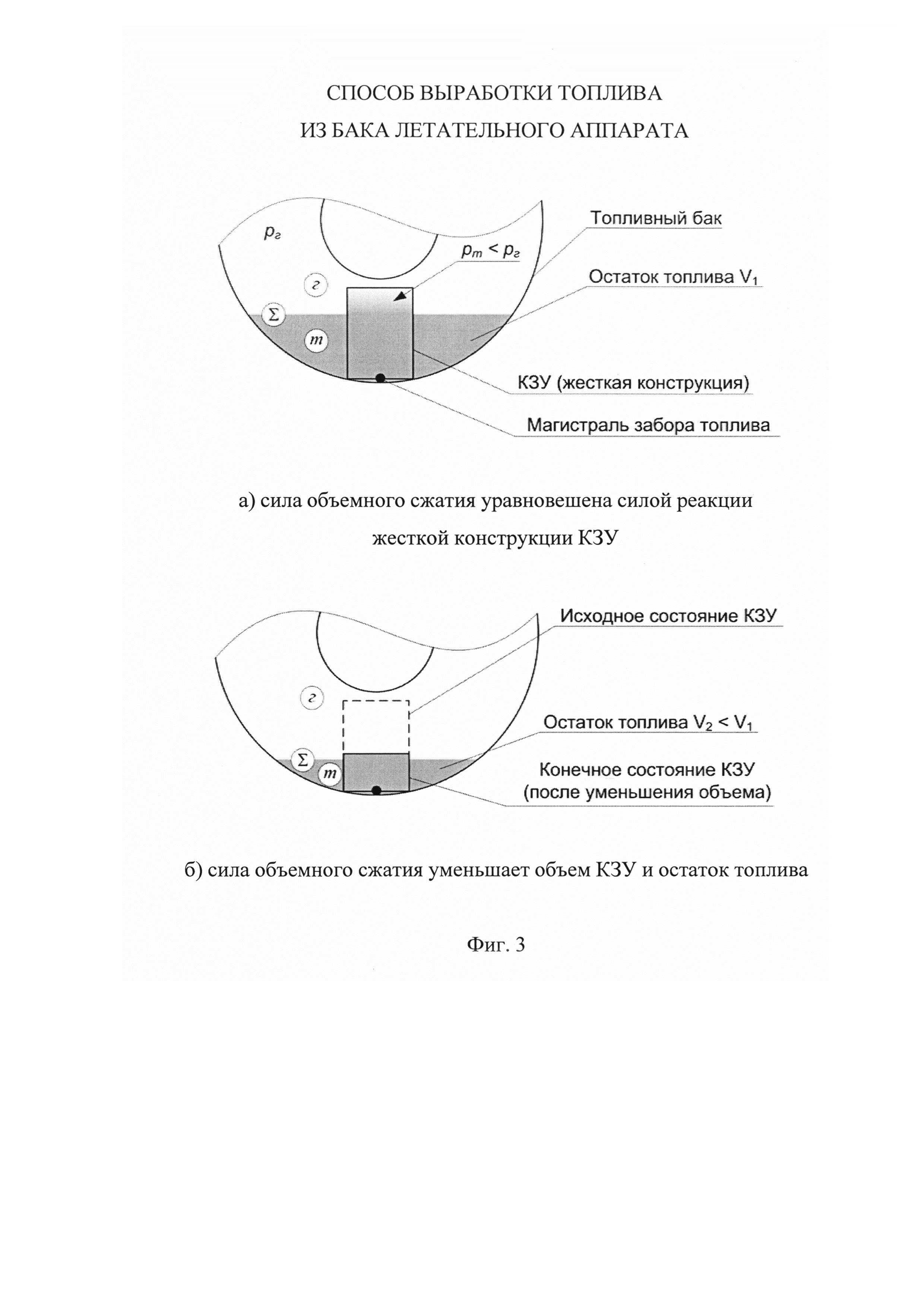 1. Способ выработки топлива из бака летательного аппарата, оснащенного капиллярным заборным устройством (КЗУ), заключающийся в том, что выработку топлива из бака проводят через КЗУ до объема остатка топлива в баке, определяемого удерживающей способностью и гидравлическим сопротивлением капиллярного фазового разделителя (КФР), отличающийся тем, что в процессе выработки топлива уменьшают объем КЗУ так, чтобы его высота над уровнем топлива в баке в направлении действия перегрузки hст была меньше высоты гидростатического столба, удерживаемого силами поверхностного натяжения КФР 2. Способ по п. 1, отличающийся тем, что в процессе выработки топлива для уменьшения объема используют неуравновешенные силы объемного сжатия при появлении перепада давления между внутренней полостью КЗУ, расположенной над уровнем топлива, и газовой полостью бака, возникающие при выполнении системы неравенств где