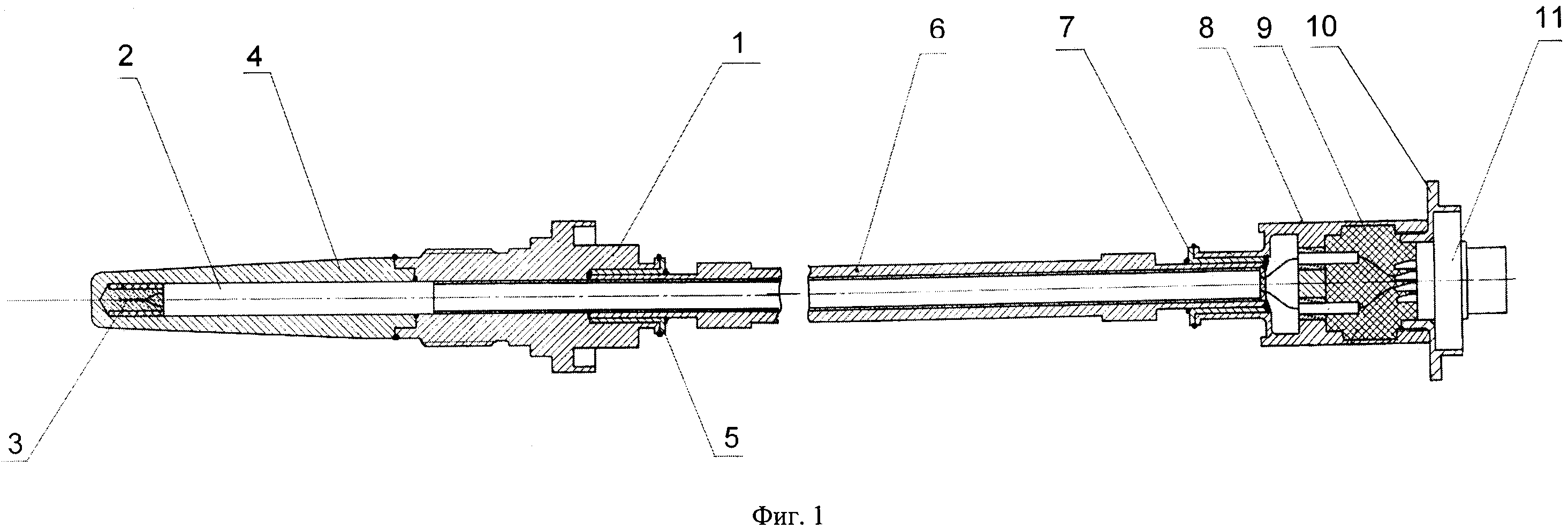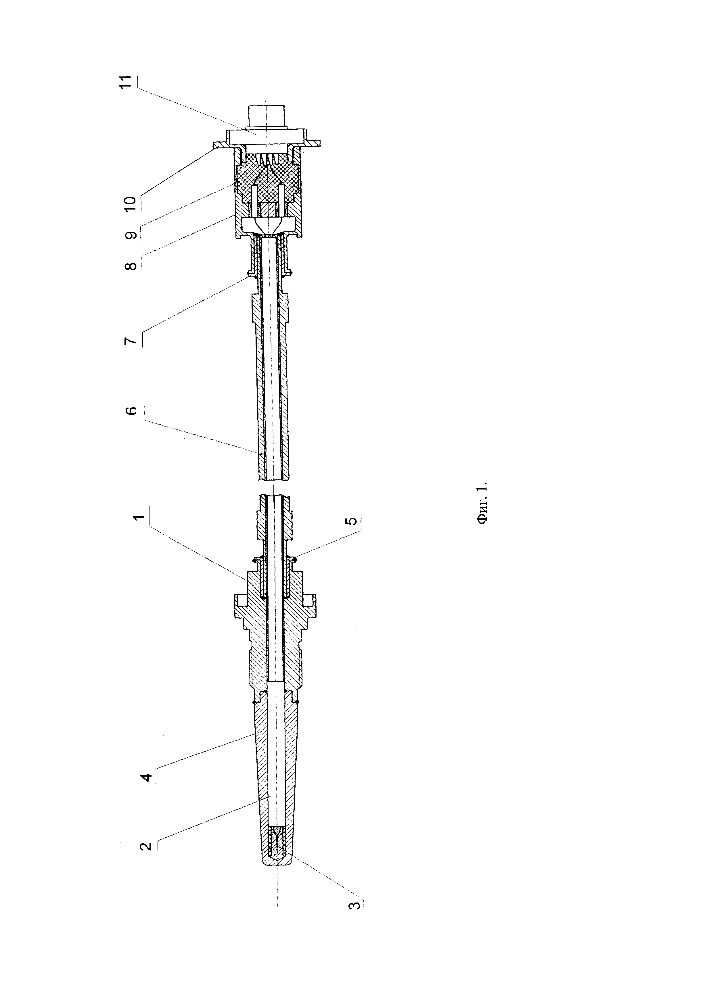 Изобретение относится к термометрии и может быть использовано для измерения температуры высокотемпературных процессов в газодинамике в условиях воздействия высоких давлений и газодинамического напора. Известно устройство с высокотемпературной термопарой с защитным наконечником, которое способно обеспечить с допустимой погрешностью многократные измерения в среде с температурой 1500-1600°С. Среда измерения при этом характеризуется высоким уровнем механического воздействия и избыточного давления на термопару (Данишевский Д.С., Сведе-Швец Н.И. Высокотемпературные термопары, М., Металлургия, 1977, с. 117-120). Однако, известное устройство, хотя и обеспечивает защиту термопары от указанных воздействий среды за счет введения защитного наконечника, но обладает недостаточной надежностью, т.к. в случае нарушения механической целостности защитного наконечника происходит разрушение термопарных проводов, прорыв высокотемпературных газов во внешнюю среду с возможностью разрушения и возгорания элементов внешних конструкций. Из известных устройств наиболее близким по технической сущности к заявляемому является устройство, описанное в патенте РФ №2467295, кл. G01K 7/16, 2012 г. Данное устройство включает контрольный узел давления, связанный через канал контроля с термопреобразователем, состоящим из термопары в защитной гильзе с посадочным фланцем, обеспечивающим герметичное соединение термопары в защитной гильзе с технологической установкой. Устройство имеет канал контроля давления, который выполнен в виде промежуточной герметичной полости, образованной между рабочей средой и внешней средой. Посадочный фланец выполнен составным - из силового и контактного фланцев, а промежуточная герметичная полость образована последовательно сообщающимися между собой узким сквозным отверстием в силовом фланце, частью внутренней цилиндрической поверхности уплотнительной прокладки между фланцами, выбранным в силовом фланце горизонтальным узким пазом, ограниченным плоскостью контактного фланца, кольцевой фаской на центральном отверстии силового фланца, зазором между цилиндрической поверхностью этого же отверстия и лыской на посадочной поверхности защитной гильзы в верхней части контактного фланца, а также узким кольцевым зазором между измерительным зондом, его уплотнительным кольцом и защитной гильзой. Однако анализ прототипа выявляет его существенный недостаток, который заключается в его низкой надежности при эксплуатации в условиях воздействия высоких механических нагрузок и давлений со стороны измеряемой газовой среды. Это обусловлено наличием недостаточной степени устойчивости конструкции к воздействию повышенных давлений и механических нагрузок, так как, герметизация магистрали в месте установки термопреобразователя производится преимущественно за счет использования защитной гильзы. Дополнительным разграничителем измеряемой среды от внешней среды является, с одной стороны конструкции, мембрана датчика давления, подсоединенного к каналу контроля давления. С другой стороны, для этого служит, уплотнение выводов термопроводников термопреобразователя. Причем наличие указанных дополнительных разграничителей не приводит к сколь-нибудь существенному повышению надежности конструкции с точки зрения повышения ее надежнос