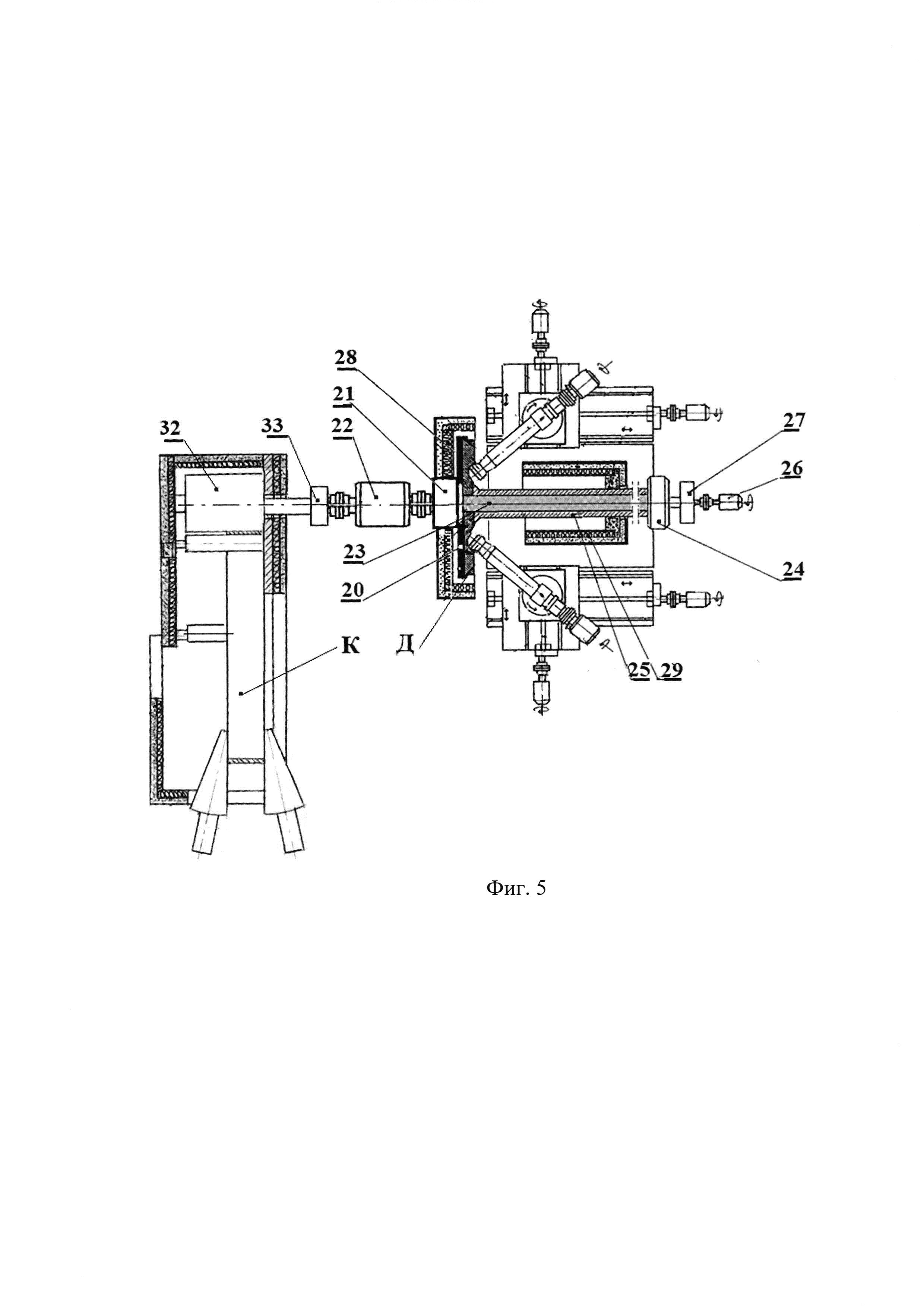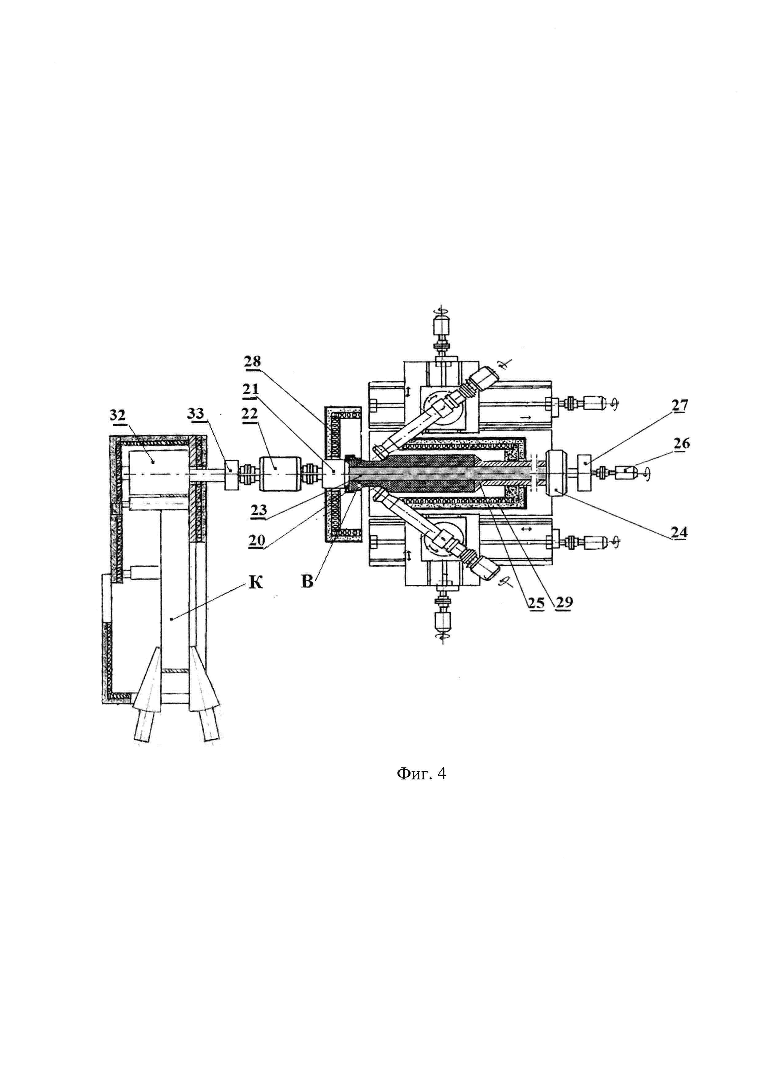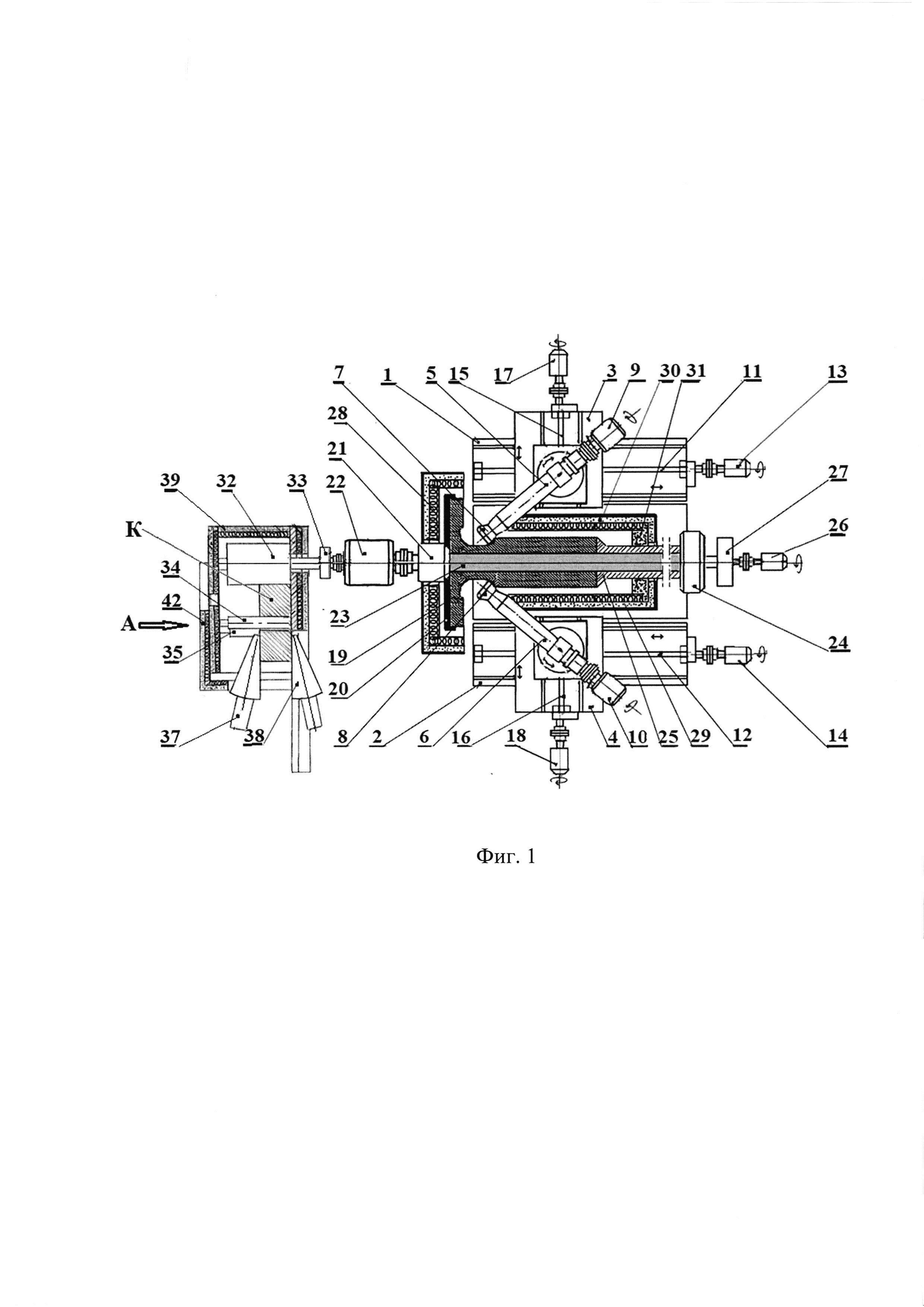Предложение относится к устройствам обработки металлов давлением с целью получения осесимметричных деталей типа ступиц, дисков, валов, колец из жаропрочных сплавов и сталей в изотермических условиях. Известен стан для раскатки осесимметричных деталей газотурбинного двигателя, содержащий стол раскатной на котором установлены каретки продольного перемещения, на которых смонтированы каретки поперечного перемещения раскатных головок с установленными в них раскатными роликами для раскатки валов и дисков с центральным сквозным отверстием, исполнительный механизм вращения заготовок в форме валов и дисков, включающий электродвигатель, механизмы вращения и перемещения раскатных роликов, центральную электропечь для нагрева дисков, цилиндрическую электропечь для нагрева валов и пульт управления. (см. Патент РФ №159169, В21Н1/00, 2016 г.) Согласно этому техническому решению обрабатываемая часть раскатываемой деталь размещена в печи, а раскатные головки с установленными в них раскатными роликами, исполнительные механизмы вращения и перемещения раскатных головок, а также, средства нагрева раскатных зоны деформации - вне печи. Конструкция предложенного стана позволяет изготавливать детали из жаропрочных сплавов различных типоразмеров, включая полые валы, диски и ступицы. Однако раскатка колец больших диаметров невозможна. Техническим результатом предложения является создание универсального стана для раскатки осесимметричных деталей, в том числе одновременной раскатки колец и других деталей газотурбинного двигателя в изотермических условиях, гарантирующих получение необходимой структуры материала и прочностных характеристик. Для достижения указанного результата предложен универсальный стан для раскатки осесимметричных деталей газотурбинного двигателя, содержащий стол раскатной на котором установлены каретки продольного перемещения, на которых смонтированы каретки поперечного перемещения раскатных головок с установленными в них раскатными роликами для раскатки валов и дисков с центральным сквозным отверстием, исполнительный механизм вращения заготовок в форме валов и дисков, включающий электродвигатель, механизмы вращения и перемещения раскатных роликов, центральную электропечь для нагрева дисков, цилиндрическую электропечь для нагрева валов, пульт управления, а также механизм раскатки колец, разъемную камеру нагрева колец и систему охлаждения узлов стана, причем механизм раскатки колец включает неподвижный в радиальном направлении нажимной валок и радиально подвижные валки и ролики для раскатки заготовки кольца, установленные с возможностью их ввода в камеру нагрева колец, состоящую из неподвижного блока и подвижного блока, синхронного перемещающегося с радиально подвижными валками, при этом используют электродвигатель с двумя валами, один из которых кинематически соединен с исполнительным механизмом вращения заготовок в форме валов и дисков, а другой - с нажимным валком механизма раскатки колец, а система охлаждения, включает компрессор для нагнетания воздуха в камеры осушки и охлаждения, управляемые клапаны и, соединенные с пультом управления, управляющие блоки для открытия клапанов для подачи охлажденного воздуха на узлы стана требующие охлаждения по сигналам с пульта управления. Эффекти