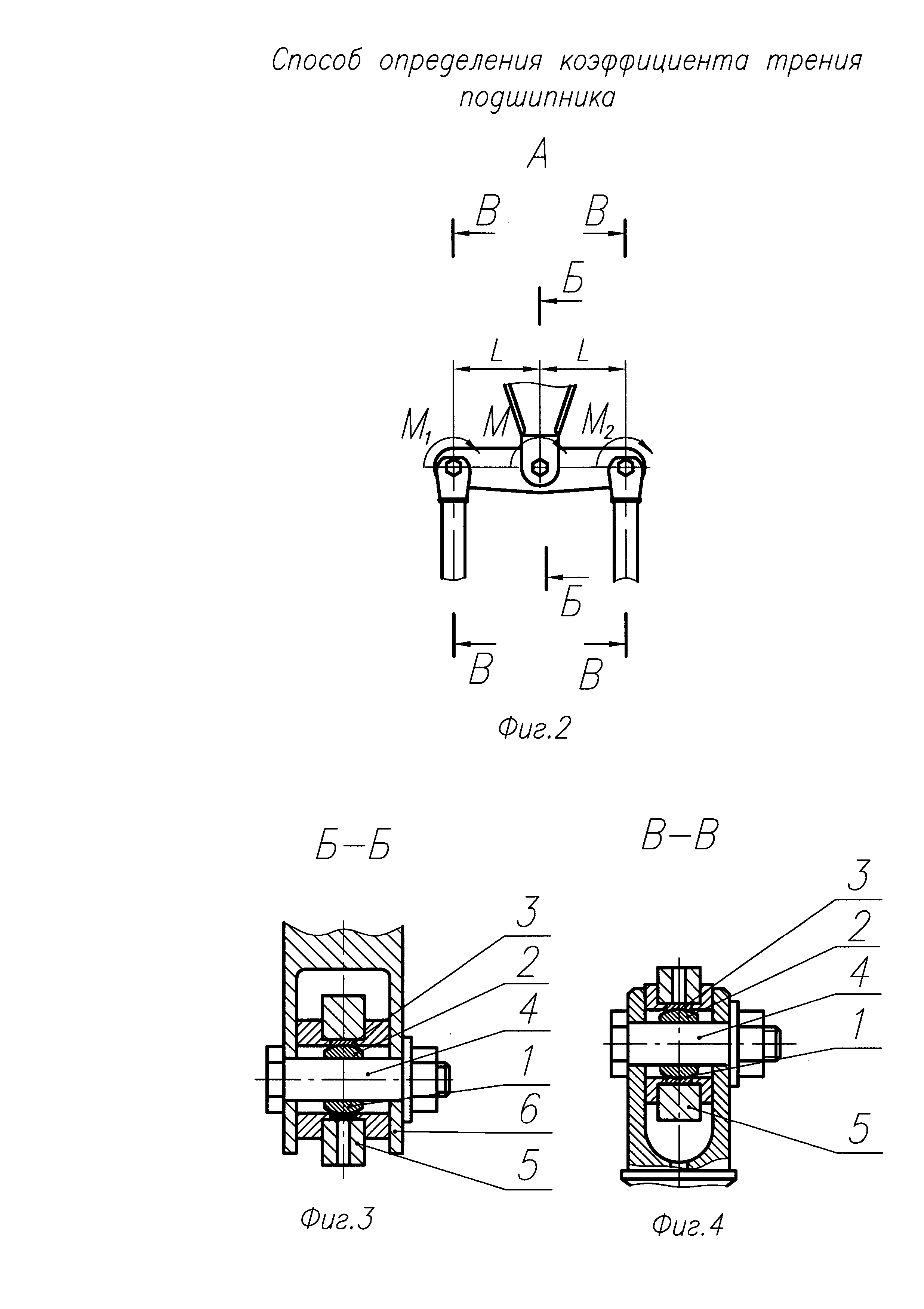 Изобретение относится к способам измерения трения в подшипниках. Способ определения коэффициента трения подшипника заключается в создании усилия на подшипник от нагрузочного устройства. При этом создается дополнительное усилие от силовозбудителя. Причем усилия, приложенные к подшипнику от нагрузочного устройства и от силовозбудителя, создаются на равных, но противоположных плечах с последующим расчетом коэффициента трения по формуле,где F- усилие, приложенное к подшипнику от силовозбудителя; F- усилие, приложенное к подшипнику от нагрузочного устройства; L - плечо приложения силы; D - диаметр подшипника. Техническим результатом является создание устройства, обеспечивающего определение коэффициента трения подшипника. 4 ил.