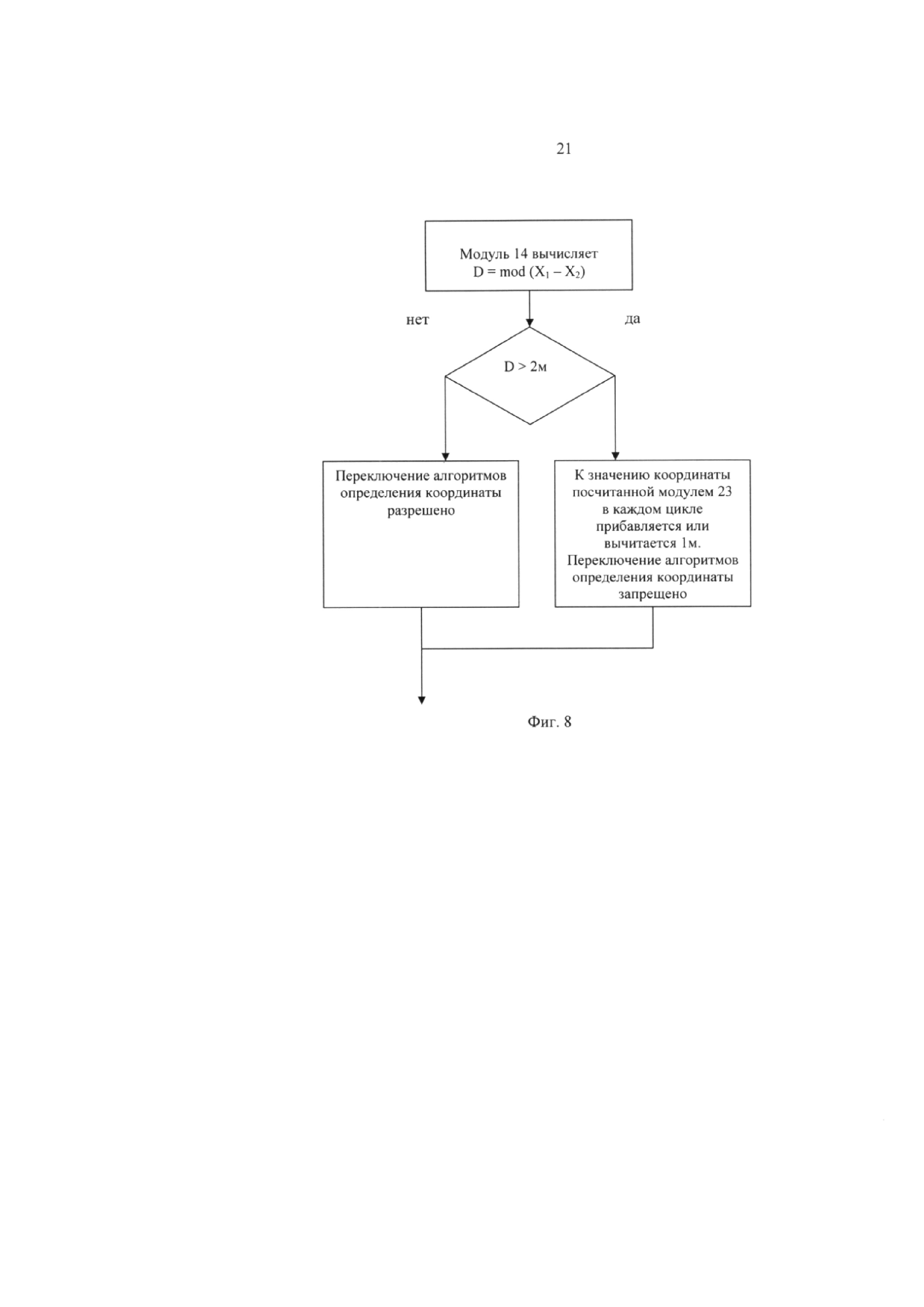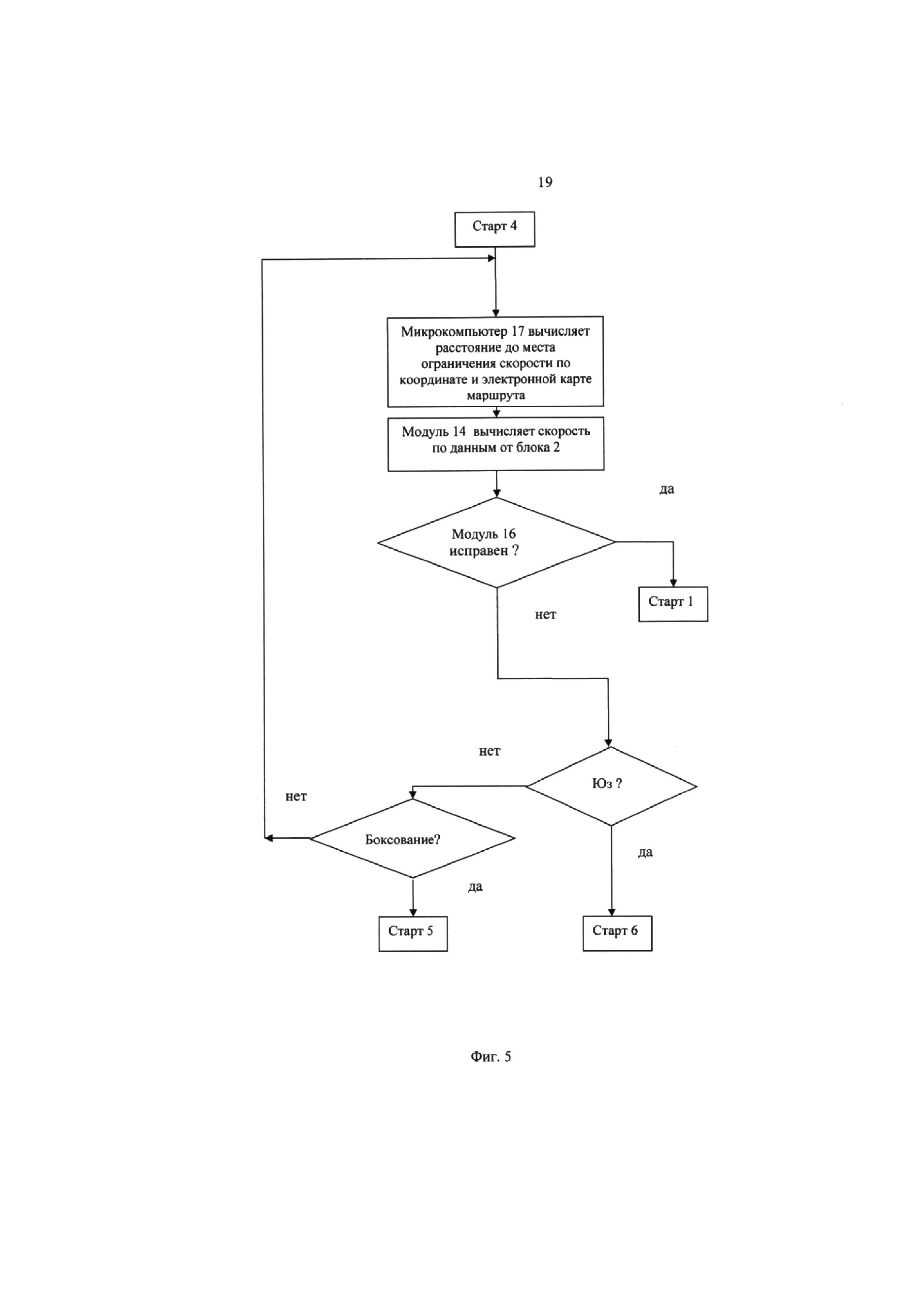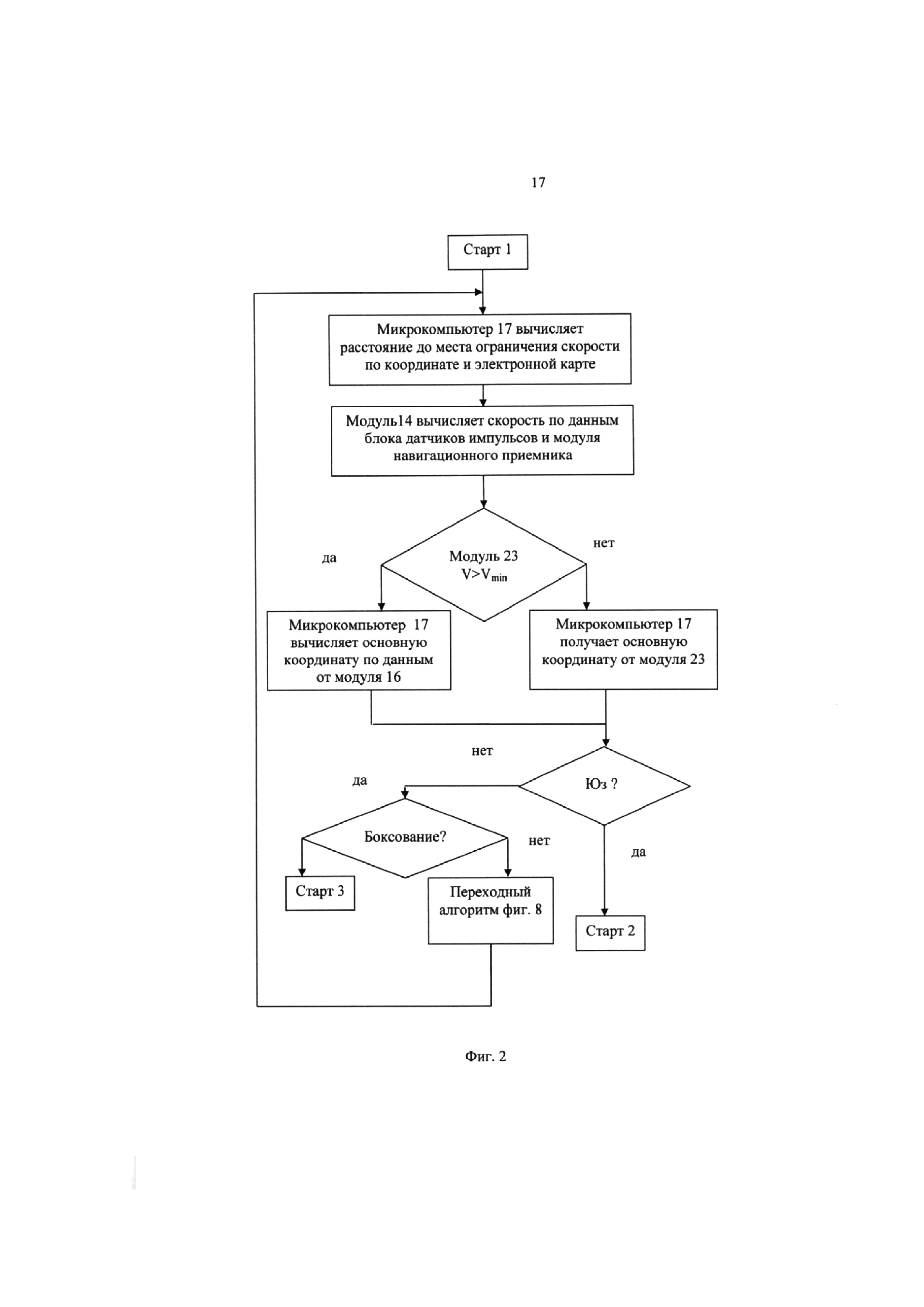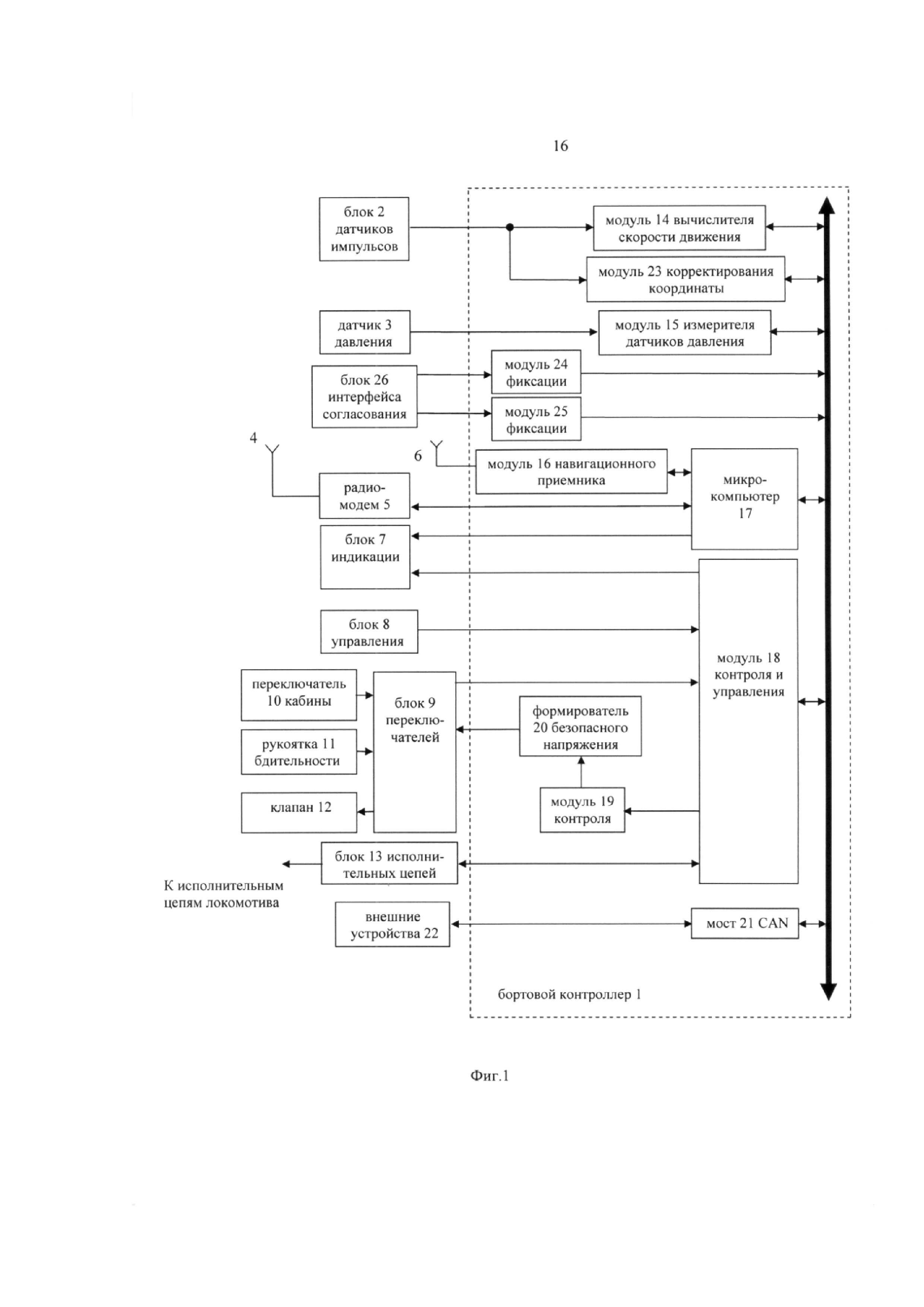Изобретение относится к области железнодорожной автоматики телемеханики и связи и может быть использовано для управления локомотивами. Известна бортовая аппаратура автоматической локомотивной сигнализации, содержащая бортовой контроллер и связанные с ним датчики импульсов локомотивные, датчики давления, спутниковую антенну, антенну радиоканала и радиомодем, блок индикации, блок управления, блок переключателей, который соединен с рукояткой бдительности машиниста, переключателем кабины и электропневматическим клапаном, при этом бортовой контроллер включает в себя вычислитель скорости движения, измеритель датчиков давления, микропроцессор контроля и управления, модуль навигационного приемника, формирователь безопасного напряжения и схему контроля, дополнительно содержит блок исполнительных цепей, вход которого по первой внешней шине CAN подключен к микропроцессору контроля и управления, а выход соединен с силовыми цепями локомотива, при этом в бортовой контроллер дополнительно введен микрокомпьютер, один из входов которого соединен через модуль навигационного приемника со спутниковой антенной, другой - через радиомодем с антенной радиоканала, а третий - с блоком индикации, при этом вычислитель скорости движения, измеритель датчиков давления, микропроцессор контроля и управления и микрокомпьютер соединены общей внутренней шиной CAN, которая изолирована от второй внешней шины CAN мостом-CAN (RU 2341396, B61L 25/04, 20.12.2008). В известном устройстве для определения пройденного пути используется измерение количества импульсов, поступающих от датчиков импульсов, подключенных к колесным парам, а для периодического измерения текущей координаты используется модуль навигационного приемника, соединенный со спутниковой антенной. Определенное значение координаты используется для привязки местоположения локомотива к электронной карте маршрута и для расчета кривой торможения перед местами ограничений скорости. Предпочтительность метода измерения координаты с помощью модуля навигационного приемника связана с тем, что при скорости более 3 км/ч точность этого метода выше, чем точность определения координаты с помощью измерения пройденного пути от датчиков импульсов, подключенных к колесным парам. В процессе измерения пройденного пути по данным от датчиков импульсов, подключенных к колесным парам, накапливается погрешность из-за износа бандажа колесных пар и/или из-за юза и боксования колес, к которым подключены датчики. Однако при движении со скоростью менее 3 км/ч и при отсутствии юза и боксования погрешность измерения координаты с помощью модуля навигационного приемника, составляющая ± 25 м, превышает погрешность определения координаты с помощью датчиков импульсов. Поэтому при движении со скоростью менее 3 км/ч в известном устройстве используют определение координаты с помощью датчиков импульсов. Недостатком известного устройства является снижение точности при сбоях в работе модуля навигационного приемника, при юзе и боксовании колес и при переключениях с одного метода измерения координаты на другой. Во время переключения с одного метода измерения координаты на другой может произойти скачкообразная ошибка в измерении координаты места положения головы поезда, имеющая такую величину, которая приводит к ложной фикс