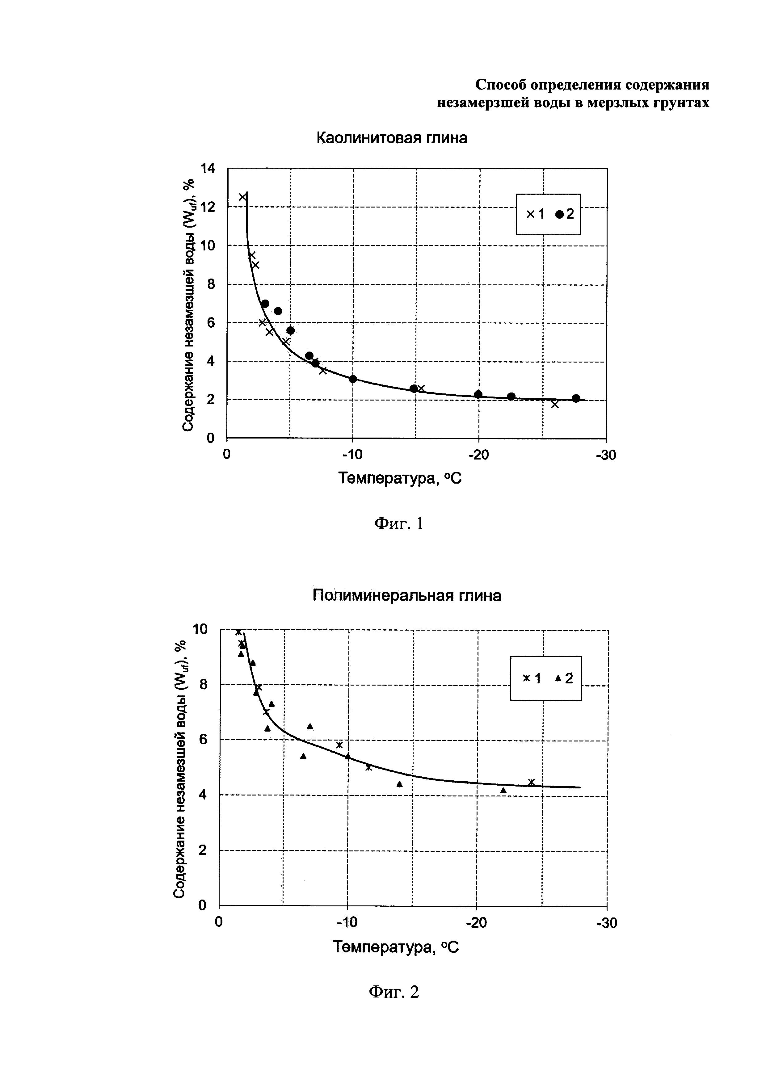 Изобретение относится к геологии и к горным наукам, а именно к геокриологии, и позволяет определять содержание незамерзшей воды в различных минеральных и органогенных мерзлых грунтах, а также в горных породах, содержащих органические (нефть, нефтепродукты и др.) и минеральные загрязнители (соли). Незамерзшая вода в мерзлых породах является существенным фактором, определяющим их физико-химические и механические свойства. Экспериментальные данные о неполном замерзании поровой влаги в мерзлых породах были получены еще в первой половине XX века. К настоящему времени разработан целый ряд экспериментальных методов определения содержания незамерзшей воды в мерзлых породах: калориметрический, ЯМР, диэлектрический, криоскопический, адсорбционный, контактный и др. (Ершов Э.Д., Акимов Ю.П., Чеверев В.Г., Кучуков Э.З. Фазовый состав влаги в мерзлых породах. - М.: МГУ, 1979. 189 с.; Чеверев В.Г. Природа криогенных свойств грунтов. - М.: Научный мир, 2004. 234 с.). Многие из существующих на сегодняшний день методов определения незамерзшей воды отличаются значительной трудоемкостью. Кроме того, имеются проблемы принципиального (теоретического) характера при сопоставлении получаемых разными методами результатов. Это вызывает необходимость совершенствования современных методик, а также разработки более оперативных способов оценки фазового состояния влаги в мерзлых породах, пригодных для проведения массовых измерений. Известен способ определения содержания незамерзшей воды в грунтах по изотермам сорбции-десорбции (В.Г. Чеверев, И.Ю. Видяпин, Р.Г. Мотенко, М.В. Кондаков. Определение содержания незамерзшей воды в грунтах по изотермам сорбции-десорбции. Ж. «Криосфера Земли», 2005, т. IX, №4, с. 29-33). Предварительно образцы грунта для сорбции высушивали, а образцы грунта для десорбции увлажняли до полной влагоемкости. Образцы размещали в объеме, в котором поддерживалось определенное давление паров воды. Масса влагонасыщенных образцов снижалась, масса сухих возрастала. Достижение постоянной массы образцов контролировали периодическим взвешиванием. Влажность образцов определяли в конце опыта методом сушки. Полученные изотермы сорбции-десорбции использовали для последующего пересчета на содержание незамерзшей воды. Известный способ работает при положительной температуре, но является очень медленным, т.к. достижение равновесия (т.е. равновесного содержания влаги в образце при заданной влажности в объеме, где размещали образцы) является длительным процессом и занимает до двух недель. Наиболее близким к предложенному является способ определения содержания незамерзшей воды в мерзлых грунтах по измеренным значениям химического потенциала поровой воды, раскрытый в работе (Истомин В.А., Чувилин Е.М., Махонина Н.А., Буханов Б.А. Определение температурной зависимости содержания незамерзшей воды в грунтах по потенциалу влаги // Криосфера Земли, 2009, №2, с. 35-43) [1], в которой дано подробное изложение термодинамики поровой влаги в пористых средах. В качестве стандартного состояния выбрана объемная фаза воды (переохлажденной воды при отрицательных по Цельсию температурах). Готовили несколько образцов различной влажности путем смешивания со снегом, взвешивали каждый образец три раза: в сухом виде, после насыщения влагой и после окончания эксперимента, измеряли хими