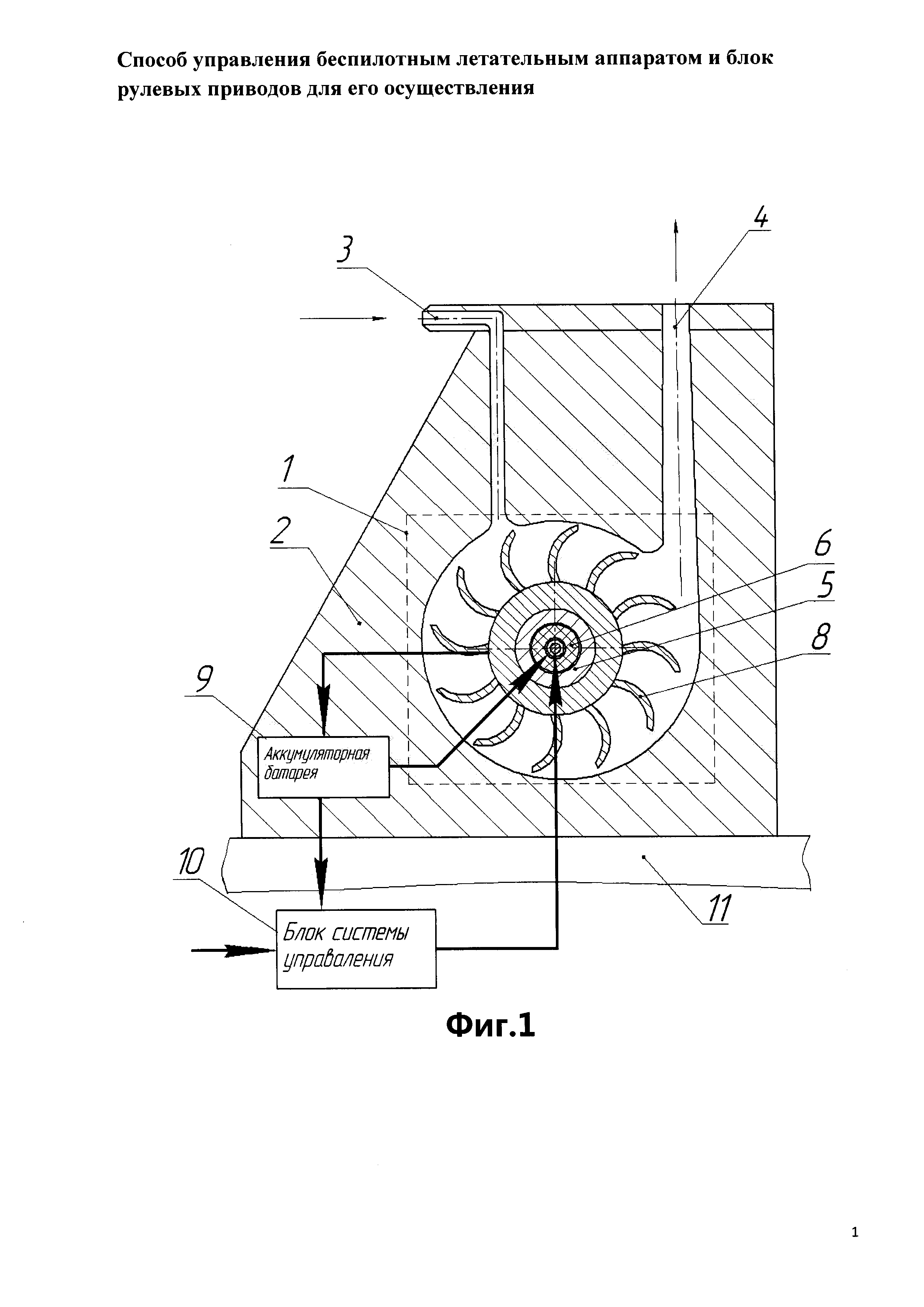 1. Способ управления беспилотным летательным аппаратом (ЛА), включающий: задействование аккумуляторной батареи и блока системы управления, формирование системой управления сигналов управления рулевыми приводами, отбор энергии от набегающего потока воздуха и ее преобразование рулевыми приводами в энергию аэродинамических поверхностей, которые регулируют направление вектора скорости беспилотного ЛА, отличающийся тем, что регулирование направления вектора скорости (подъемной силы) путем изменений лобового сопротивления набегающему потоку и величины вектора тяги струи сброса осуществляется внутри аэродинамических поверхностей изменением кинетической энергии (скорости) набегающего потока, в соответствии с сигналом управления, так, что при положительном сигнале управления энергия потока увеличивается, лобовое сопротивление уменьшается, а величина вектора тяги струи сброса увеличивается, при отрицательном сигнале управления энергия потока уменьшается, лобовое сопротивление увеличивается, а величина вектора тяги струи сброса уменьшается, при отсутствии сигнала управления энергия потока, лобовые сопротивления сброса, создаваемые аэродинамическими поверхностями, и величины векторов тяги струй остаются одинаковыми, при этом, регулирование величин лобовых сопротивлений и векторов тяги струй сброса достигаются рулевыми приводами за счет использования энергии аккумуляторной батареи, подзаряжаемой рулевыми приводами от набегающего потока в полете. 2. Блок рулевых приводов, содержащий корпус, на котором жестко закреплены аэродинамические поверхности с каналами воздухозаборника и сброса воздуха, а внутри каждой аэродинамической поверхности размещен рулевой привод и аккумуляторная батарея, отличающийся тем, что рулевой привод выполнен из блока управления одной или набора рулевых машинок, расположенных последовательно или параллельно, каждая из которых выполнена в виде коаксиально расположенных электродвигателя и турбинки, при этом использован электродвигатель бесколлекторный с наружным ротором, на который насажена турбинка, к которой подведены каналы воздухозаборника и сброса воздуха, в качестве аккумуляторной батареи использована батарея с подзарядкой, клеммы которой через блок системы управления соединены с обмоткой электродвигателя, при использовании одной или несколько последовательно расположенных рулевых машинок, канал воздухозаборника и сброса воздуха выполнен в виде плоской щели внутри аэродинамической поверхности. 3. Блок рулевых приводов, отличающийся по п. 2 тем, что между наружным диаметром ротора и внутренним диаметром турбинки введен редуктор-мультипликатор, построенный на основе волновой передачи с телами качения по схеме с внешним волнообразователем, по которой жесткое колесо закреплено на роторе, сепаратор закреплен на статоре, а на наружный диаметр волнообразователя насажена турбинка. 4. Блок рулевых приводов, отличающийся по пп. 2, 3 тем, что при использовании двух рулевых машинок, расположенных параллельно, каналы воздухозаборника и сброса воздуха выполнены в виде щелей, образованных плоскостями аэродинамической поверхности и кожухами, расположенными параллельно плоскостям аэродинамической поверхности.