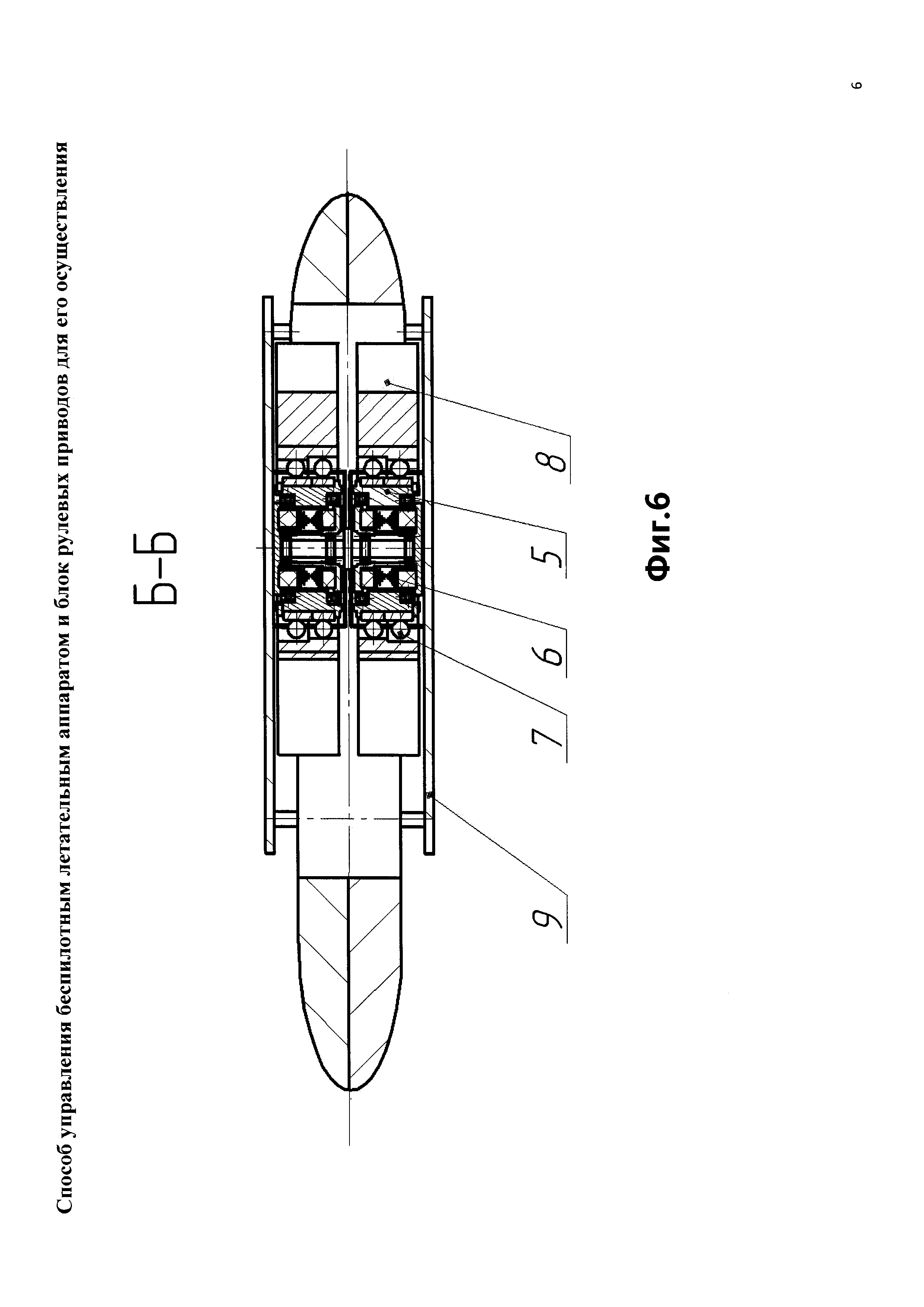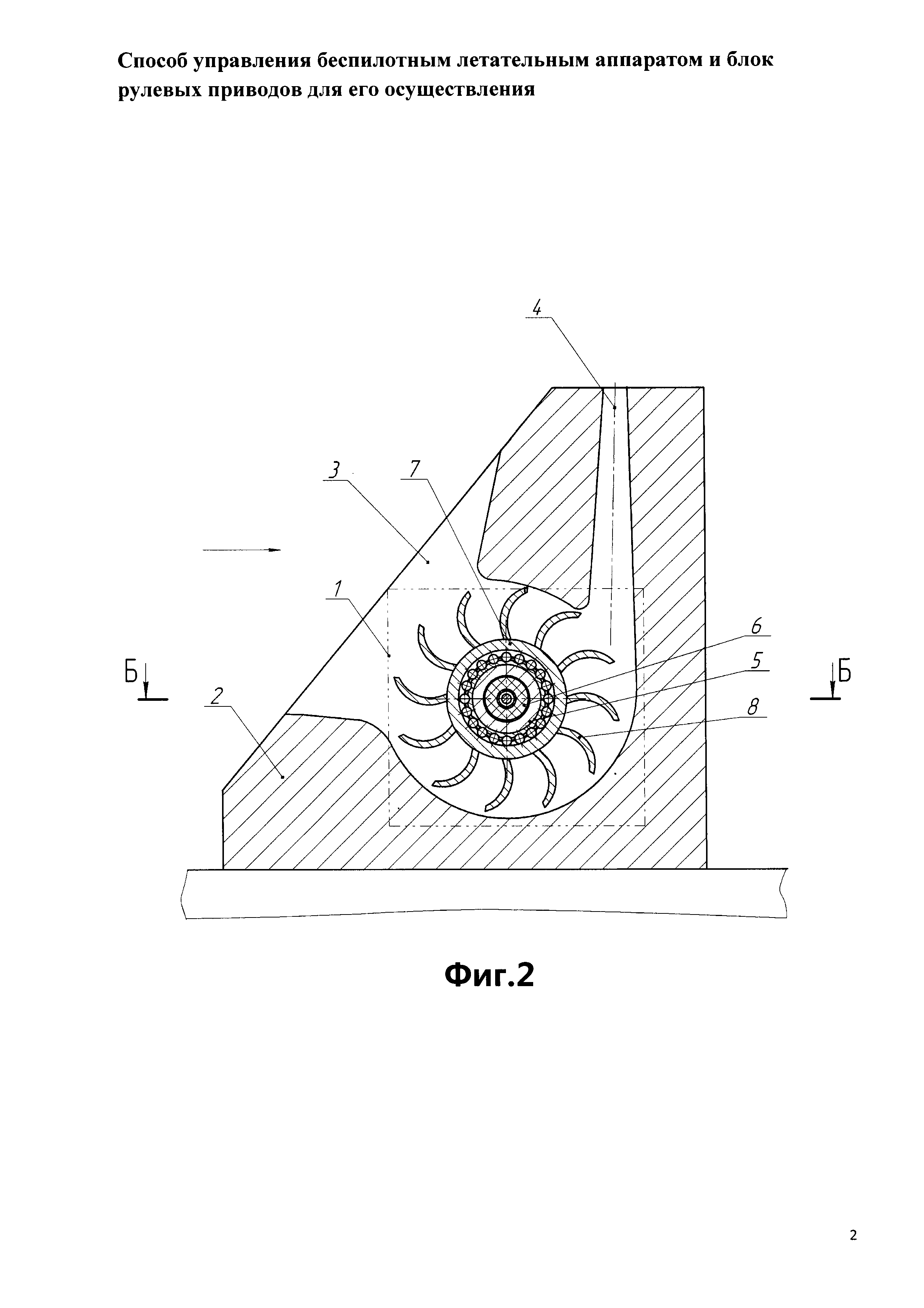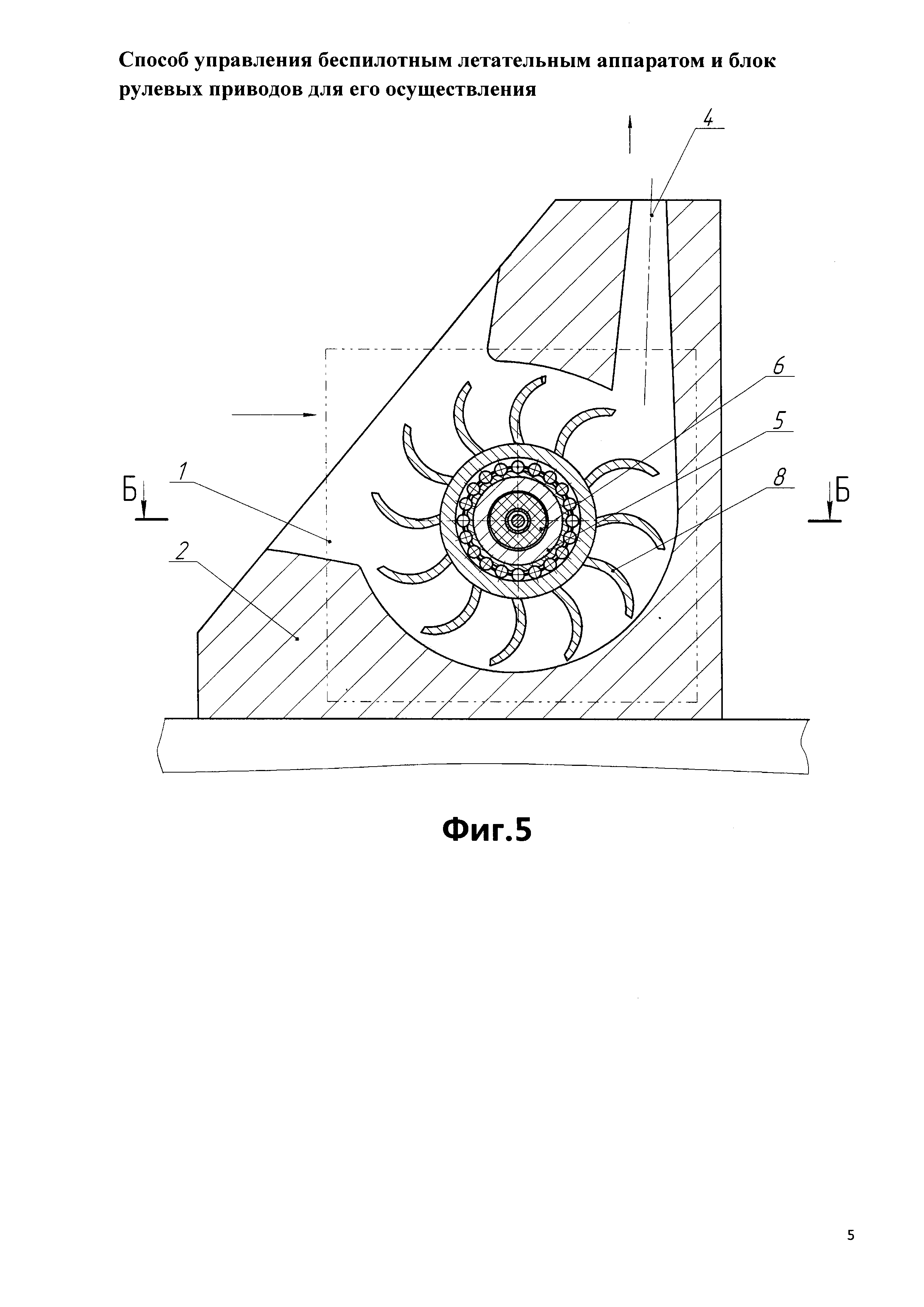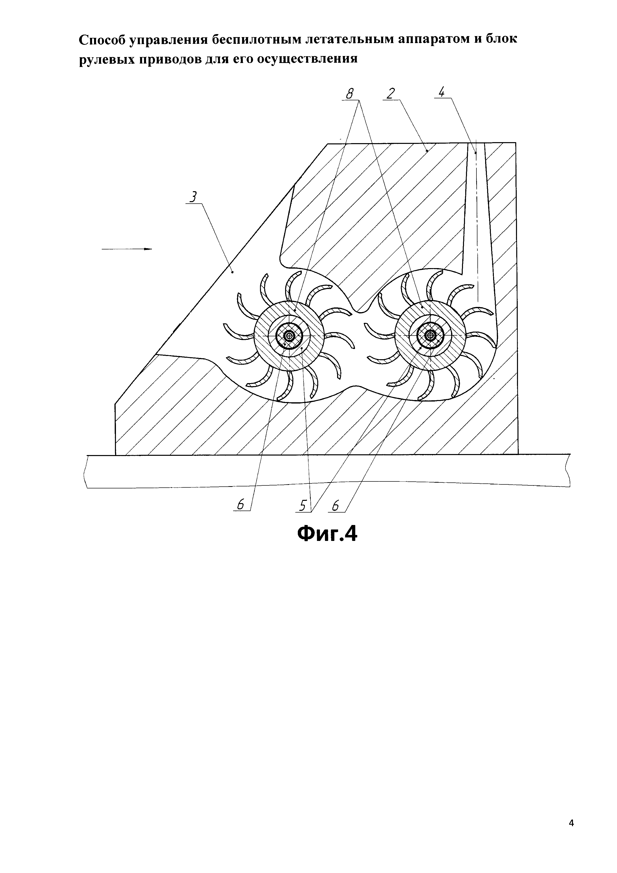 Предлагаемые изобретения относятся к авиационной технике и могут быть использованы в управляемых ракетах, снарядах, бомбах и других беспилотных летательных аппаратах ЛА. Известен способ управления беспилотными ЛА, получивший название аэродинамического, в котором регулирование вектора скорости (подъемной силы) осуществляется изменением углового положения рулевых аэродинамических поверхностей, изменяющих лобовое сопротивление набегающему потоку и создающих крутящий момент относительно центра массы, при этом изменение углового положения аэродинамических поверхностей осуществляется рулевыми машинками рулевых приводов по сигналам управления и за счет потребления энергии от силового источника энергии [1]. В способах управления, принятых за аналоги, используются электрические, гидравлические или пневматические рулевые приводы и автономные источники энергии (аккумуляторные батареи, баллоны сжатого газа). Недостатком способов аналогов является ограниченность времени их работы по управлению полетом, обусловленная конкретным запасом энергии силового источника рулевых приводов. Наиболее близким к заявляемому способу управления полетом (принятым за прототип) является способ управления, в котором в отличие от аналогов для управления приводами в качестве силового источника энергии используется энергия набегающего потока воздуха ([2] рис. 8, 10 стр. 140; [3]). В способе управления полетом беспилотного ЛА, принятом за прототип, набегающий поток, попадающий в воздухозаборники, перераспределяется с помощью согнала управления в рабочие полости рулевых машинок, в которых потенциальная энергия набегающего потока преобразуется в механическую энергию поворота рулевых аэродинамических поверхностей. В существующих рулевых машинках используемая потенциальная энергия набегающего потока определяется давлением тормозящего потока, зависящего от скорости полета и плотности воздуха: Епот=Fh=pSh; где Епот - используемая потенциальная энергия потока, F – сила, действующая на поршень рулевой машинки, h - ход поршневой рулевой машинки, S - площадь поршня, р - давление торможения набегающего потока, ρ - плотность воздуха, ϕ - коэффициент, характеризующий воздухозаборник, V0 - скорость потока, равная скорости беспилотного ЛА. Недостаток указанного способа управления заключается в ограниченности применения из-за невозможности функционирования на малых скоростях полета и на высотах с малой плотностью воздуха. Кроме того, использование для работы рулевых приводов давления торможения набегающего потока не позволяет эффективно использовать имеющуюся энергию потока. В качестве прототипа блока рулевых приводов по совокупности существенных принципов и достигаемому эффекту выбран «Хвостовой отсек воздушно-динамических рулевых приводов» (Патент RU 2418261 [3]), содержащий корпус блока с рулевыми аэродинамическими поверхностями, внутри каждой из которых имеются каналы воздухозаборника и сброса воздуха и рулевой привод, состоящий из блока управления, рулевой поршневой машинки и маломощного источника питания в виде аккумуляторной батареи, которая может быть использована только для блока управления рулевых приводов или являться составной частью системы управления. В последнем случае она располагается в корпусе блока вне аэродинамической повер