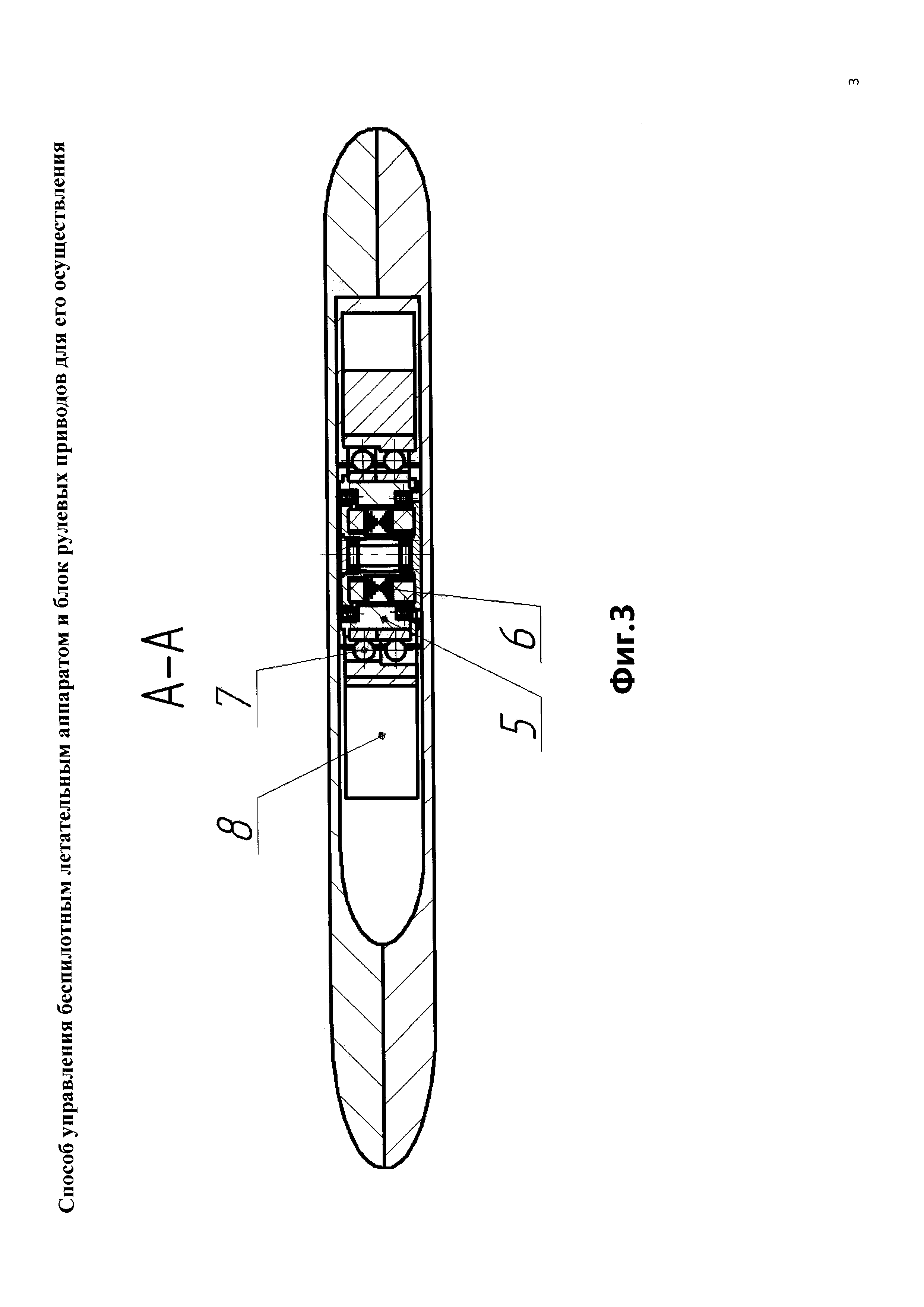 Изобретения относятся к области авиационной техники и могут быть использованы в управляемых ракетах, снарядах и бомбах и других беспилотных летательных аппаратах (ЛА). Способ управления беспилотным ЛА осуществляется регулированием направления вектора скорости путем изменений лобового сопротивления набегающему потоку и величины вектора тяги струи сброса за счет изменения кинетической энергии набегающего потока внутри аэродинамических поверхностей, в соответствии с сигналом управления. Устройство блока рулевых приводов состоит из корпуса с жестко закрепленными аэродинамическими поверхностями с каналами воздухозаборника и сброса воздуха. Внутри каждой аэродинамической поверхности размещен рулевой привод и аккумуляторная батарея. Рулевой привод выполнен из блока управления рулевых машинок, которые выполнены в виде коаксиально расположенных электродвигателя и турбинки. Электродвигатель использован бесколлекторный с наружным ротором, на который насажена турбинка. В качестве аккумуляторной батареи использована батарея с подзарядкой. Технический результат заключается в расширении функциональных возможностях применения беспилотных ЛА на малых скоростях и больших высотах, а устройство блока рулевых приводов позволяет упростить изготовление. 2 н. и 2 з.п. ф-лы, 6 ил.