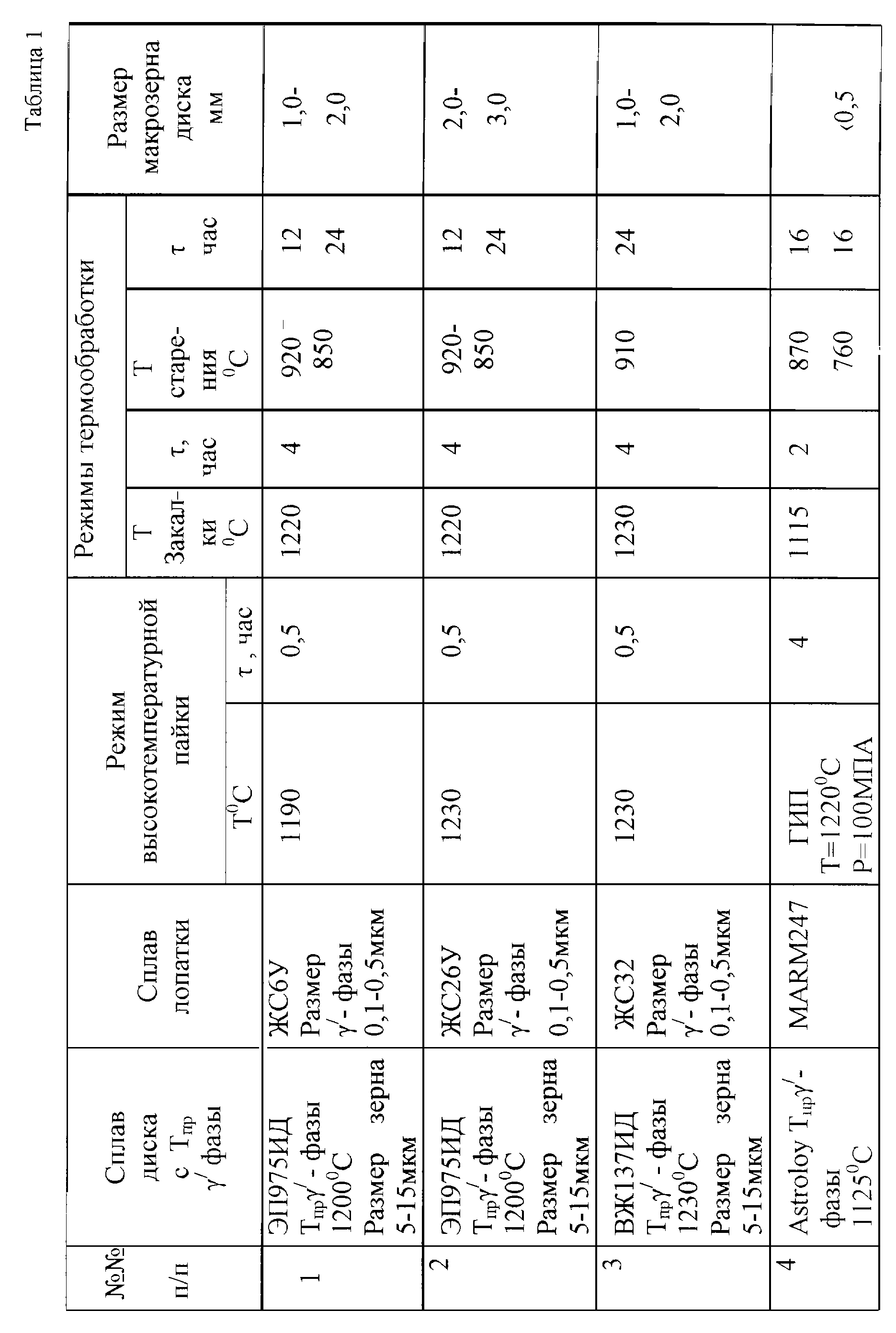 выплавки с последующим вакуумно-дуговым переплавом (ИД) и деформацией слитка. Режим старения диска: В таблице 1 представлены режимы пайки и термообработки предлагаемого ротора (примеры 1-3) и ротора, получаемого по способу-прототипу (пример 4). Свойства