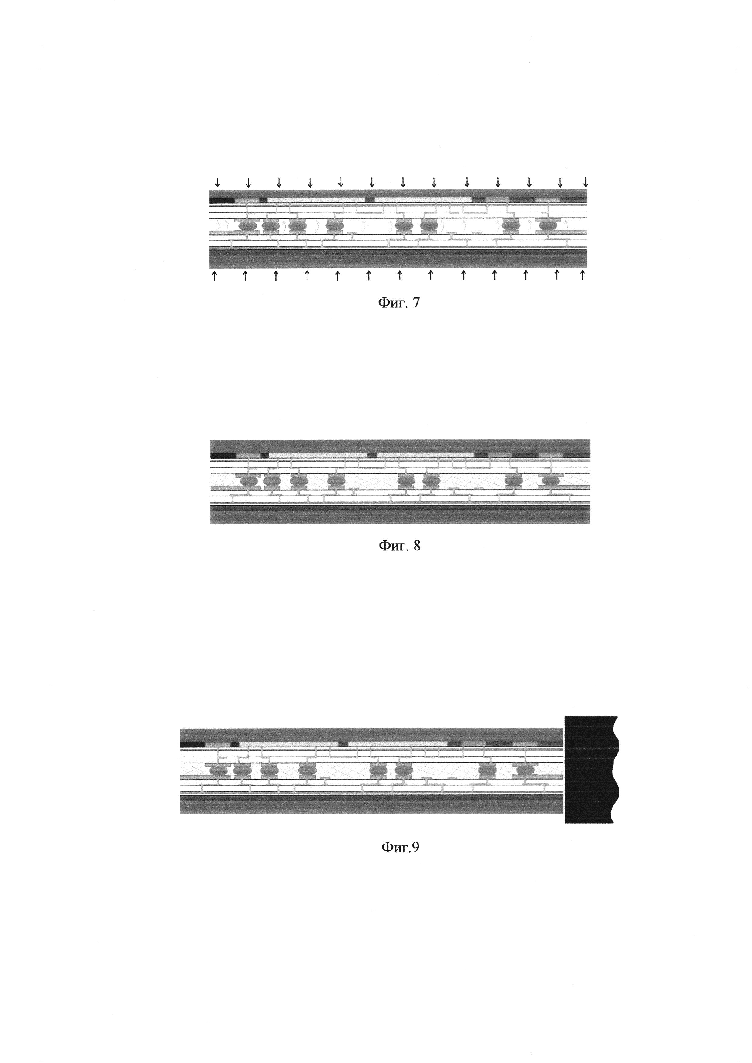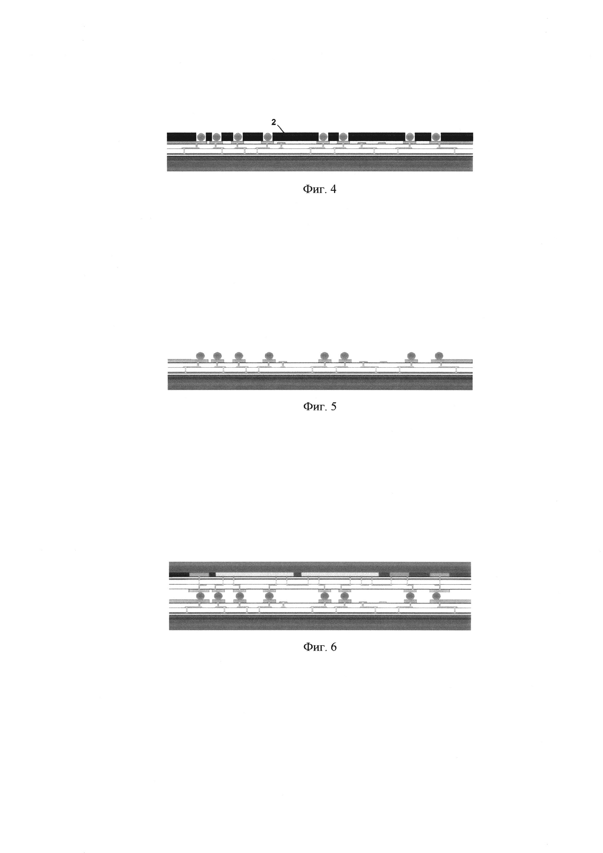 Изобретение относится к радиоэлектронике. В нем предлагается новый способ изготовления трехмерного электронного модуля. Рассмотрим известные способы изготовления трехмерного электронного модуля. Трехмерный электронный модуль собирают, размещая электронные компоненты и микроплаты, имеющие контактные площадки на торцевых поверхностях, параллельно друг другу, электрически соединяют их по боковым поверхностям модуля, осуществляют контроль и герметизацию. В "качестве исходных применены гарантированно годные компоненты, с помощью их и микроплат формируют пространственно ориентированные контактные площадки для создания непрерывной линии конструкции модуля, дозированно наносят склеивающий теплопроводный электроизоляционный состав на торцы микроплат, обеспечивая при этом монолитность и непрерывность клеевого шва, совмещают по контактным площадкам электронные компоненты и соединяют их, полимеризируют склеивающий состав, очищают контактные площадки электронных компонентов и микроплат от пленки склеивающего состава, напыляют на гранях склеенного трехмерного электронного модуля проводники, обеспечивающие необходимые соединения между электронными компонентами и микроплатами по их контактным площадкам; наращивают проводники, расположенные на гранях трехмерного электронного модуля" (RU 2492549 С1). Здесь необходимые соединения между электронными компонентами осуществляют путем наращивания проводников, расположенных на гранях, что является крайне нетехнологичным решением, особенно для серийного производства, так как любая работа с гранями (напыление, наращивание и пр.) подразумевает точное позиционирование модуля в пространстве (например, в установке напыления) с помощью специальной оснастки. В способе изготовления трехмерного электронного модуля, известном из RU 2475885 С1, в подложке-основании, на которую монтируют бескорпусные кристаллы, предварительно вырезают отверстия ("окна микроплаты"), что удорожает изделие и ослабляет конструкцию модуля с точки зрения вибропрочности и ударопрочности. В способе по RU 2193260 С1 "бескорпусные компоненты размещают в окнах групповой керамической заготовки с ориентацией по контуру и с соблюдением единой плоскости расположения активных зон компонентов и лицевой поверхности заготовки. Компоненты фиксируют в таком положении и изолируют электрически незащищенные зоны компонентов по их лицевой стороне. Далее наносят преимущественно методом вакуумного напыления проводники на лицевую и обратную стороны заготовки и компонентов, одновременно формируя разъем и соединительные проводники, необходимые для электротермотренировки и контроля. Годные микроплаты вырезают из групповой заготовки и собирают в пакет, соединяя их между собой капиллярной пайкой. К одной из граней пакета припаивают теплорастекатель с внешними выводами и герметизируют изготовленный модуль". Этот способ имеет все недостатки двух предыдущих. Предлагаемое изобретение имеет следующие свойства: - обеспечение высокой плотности упаковки радиоэлектронных компонентов за счет многослойности структуры и применения некорпусированных компонентов-кристаллов; - увеличение площади теплоотвода за счет теплоотводящих подложек (оснований) с обеих сторон модуля; - увеличение механической прочности модуля за счет его к