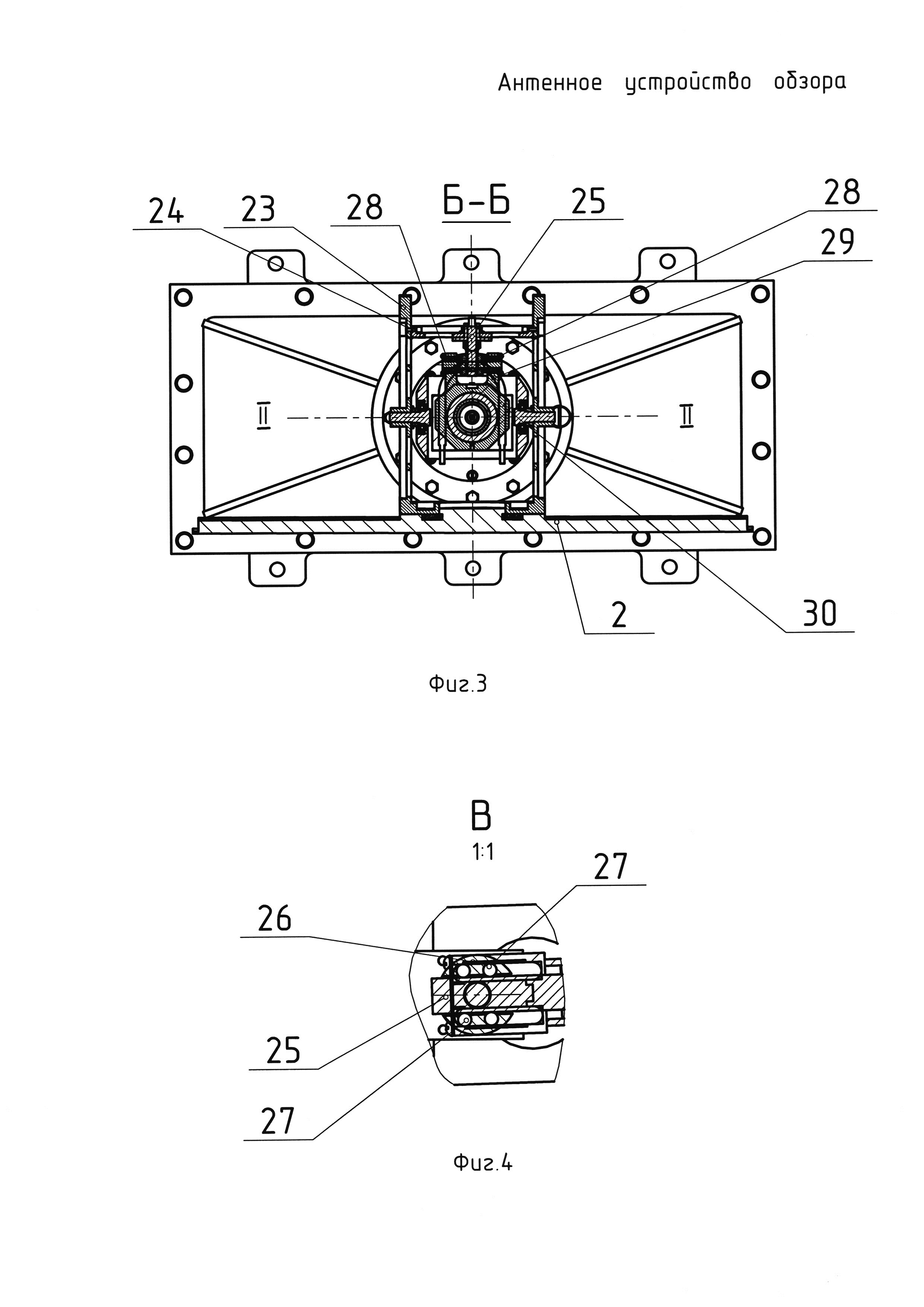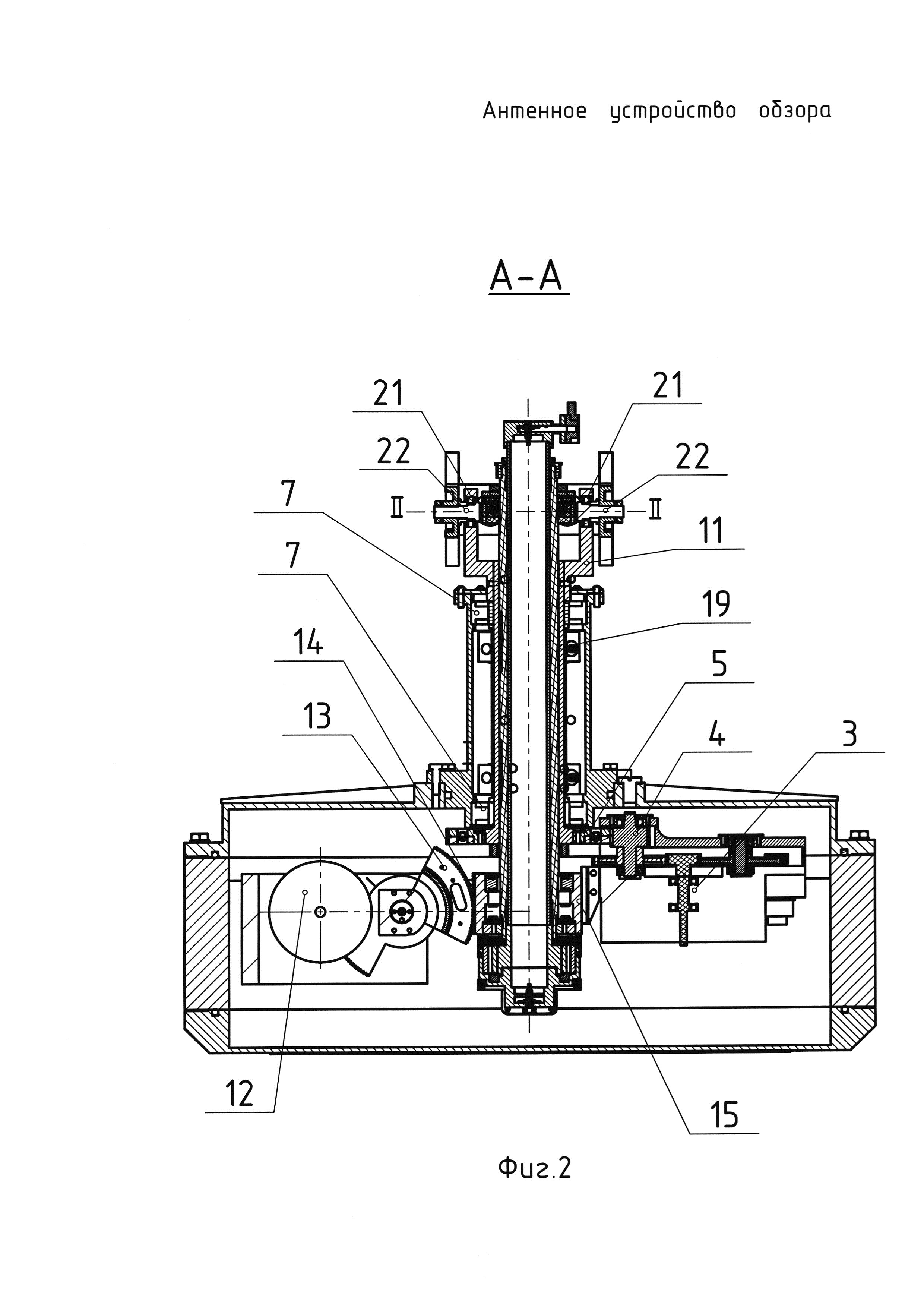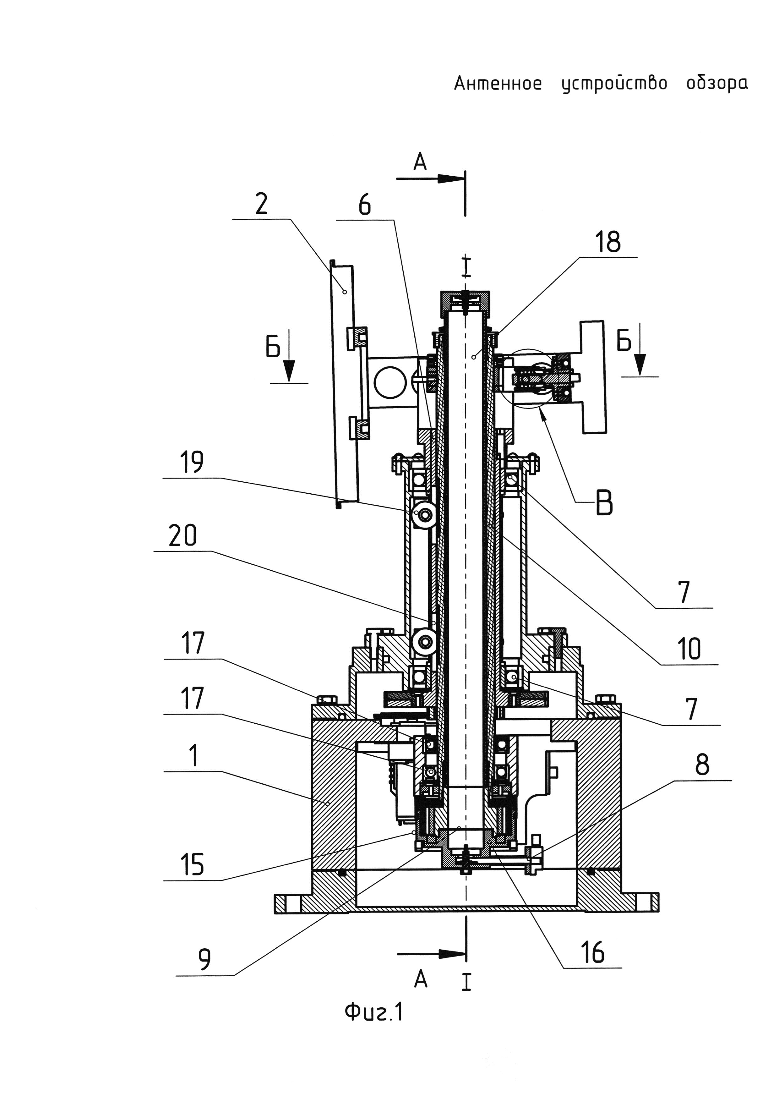 Антенное устройство обзора, содержащее основание, зеркало, блок управления, блок антенный, включающий в себя расположенный на основании привод вращения зеркала по азимуту, выходная шестерня которого кинематически связана с зубчатым колесом, установленным на трубе, закрепленной в подшипниках основания, и расположенным соосно оси вращения зеркала по азимуту, привод наклона зеркала с выходной шестерней и вращающийся переход (вращпереход), состоящий из волновода и сверхвысокочастотного тракта, отличающееся тем, что в верхней части трубы неподвижно закреплена вилка, внутри трубы установлен корпус со встроенным в него волноводом, являющимся вращающейся частью бесконтактного сверхвысокочастотного перехода, неподвижная часть которого закреплена внутри втулки, на внешней стороне которой вдоль оси втулки расположена зубчатая рейка, кинематически связанная с выходной шестерней размещенного на основании привода наклона зеркала, во внутренней части втулки закреплены подшипники, внутренние подвижные кольца которых установлены на нижней части корпуса, центрирование по окружности верхней части корпуса осуществляется подшипниками, установленными в сквозных пазах, расположенных по окружности трубы вдоль ее оси вращения, и в совпадающих с ними пазах на наружной части корпуса, боковые поверхности подшипников касаются боковых поверхностей пазов трубы и, соответственно, боковых поверхностей пазов корпуса, внешние же кольца этих подшипников обкатывают, соответственно, внутренние поверхности пазов корпуса в том же направлении, при этом в соосно расположенных отверстиях боковых частей вилки, в подшипниках, установлены валы с закрепленным на них кронштейном, ось наклона которого перпендикулярна оси вращения зеркала по азимуту, на одном конце кронштейна установлено зеркало, а на противоположном конце размещен противовес, выполненный в виде планки с центральным отверстием, в котором закреплен стержень, консольная часть стержня вставлена в отверстие муфты с роликами, расположенными симметрично относительно стержня в вертикальной плоскости, а в горизонтальной плоскости муфта закреплена с двух сторон симметрично относительно стержня в подшипниках, установленных на скобе держателя, неподвижно закрепленного на верхней части корпуса.