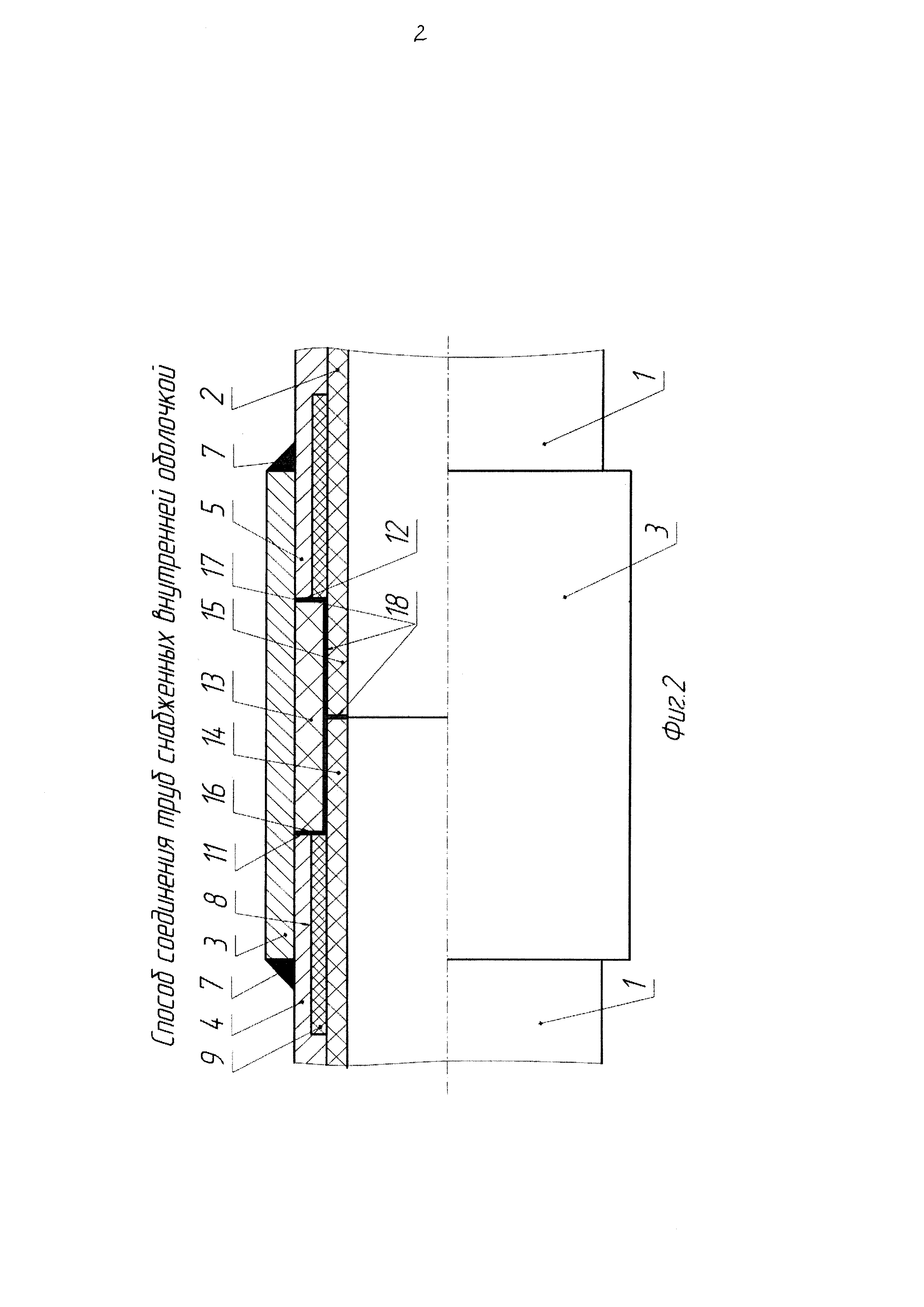 Изобретение относится к технологии соединения труб с внутренним покрытием. Способ соединения труб, снабженных внутренней оболочкой, с привариваемым наружным стаканом включает размещение на концах труб на длину зоны активного термического влияния сварки между внутренней поверхностью трубы и внутренней оболочкой термоизоляционного материала, стыковку внутренних оболочек, концы которых выступают за концы труб на длину, достаточную для герметичного соединения внутренних оболочек, с последующим их герметичным соединением свариванием, размещение над местом соединения труб стакана с последующим присоединением его концов к трубам сваркой. Внутреннее пространство между торцами труб, стаканом и внутренней оболочкой заполняют материалом, обладающим адгезией как к материалу трубы и стакана, так и к материалу внутренней оболочки. Материал для заполнения пространства между торцами изготавливают из термопластичного материала в виде патрубка длиной, меньшей суммарной длины соединяемых выступающих концов внутренней оболочки на величину, необходимую на сжатие этих концов при сварке. Патрубок размещают над выступающими концами внутренних оболочек перед свариванием торцов внутренних оболочек, которое производят нагревом концов внутренних оболочек и патрубка с одновременным продольным сжатием труб до взаимодействия их торцов с торцами патрубка. Изобретение обеспечивает достаточную надежность и долговечность соединения внутренней оболочки за счет увеличения площади сварного соединения как по внутренней оболочке, так и по торцам трубы, что предохраняет трубы от отслоения внутренней оболочки в районах стыков и приводит к значительному увеличению межремонтного периода. 2 ил.